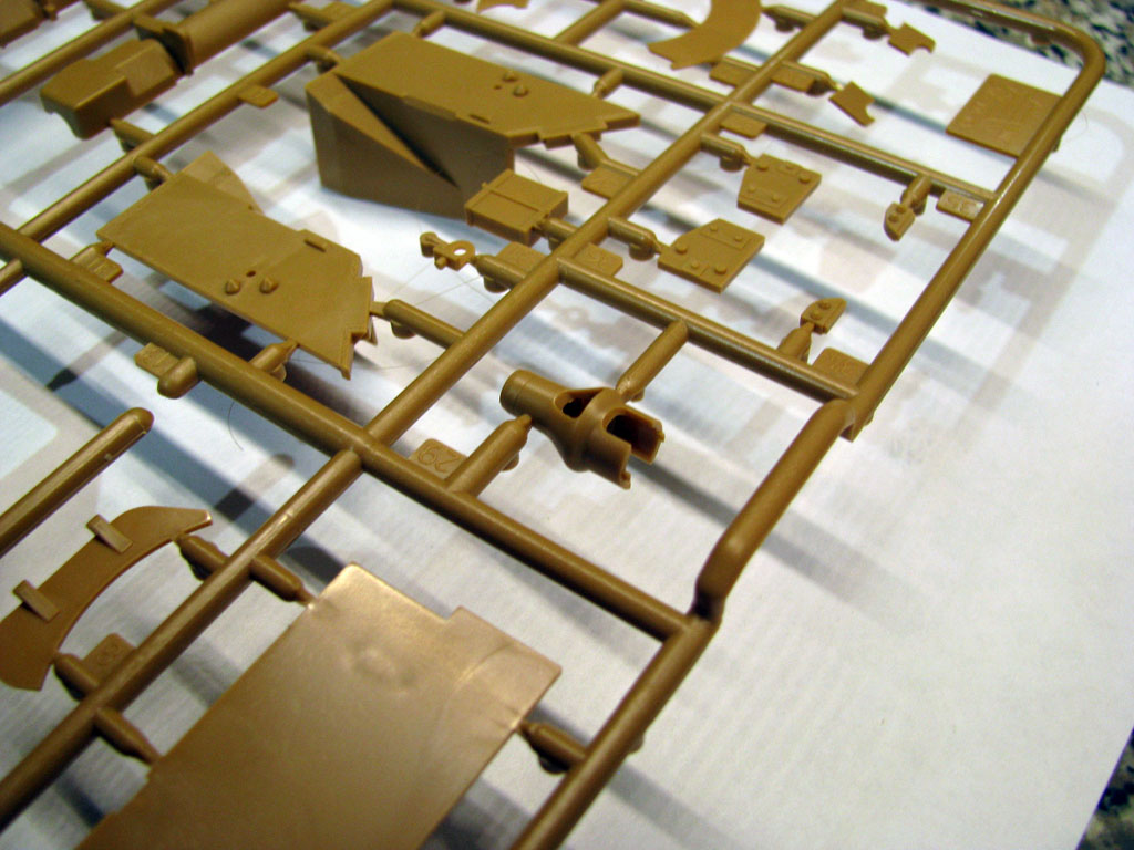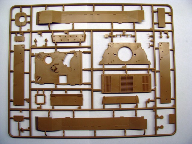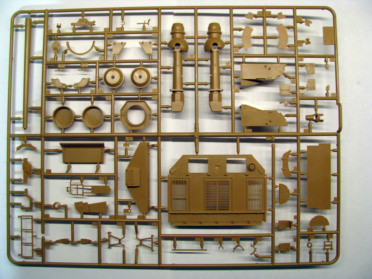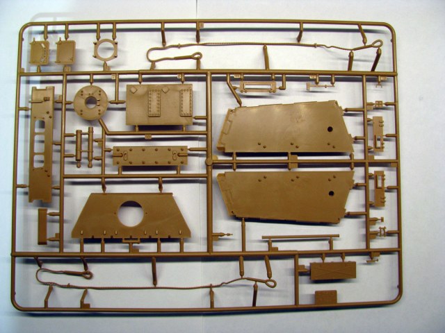 Коробка традиционная для "новой" Звезды - суперобложка+коробка из твердого картона. Внутри лежит 9 литников песочного цвета, ванна корпуса отдельной отливкой, прозрачный литник с перископами, декаль и кусочек синтетической сетки. Пластик такой же как на Пантере Д - то есть нереально мягкий и нежный.