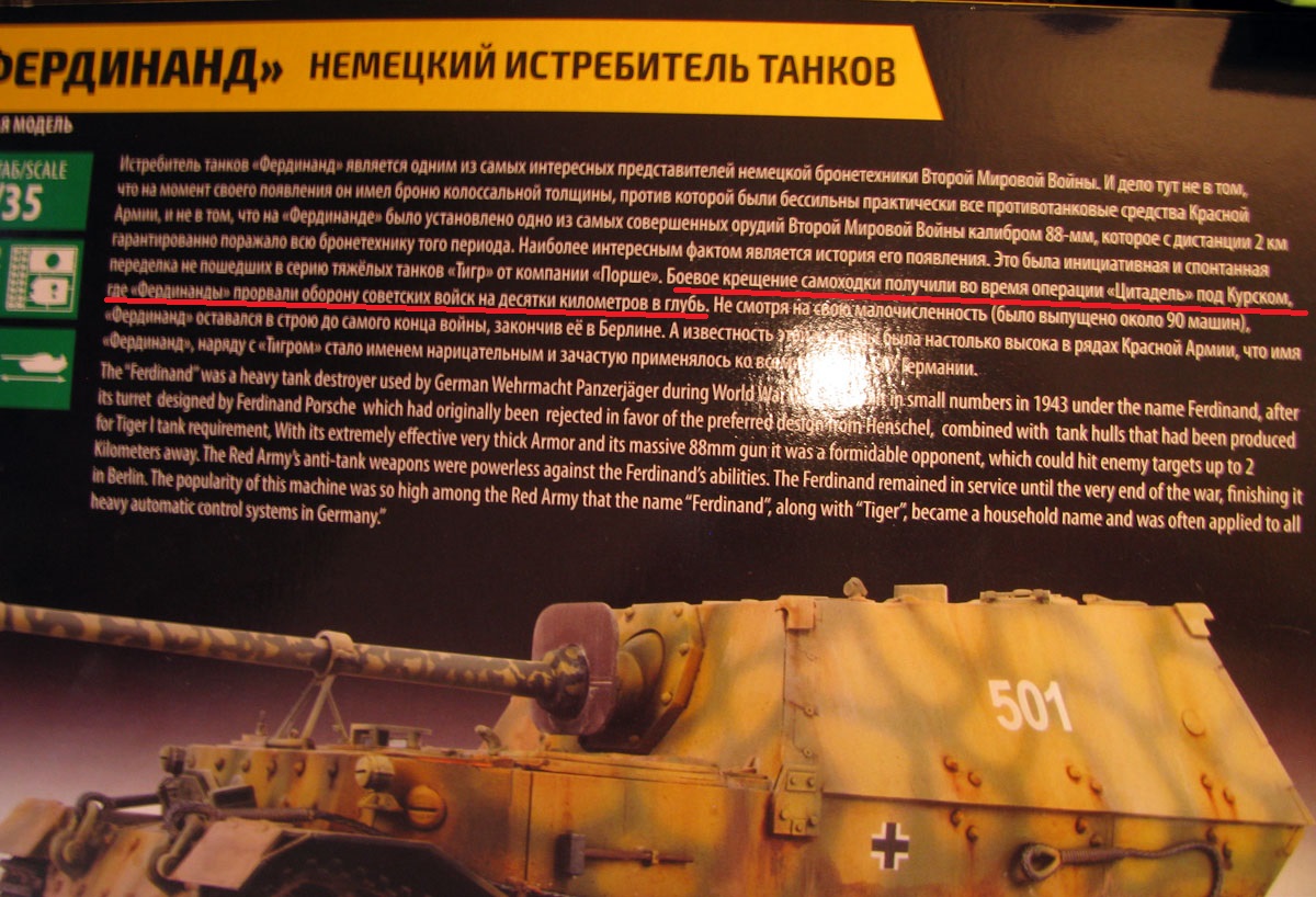 В завершение хотелось бы добавить ложку дегтя. Находится эта ложка на оборотной стороне коробки, где дана историческая справка. Нужные строки я подчеркнул красной линией. Хотелось бы узнать у составителей текста, где и когда Фердинанды прорвали нашу оборону "на десятки километров".
