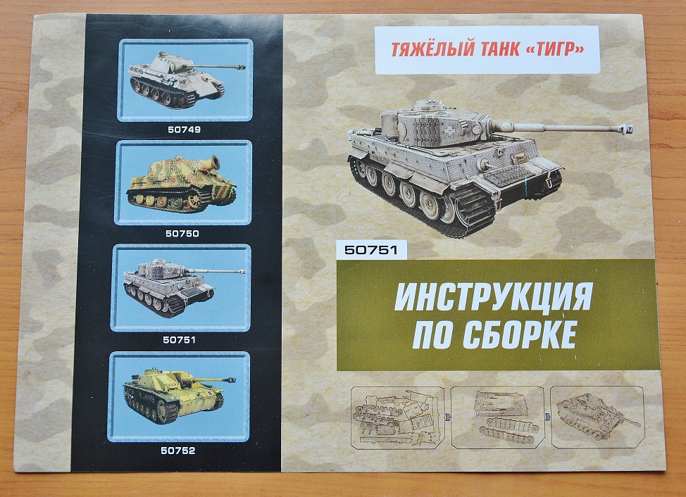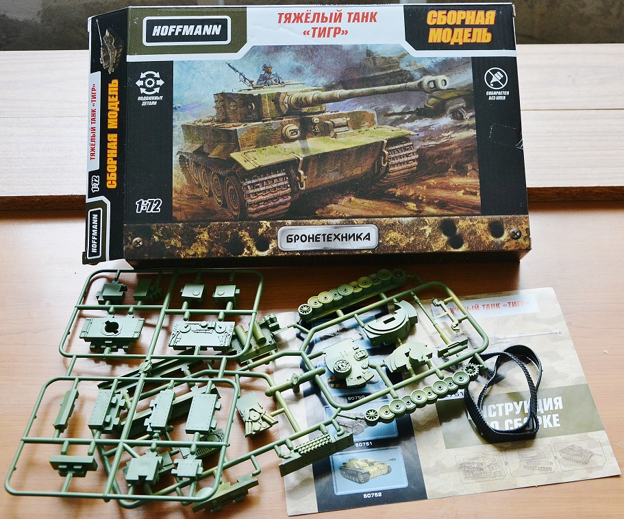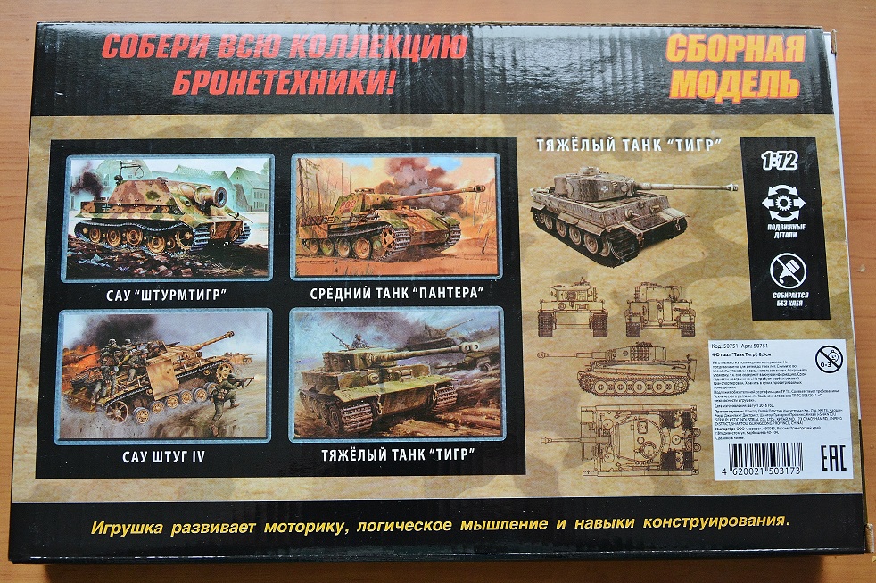 Коробка – Очень объемная и вместительная для небольших, по сути, отливок. Очень твердый, прочный гофрокартон. Боковое открытие. Знатная коробка! Хрен сломаешь. Литники болтаются в ней в свободном полете, (нет даже никакого пакетика), так что «модель» в упаковке – хорошая, мощная погремушка. Оформление аляповатое и броское, «детское». Мощный, брутальный бокс-арт с изображением Тигра в циммерите. Тут надо сказать сразу – Изображение совершенно ни как не соответствует содержимому! По идее, по потребительским законодательствам, китайцы должны писать как на пачке «Доширака», что ни будь типа «Вариант сервировки», «Способ подачи». А то ведь какой ни будь тугодумный и капризный малыш устроит истерику папе – мол, мой танк совсем не такой как нарисован! А папа окажется ушлым буквоедом и подаст на производителя в суд… Хотя… Какое дело китайцам до законодательств.