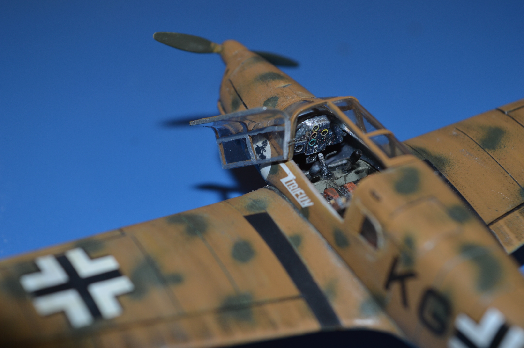 Помимо всего заново нарезал расшивку крыла и фюзеляжа, а также клепку. Доработка коснулась в основном кабины, а именно приборная панель, входящая в комплект показалась скучной и примитивной, в этих целях из различных остатков травления воссоздал прибрку, также доработал рычаги, педали, ремни на креслах сделаны нарезанных полосок металла мембраны кофе "Нескафе". Фонарь использовал, входящий в комплект, но пришлось его распилить, в целях демонстрации полученной доработки кабины. Купал фонарь в глянцевом лаке от тамии Х-22, после 2-х суточной сушки в принципе результатом доволен. Также доработал ручки сверху фюзеляжа, которые разработчиком не предусмотрены, их я сделал из кусочка проволоки. Помимо всего прочего были рассверлены патрубки и вставлена часть двигателя. При покраске использовались акриловые краски от тамии и ганзы, смывка также от тамии, применялся также метод масляных точек, но особого результата я не достиг и в конце все задул матовым лаком от миг. Приятного просмотра, спасибо за внимание!
