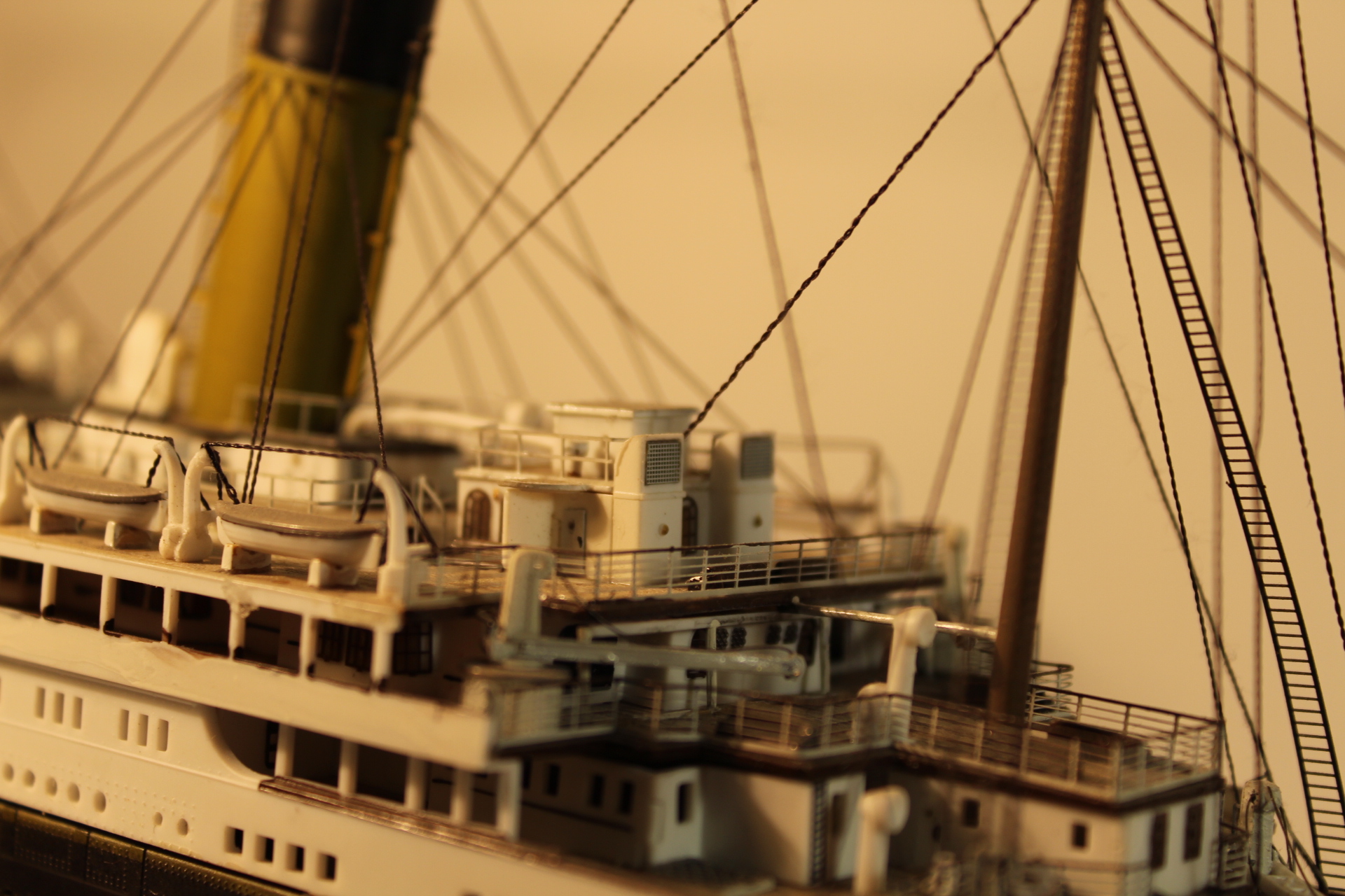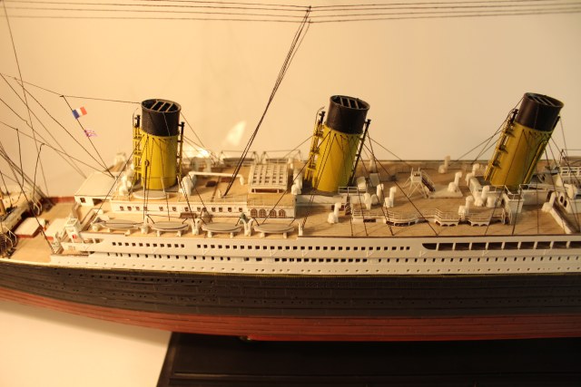 Всем доброго вечера товарищи моделисты .Собирал данный корабль давно , после покупки набора пол года ждал когда появится в наличии набор фототравления от эдуарда , случайно зашел на сайт обнаружил что набор остался один в наличии ,заказал пока фототравления шло , изучал фотографии Титаника и Олимпика просмотрев тонну фотографий облазив многие судомодельные форумы и поспорив с умниками теории что на дне лежит Олимпик ,занялся стройкой строил около года , покрасил переплеты куполов на парадной лестнице 1го класса , заменил надстройку на баке и полуюте , покрасил прогулочные палубы кают люкс класса , досверлил иллюминаторы на корме так как завод изготовитель поленился их отметить ,фотографии процесса строительства были сняты на обычный фотоаппарат ,само судно переснимал зеркалкой (я ею идеально не овладел еще так что готовлюсь к кирпичам в мою сторону).