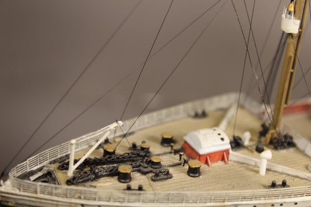 Красил красками Mr.Hobby,фототравление Эдуард , мелкие деталь картон,проволока ,дощечки от мороженного , немного прошелся маслом , изготовил имитацию паровых свистков на трубах , добавил элементы якорного устройства ,заменил что то похожее на цепи цепями из металла , изготовил ,,правильный,, люк грузового трюма №1 на баке ,рассверлил носовой клюз на носу и на корме добавил окантовку палубы С ,углубил ложе под запасной якорь ,рассверлил ветилиционные раструбы ,перенес на свое место флагшток .