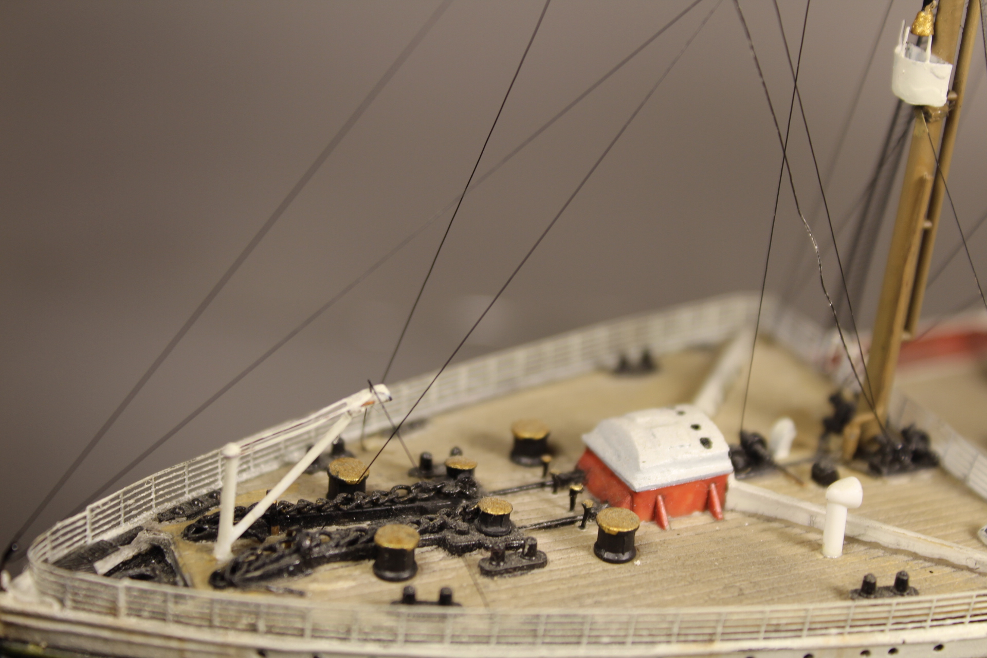 Приветствую автора! Работа проделана огромная (знаю т.к сам закончил сей проект пару дней назад). Такелаж развитый, но нить не подходящая. Я на своей модели использовал мононить. Доработки отлично смотрятся (я не решился на них). Ванты кормовой мачты немного винтом у вас пошли. Там есть дефект от производителя (ванты упираются в поручни трапов) я кормовые трапы зауживал, чтоб ванты были более менее прямые. И ещё немного не понял про флаги на мостике? Там ведь на сколько я знаю поднимался лоцманский флаг, а у вас там приветственные. Если не прав то поправите меня т.к могу ошибиться.