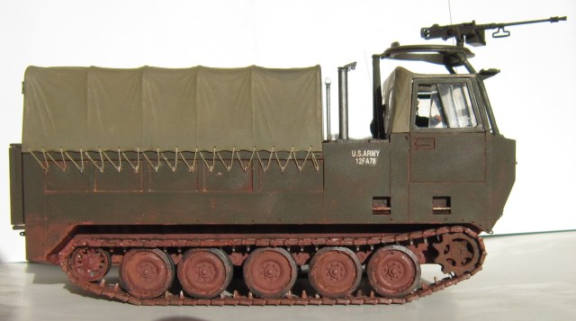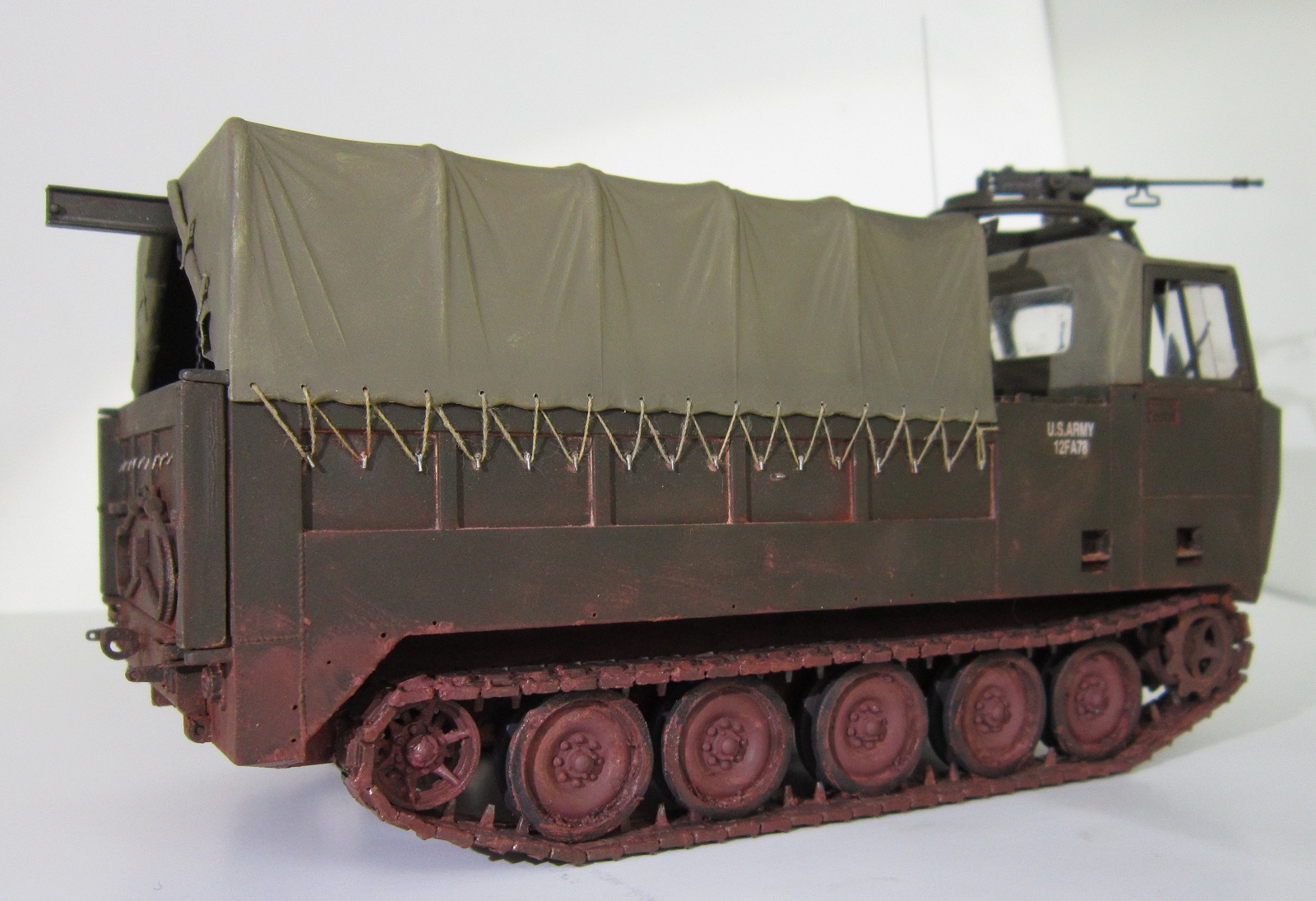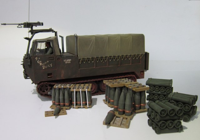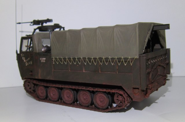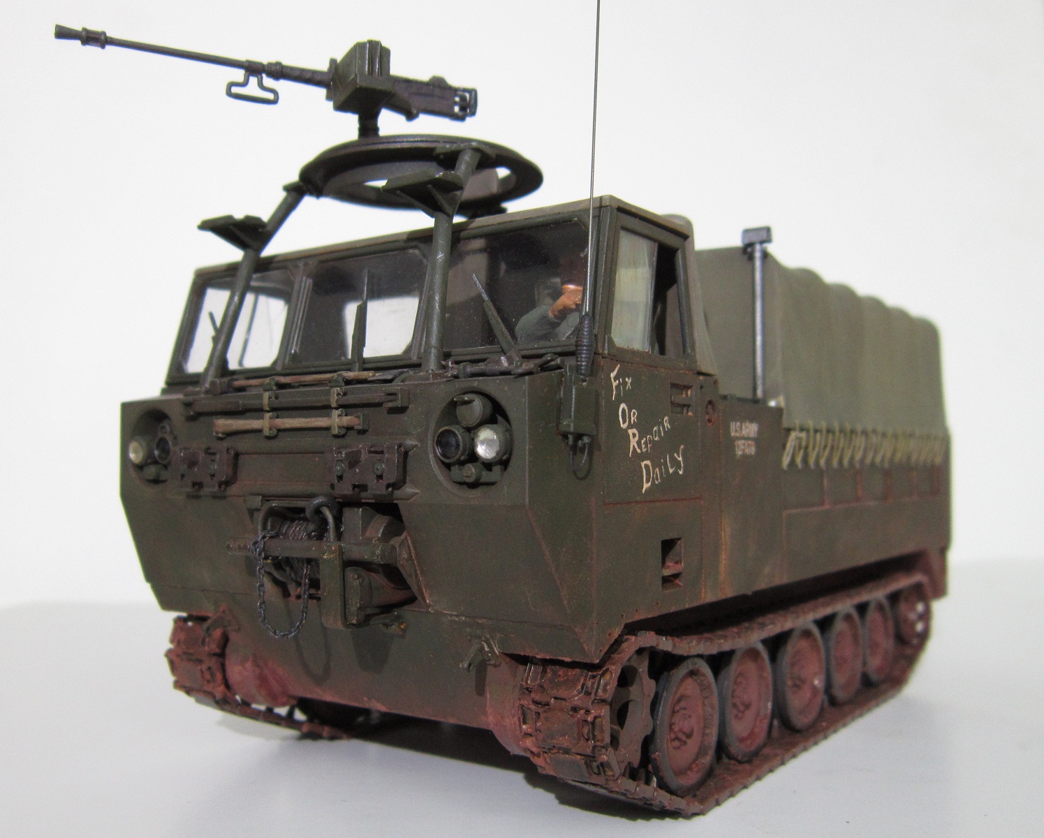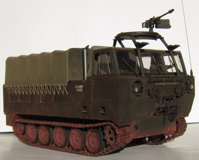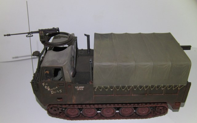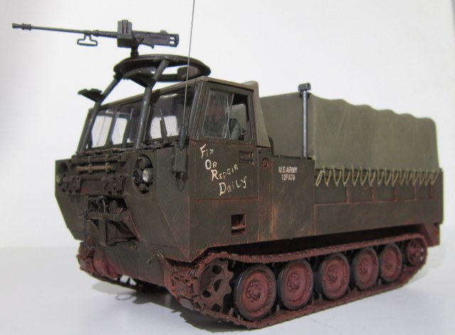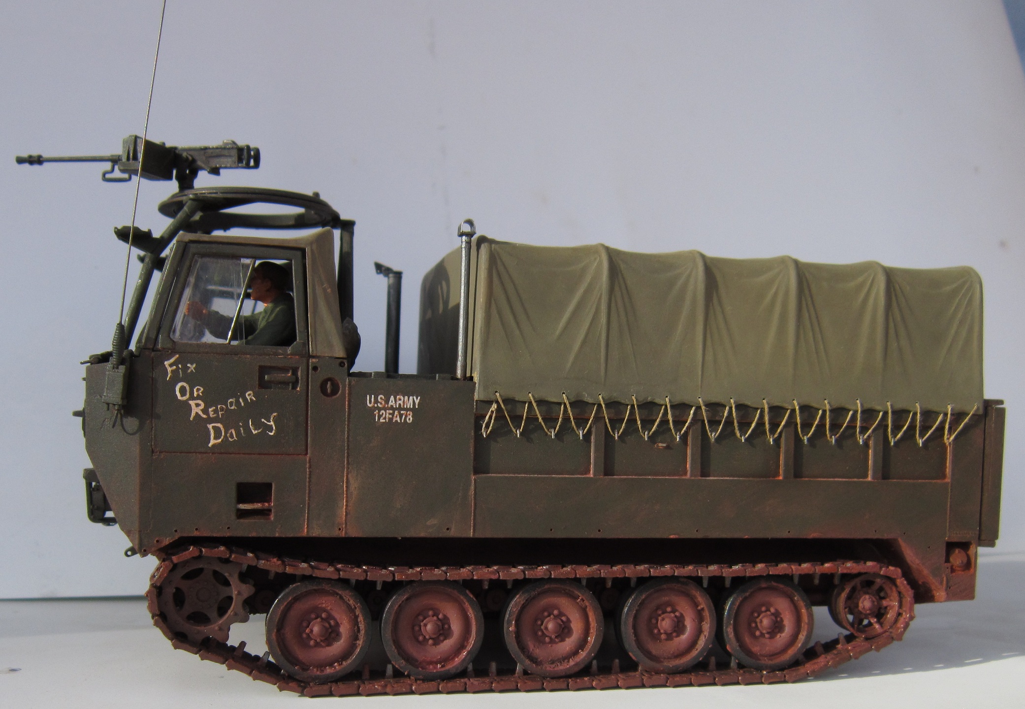 Гусеничный транспортёр М548А1 армии США, Южный Вьетнам, начало 70-х годов 20 века. Полевая модификация - вместо очень "нужного" в условиях Вьетнама отопителя на его месте в нише кабины установлена радиостанция. Машина недавно прибыла на ТВД - многочисленный шанцевый инструмент и принадлежности, закреплённые на кабине ещё не успели прое...э-э, потерять, а тент ещё не прогнил до дыр в вечной сырости.
