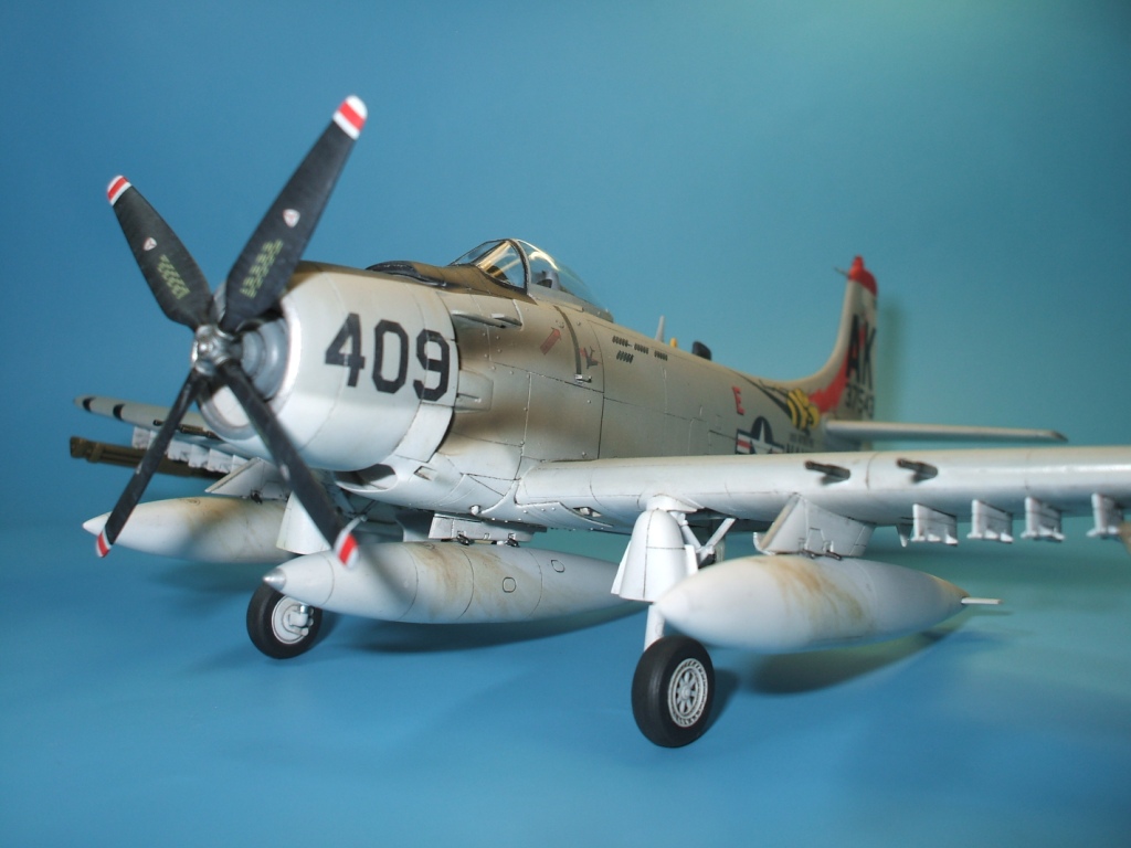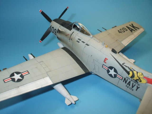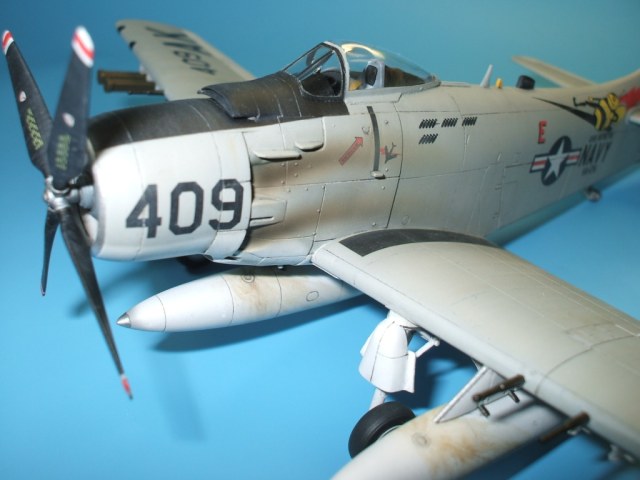 Соглашусь, с серебристой кромкой много фото разных самолётов. Кстати, у меня есть фото, на котором есть серебристая кромка, и с номером 409.Самолёт садится на палубу авианосца. Я тоже хотел покрасить кромку, но сумел разглядеть, что там эмблема другая.Похоже, что 409 был не один. Хотя есть источники, в которых всё говорится о самолёте 409, тоже победа и т.д. А вот пчелы нет. Хотя это только описание и рисунок. Подтверждающего фото нет. А я руководствовался вот этим фото. Правда, это похоже на смотровой площадке сфотографировано после окончания боёв( возможно на какой-то выставке) -нет ни баков, ни подвесок, да и нагар отмыт у самолёта, словно он долетал до места назначения и всё. Есть ещё аналогичное фото, только с другого ракурса.