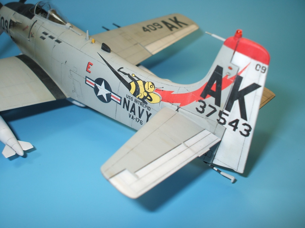 Прекрасная модель! Посмотрел с большим удовольствием и интересом.С удовольствием - здорово сделано, нет замечаний. С интересом - делаю аналогичную модель Скайрейдера с номером 409. Есть только 2 вопроса, больше как размышление. У вас победа и бомбы с 2х сторон фюзеляжа. Это декаль так дана? Потому что у меня только дано с одной стороны. А фото этого самолёта только 2 и обе фотографии с левой стороны.По крайней мере, что я смог найти. А второе - по самому краю капота у вас "серебристая "полоска.Вроде на фото я не увидел. Но могу и ошибаться.Но это совсем мелочи, как я уже написал - больше тема для рассуждения. За модель 5+!