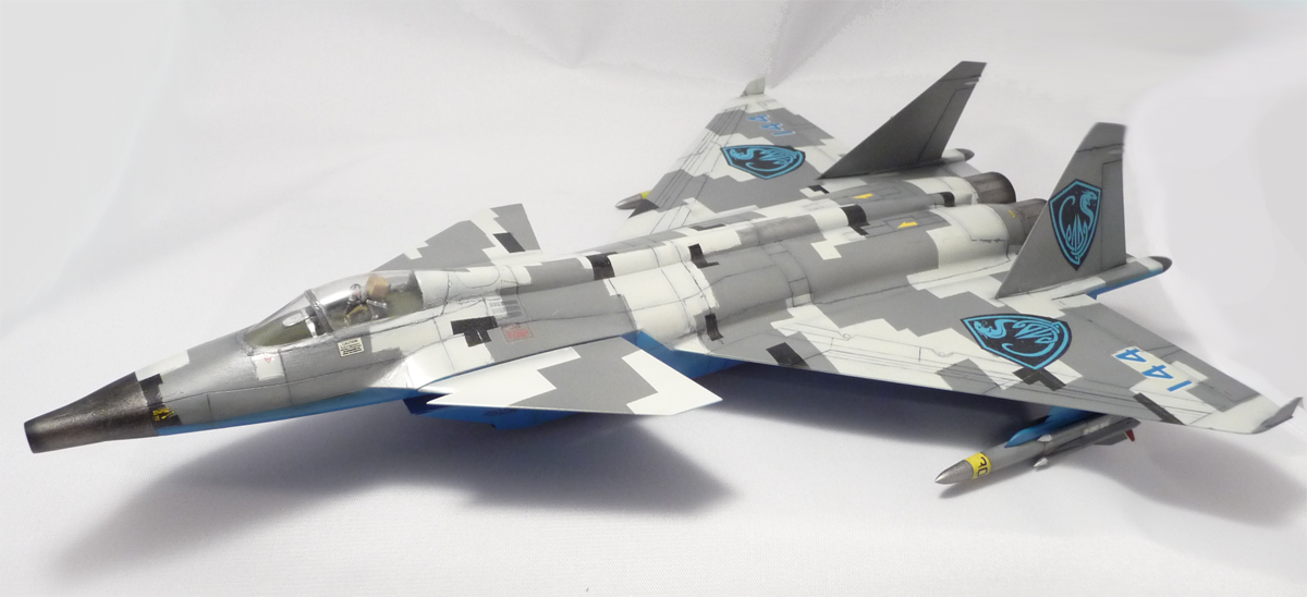 Волею судеб оригинальные иллюстрации Mechbuster'a до ужаса напоминали так и не пошедший в серию прототип советского истребителя пятого поколения МиГ 1.44, что и позволило взять за основу модель Звезды с минимальными изменениями (установленные наоборот стабилизаторы, автопушка в носу из старых запасов и две ракеты Х-31, призванные изображать Arrow IV.