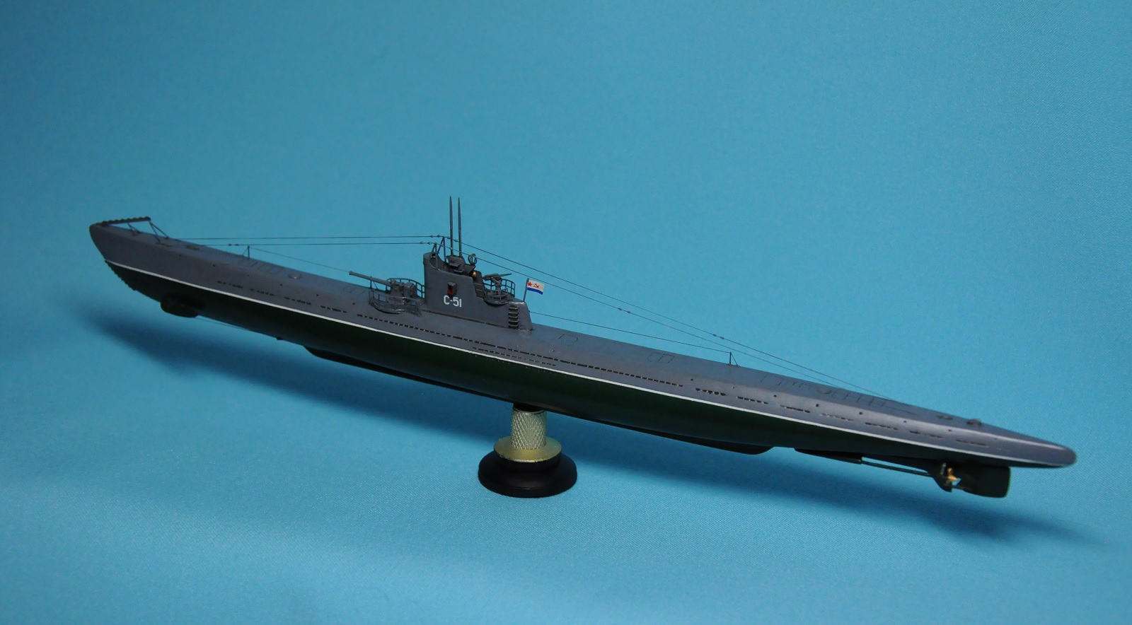 При сборке пришлось много шпаклевать корпус. Пришлось выделить всю расшивку (кроме шпигатов, туда не лез). Заменена подставка. Заменены перископы на иглы. Рассверлен ствол главного орудия. Рассверлены отверстия на рубке в задней правой части. Рассверлено отверстие в самом носу лодки. 45мм орудие - смоляное от ЗиП. Сделаны леера и тросы - стойки из набора Tamiya, нити спандекс. Изоляторы на тросах - капли ПВА. Застеклена рубка.Сделан объем колокола, в штате он плоский. Номер пришлось сделать по аналогии с лодкой С-56, на место, которое видно на фото С-51 он не влезал. Звезда с числом побед взята из остатков декалей набора лодки типа Щ, флаг - из остатков Флагмановских декалей. Окраска - акрил Tamiya. Смывка из пастельных мелков.