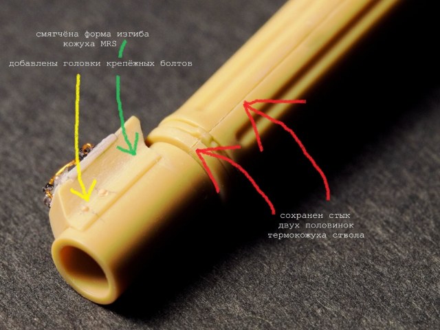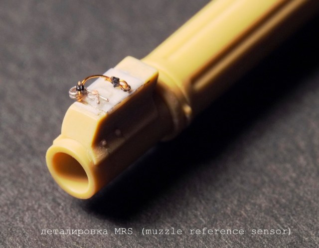 - на дульном срезе отсутствует другая весьма заметная (и даже воспроизведённая на боксарте) «вкусняшка» - тонкая деталировка крышки кожуха MRS (muzzlereferencesensor, датчик системы учёта прогиба ствола ), а сам кожух выполнен глухим, без внутренней полости и зеркала, и даже без крепежных болтиков;