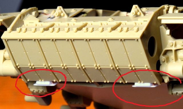 - антислип (противоскользящее покрытие): на "Челленджерах" оно весьма, весьма мелкое, совсем не такое заметное и фактурное, как на "Меркавах"; "Тамия" сделала где надо лёгкую имитацию этого покрытия, однако после покраски оно почти исчезает. Я твёрдо убеждён, что здесь лучше всё оставить как есть, т.к. воспроизвести копийно такой мелкозернистый антислип - крайне сложно, а риски испортить модель "колхозным тюнингом" - слишком реальны;