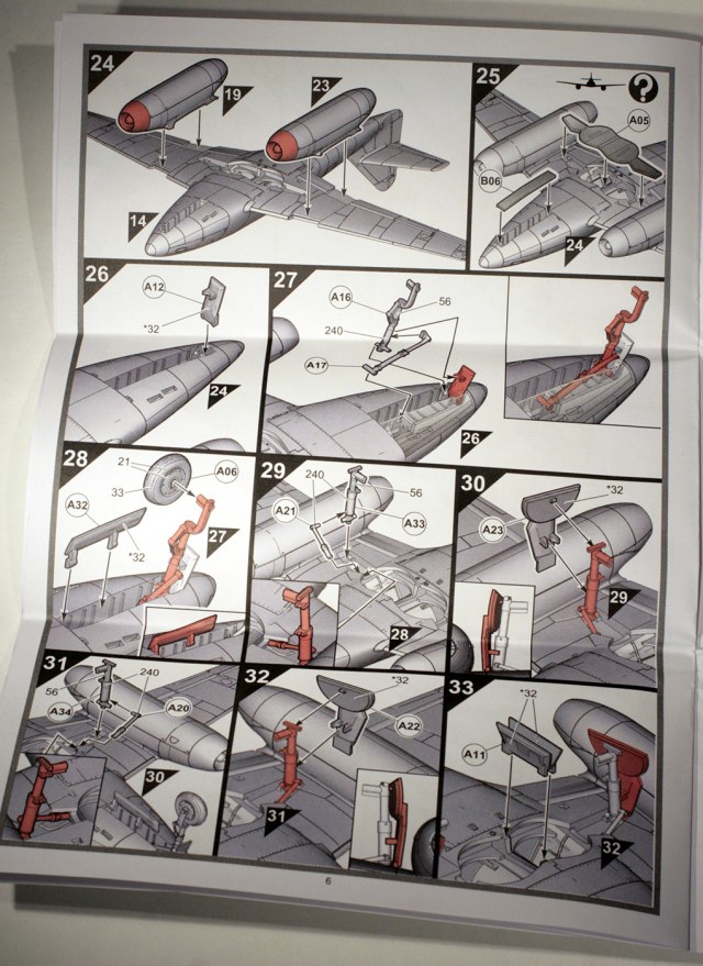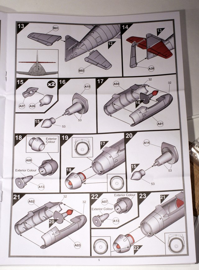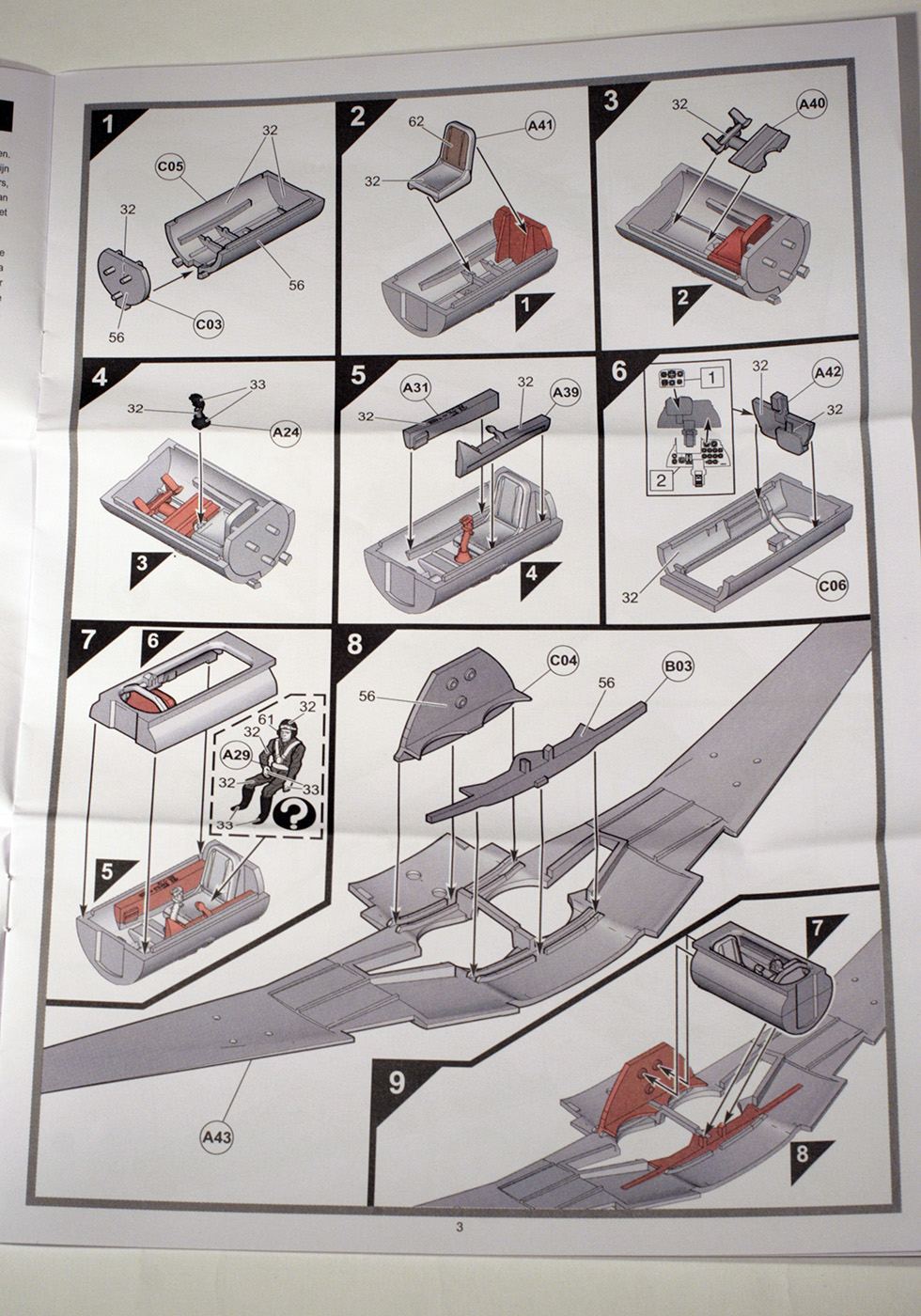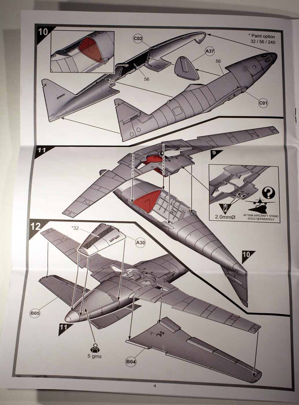 Инструкция - цветная книжка формата А-4 + глянцевый вкладыш со схемами окраски. Довольно объемная и подробная, процесс сборки выглядит долгим, хотя по факту - просто слишком сильно разбит на отдельные операции. Про грузик в нос - не забыли. Как обычно - палитры цветов для окраски мелочевки нет, только указания на номера цветов из палитры Humbrol прямо в этапах инструкции, это неудобно.