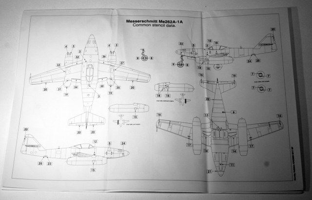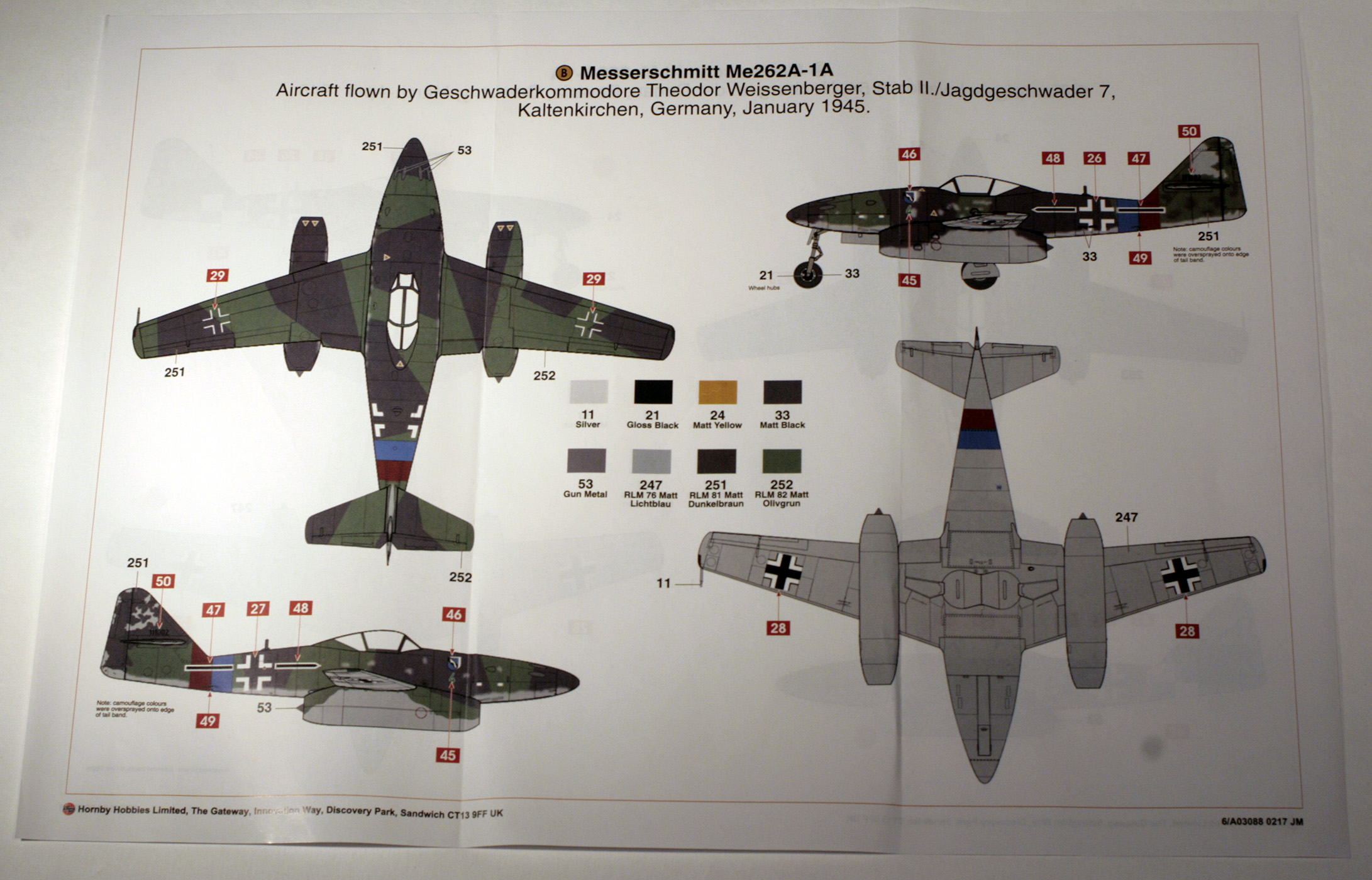 1. Me262A-1A "жетная тройка" 9/Kampfgeschwader J54 Нойбург-на-Дунае, Бавария, Германия, март-апрель 1945 года. Машина несет однотонный камуфляж верхних поверхностей в RLM 83. Существует фотография этой машины после аварии на посадке и более позднее фото - в разукомплектованном состоянии на свалке авиационной техники.