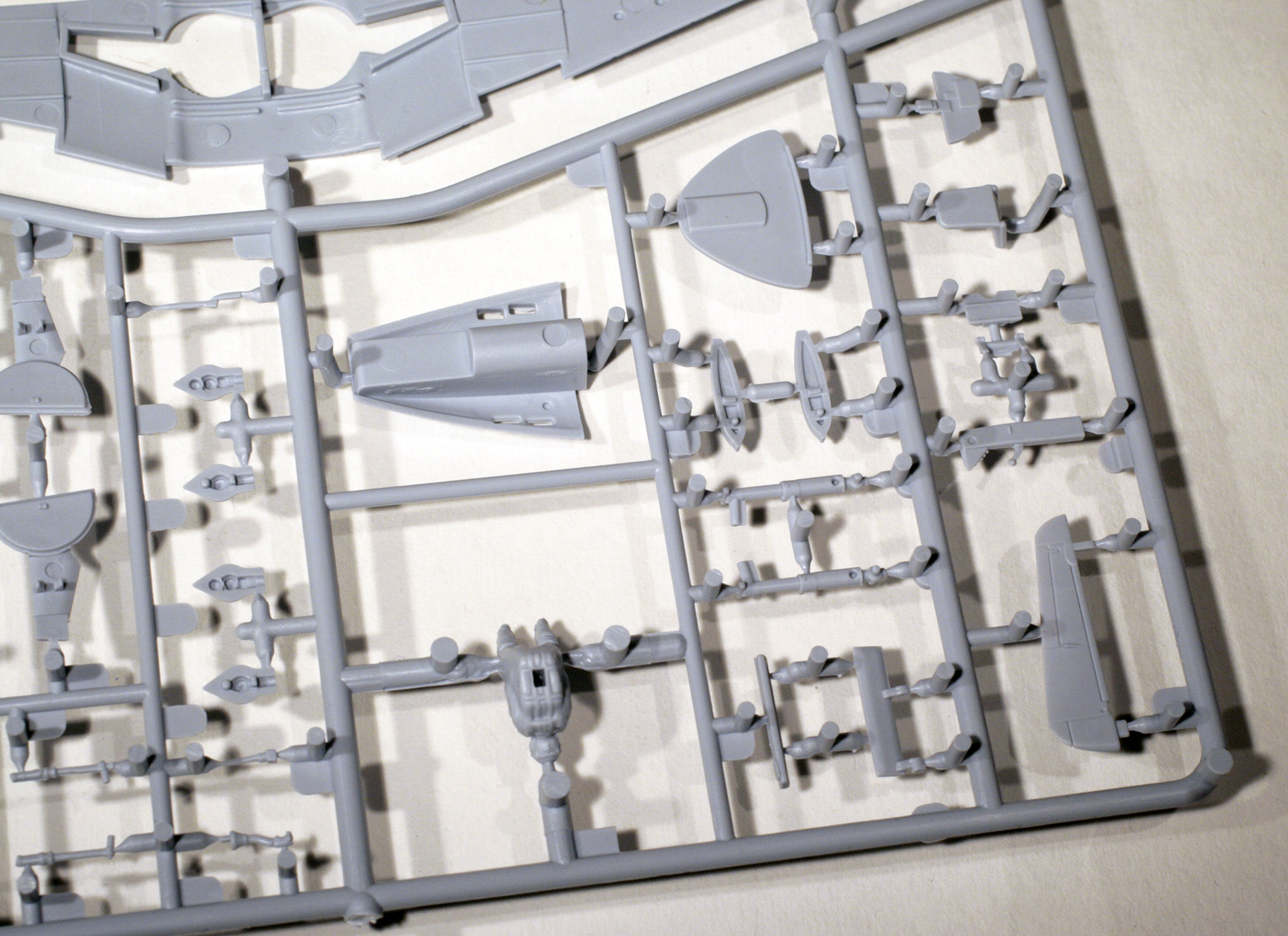 Модель от Ревелл в целом неплоха и имеет чуть лучшую проработку поверхности, тех же лючков. Но главная проблема модели от Ревелл - глухие ниши шасси, которые нужно прорезать и сильно дорабатывать. Кроме того в наборе немецкой фирмы фонарь дан одной деталью и открыть его без хирургического вмешательства нельзя.