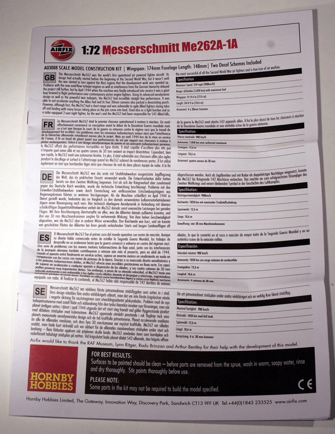 В итоге можно сказать что Ме-262 у Аирфикса вышел весьма неплохой. При общей простоте модели она может служить как основой для создания серьезной модели, так и отличным выбором для новичка. В первом случае на руку сыграет хорошая геометрия и общая проработка модели, а во-втором - хорошая стыковка и "живучая" расшивка.