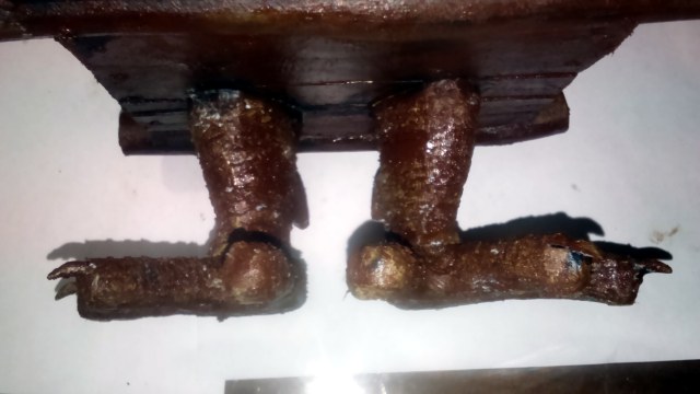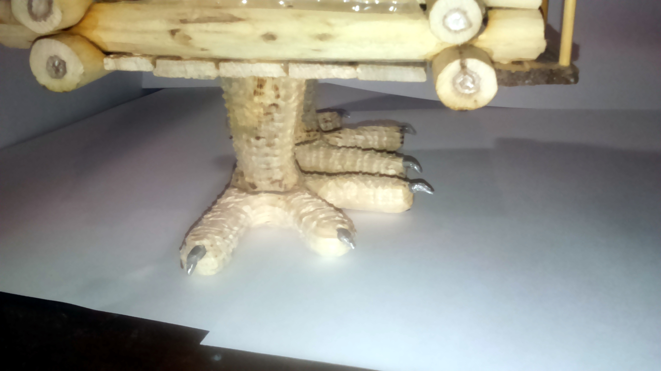 Ножки не совсем куриные, упор делался на прочность и неубиваемость игрушки. Когти алюминиевая проволока. Труба пластилин. Щели заполнены мелкой деревянной стружкой. До заполнения швы были темнее, а стружка наоборот их высветлила, дала инверсию цвета. В будущем постараюсь таких ошибок не допускать.