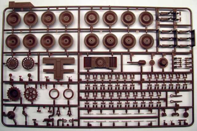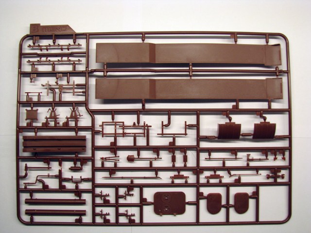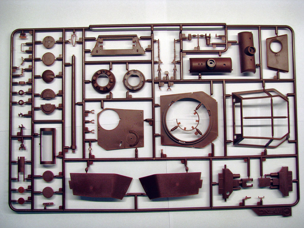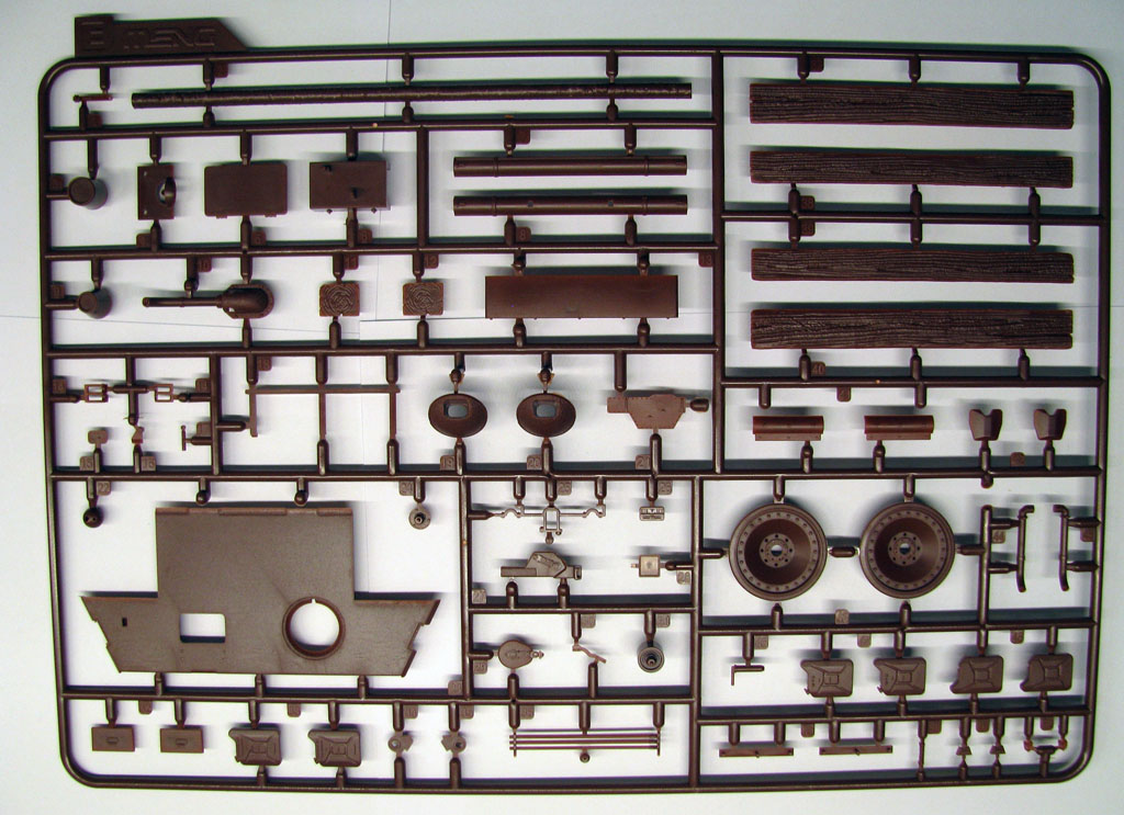 7 литников темно-красного цвета (видимо под цвет грунтовки. Довольно весело по сравнению со скучными серыми отливками трампа и драгона), Корыто корпуса дано отдельными деталями, что весьма уныло для фирмы такого уровня.