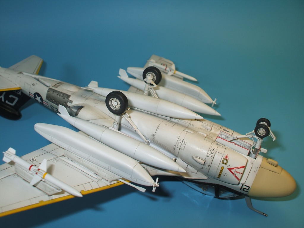 C наступающим, а кого и с наступившим НОВЫМ ГОДОМ, уважаемые коллеги! В завершении года хочу предложить вашему вниманию модель самолета радиоэлектронной борьбы флота США EA-6AIntruder. Вкратце о прототипе - EA-6A Intruder - палубный самолет РЭБ, разработанный американской фирмой Grumman. Еще на этапе проектирования рассматривалась возможность использования А-6, как заправщика и самолета, предназначенного для постановки активных радиопомех. Версия РЭБ прорабатывалась более детально с августа 1961 года. Модификации присвоили обозначение A2F-1Q (с 1962 года ЕА-6А). Первый полет опытного образца произошел в 26 апреля 1963-го. О модели особо писать не чего. Набор от Italeriвыпуска девяностых годов прошлого века, при неплохой деталировке и стыкуемости довольно примитивно выполнена расшивка, что заставляет задуматься обратиться к другим производителям. Как и предыдущая модель F-14A, модель была изготовлена в подарок и сборка проводилась нашим товарищем-моделистом, мне же досталась покраска и последующая доводка модели. … Окраска модели производилась химией Hobby Color и Tamiya, также использовалась футура, смывка от MIG и масло от Wilder, декаль прекрасно отреагировала на химию от GS.