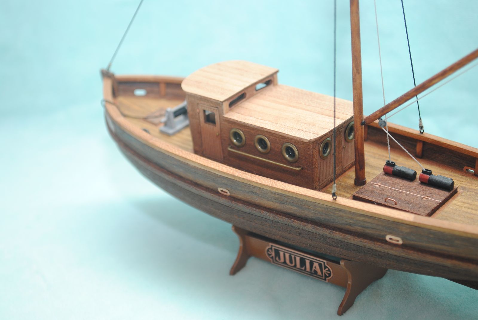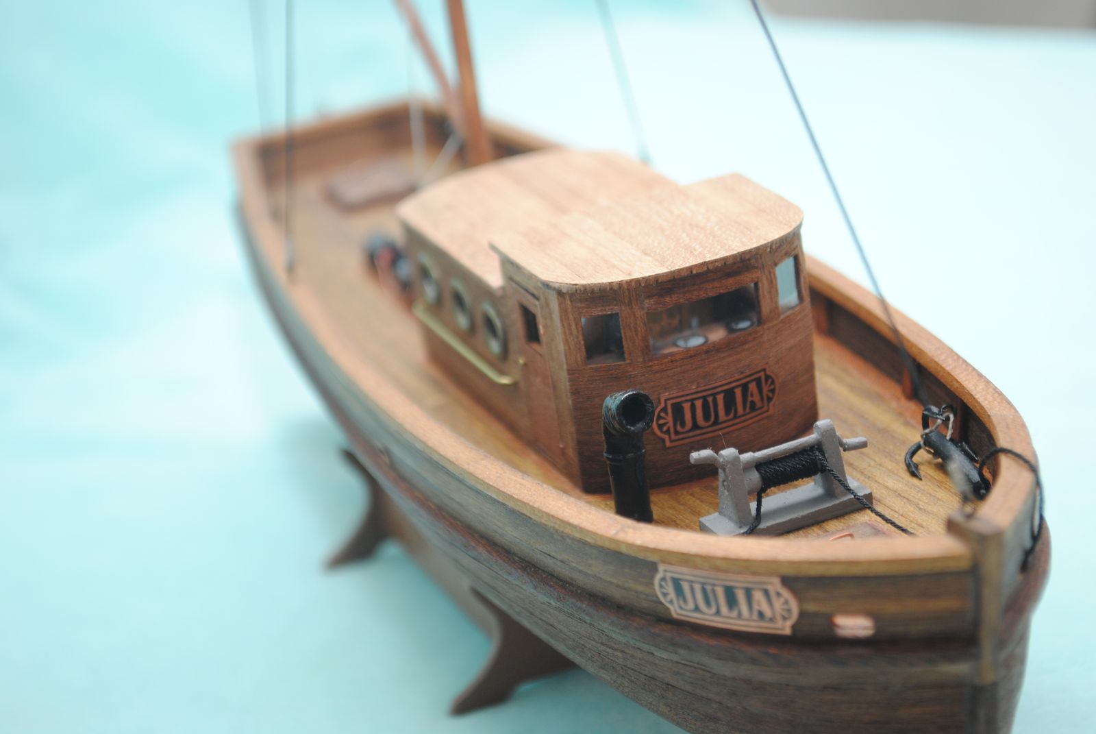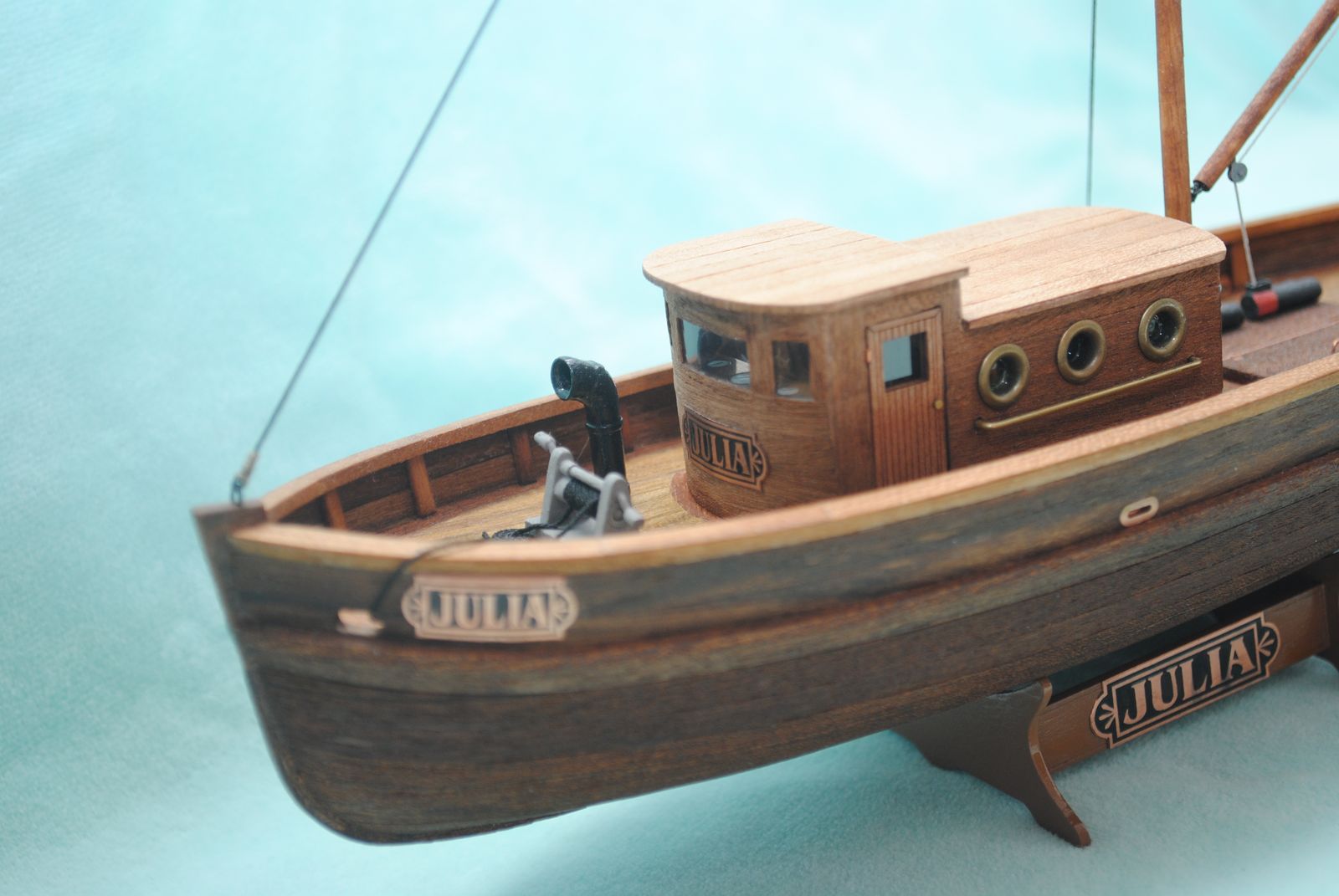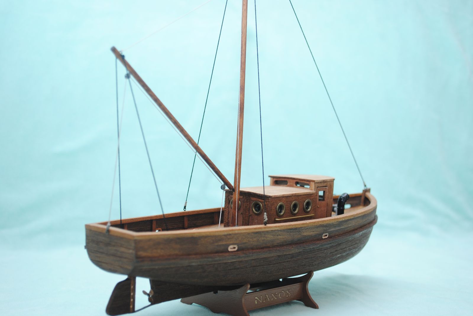За основу был взят набор китайского рыболовного бота "Naxos" и отчасти переделан и доработан. Кораблик обшит рейками разных пород дерева, самодельное травление ну и по мелочам. Особое внимание уделил каюте, внутри есть стол, гальюн и т.д., но к сожалению этого не видно). Делал ее достаточно долго, иллюминаторы - лак "Тамия". Дефлектор из бумаги, пропитанной ЦА. Корпус обработан маслом грецкого ореха.