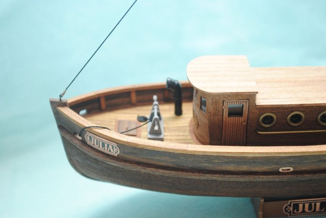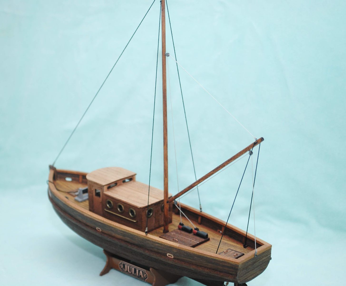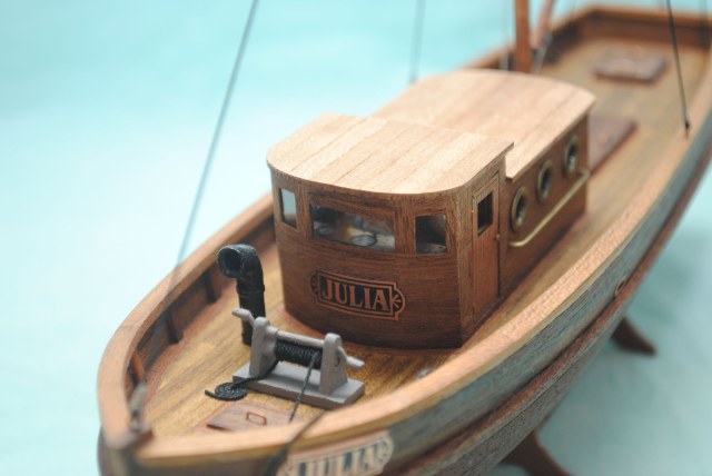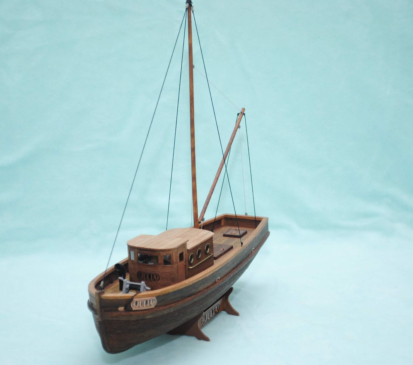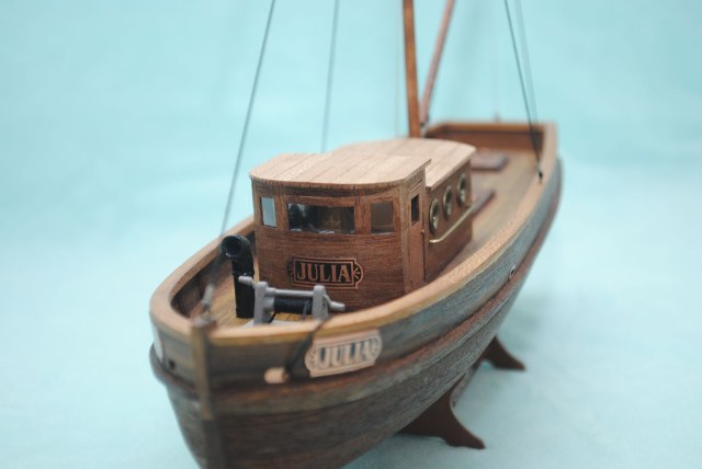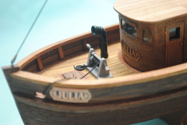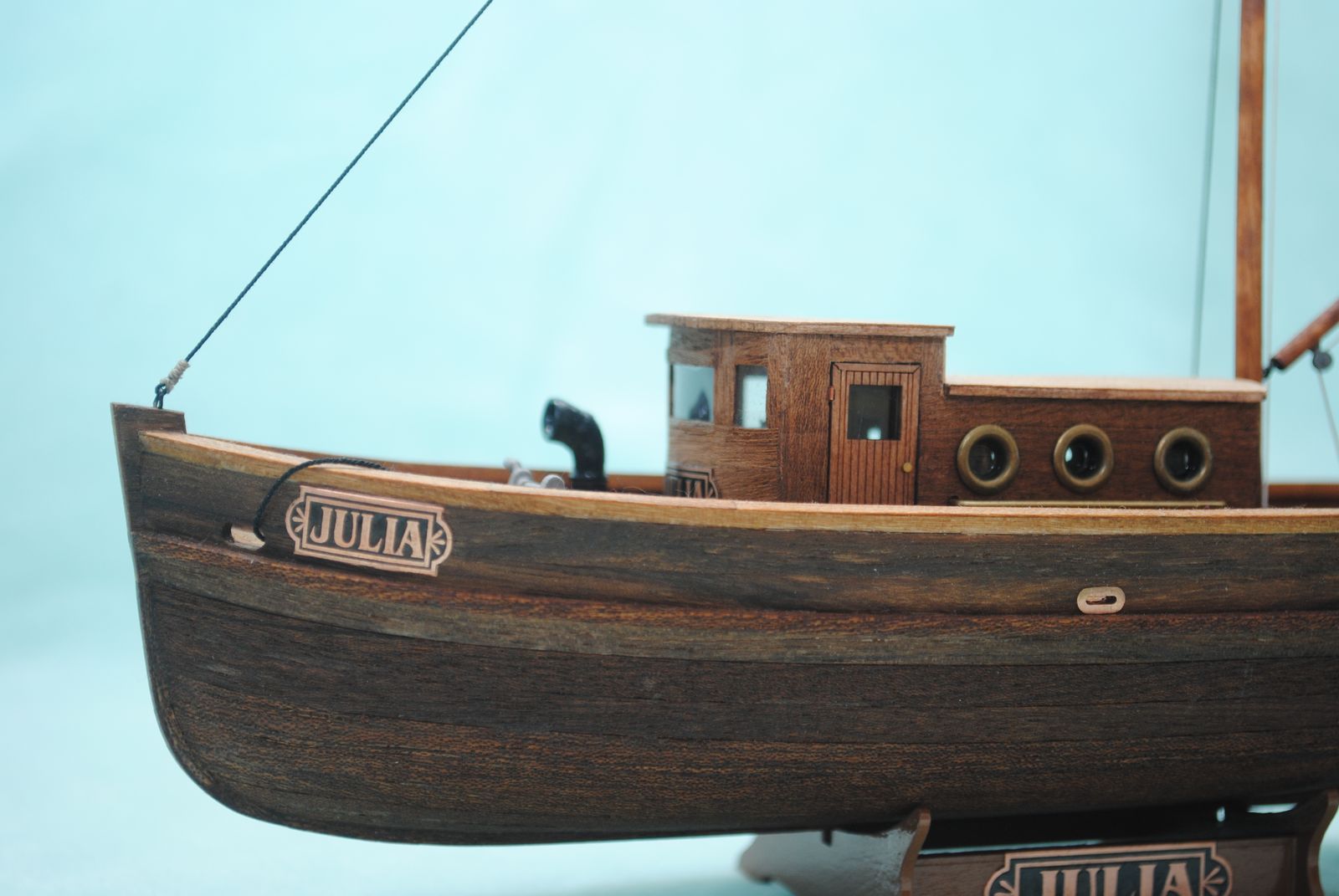 За основу был взят набор китайского рыболовного бота "Naxos" и отчасти переделан и доработан. Кораблик обшит рейками разных пород дерева, самодельное травление ну и по мелочам. Особое внимание уделил каюте, внутри есть стол, гальюн и т.д., но к сожалению этого не видно). Делал ее достаточно долго, иллюминаторы - лак "Тамия". Дефлектор из бумаги, пропитанной ЦА. Корпус обработан маслом грецкого ореха.