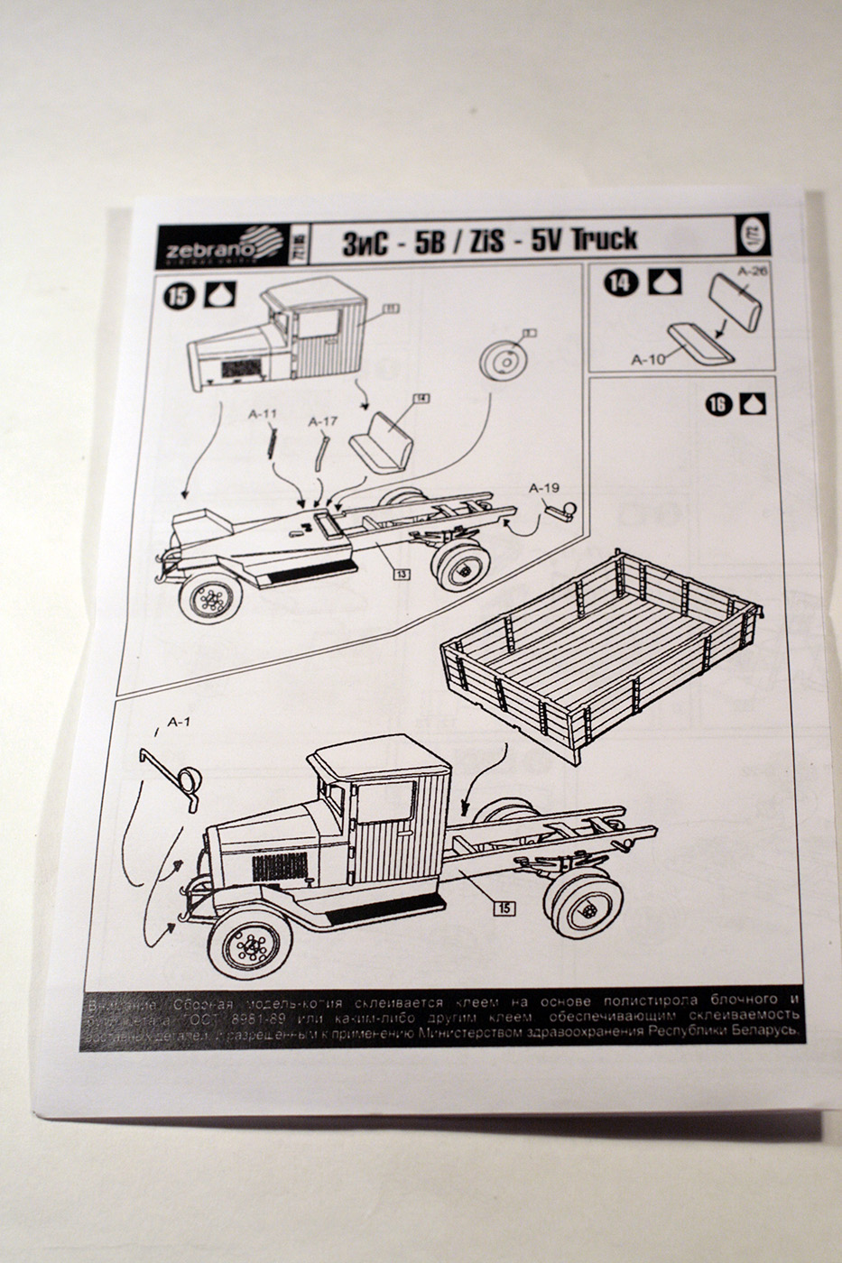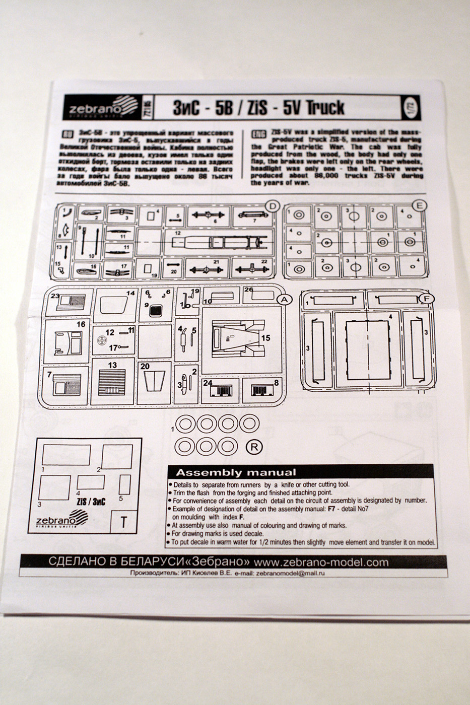 Инструкция - сложенный листок А4, с довольно подробной, но не самой понятной схемой сборки. Часть деталей рекомендуется подрезать, в том числе - раму, ведь она унифицирована с ЗиС-6. Но рекомендации очень расплывачатые и сборка обещает быть полной загадок и сюрпризов. Схемы окраски нет.