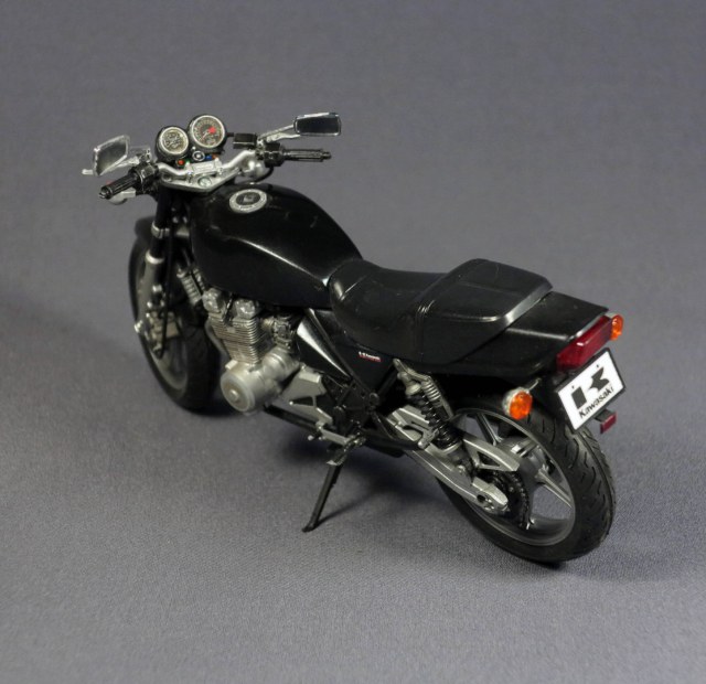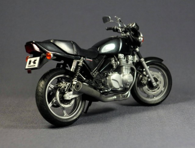Детали кузова окрашены Тамией TS Metallic Black, лак тамийский TS-13. Было, честно говоря, непросто. Бак полностью перекрашивал три раза, в итоге умерла декаль. Обидно. Пока не умею хорошо сделать глянец на модели - неплохо он получился разве что на баке и на переднем крыле. С задними кузовными панелями возникли трудности при стыковке. В итоге на них блеск сильно "померк". Тоже два раз отдирал, пытался что-то сделать. Непросто всё было, в общем.