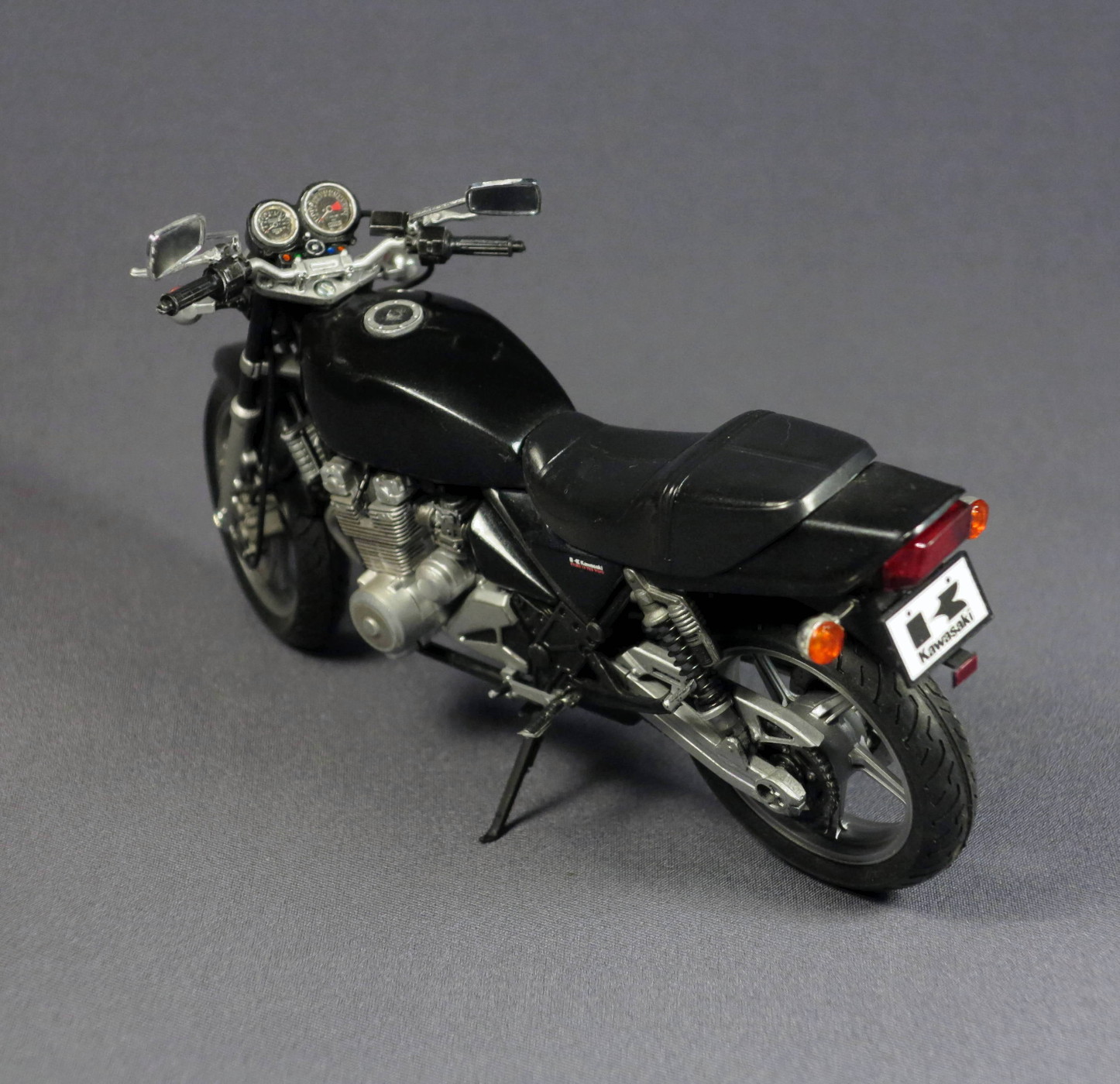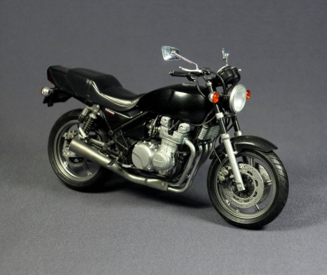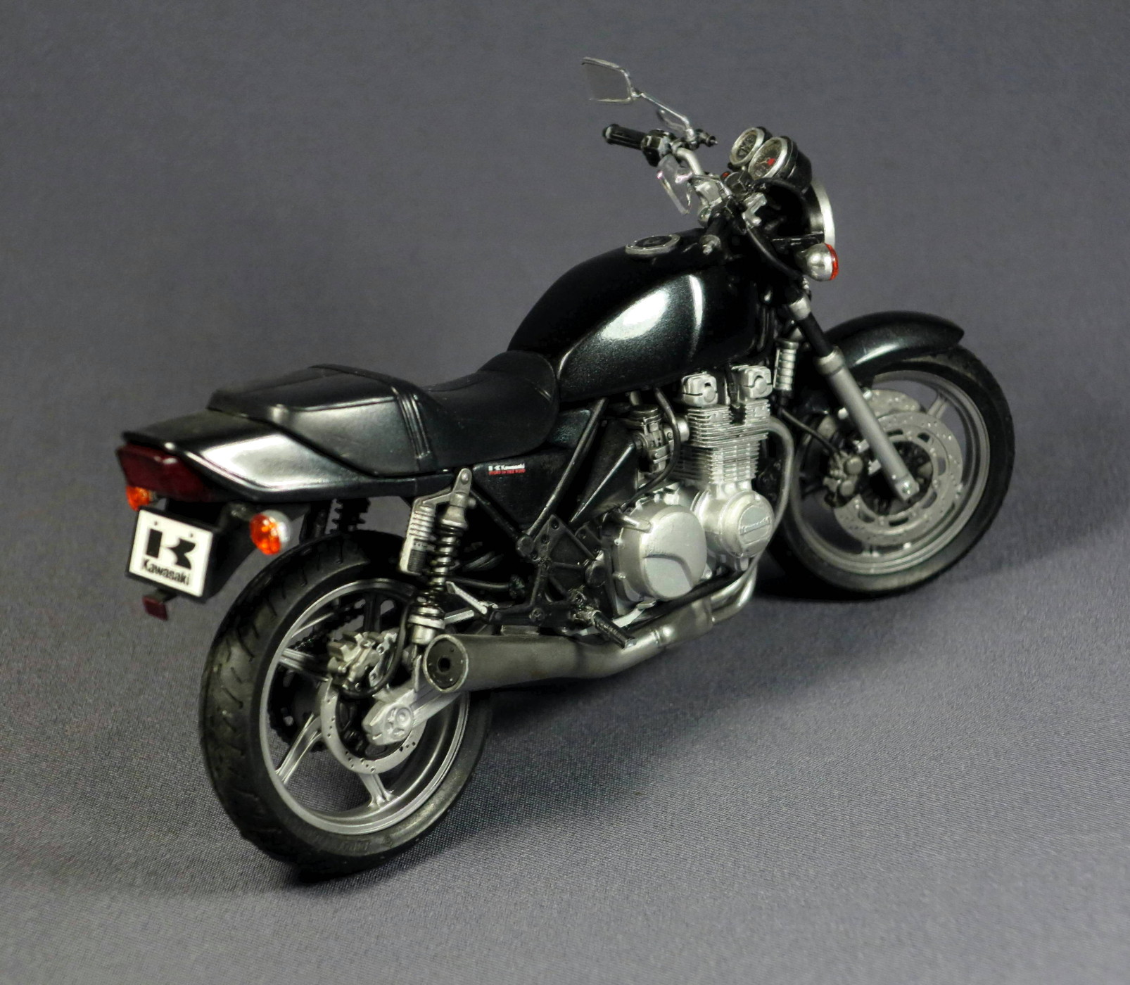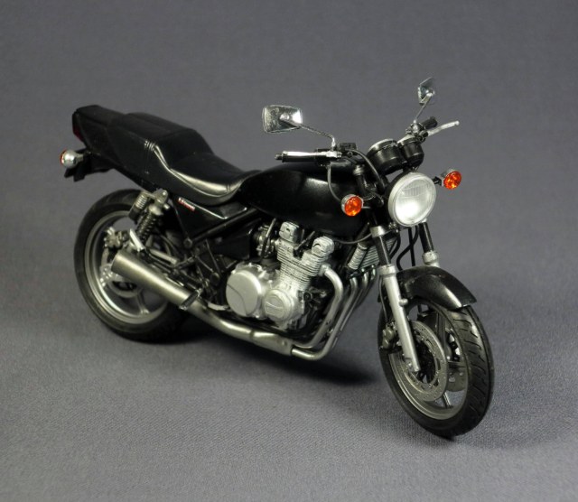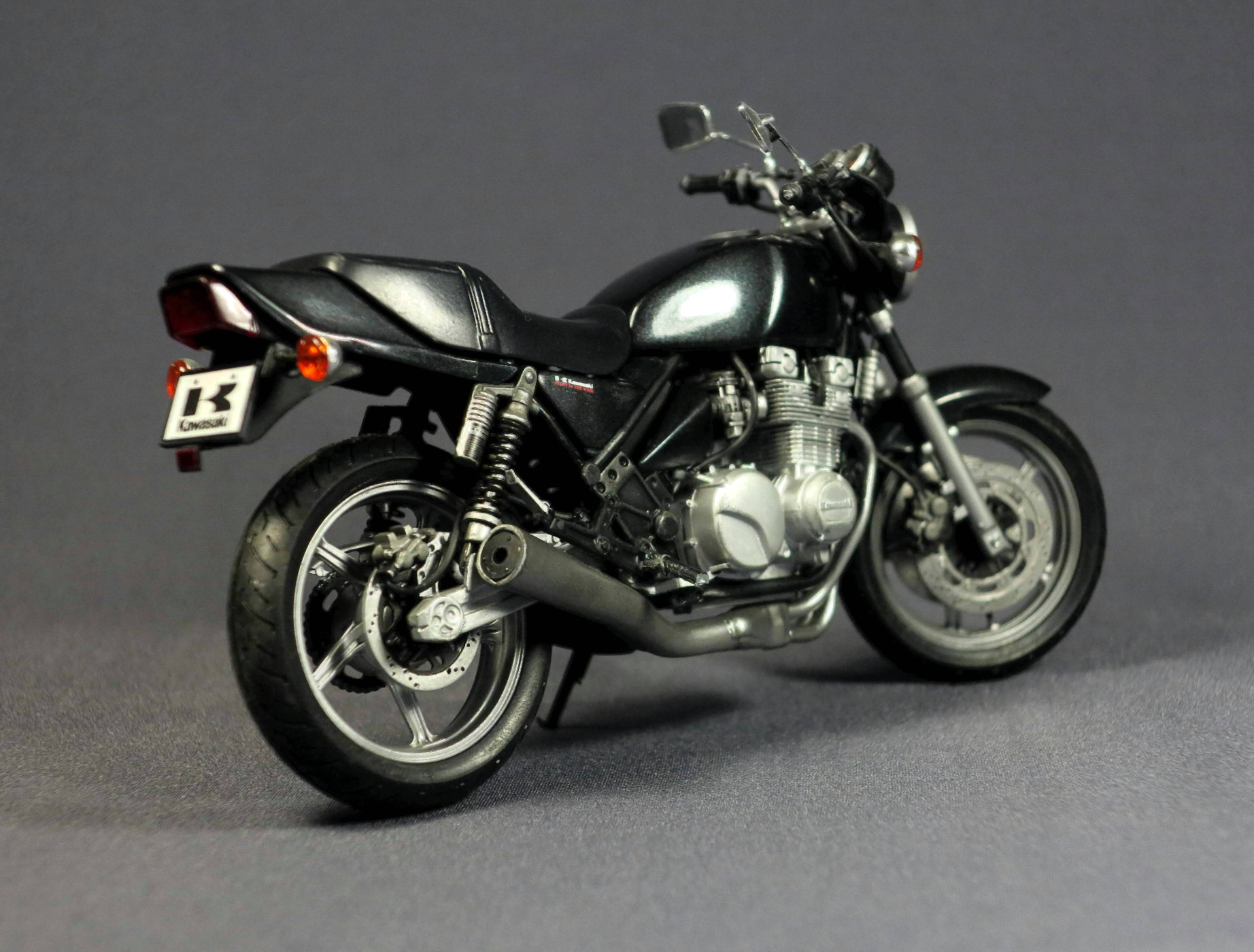 Поскольку модель "открытая" ( у производителя эта серия так и называется - naked bike, голый мотоцикл), чтобы модель выглядела интереснее, использовал при покраске несколько разных металликов - двигатель и подвеска Gunze и Tamiya, колеса и глушитель Alclad. Не знаю, заметны ли все эти мои попытки на фото - на модели глушитель вполне себе неплохо блестит (Alclad