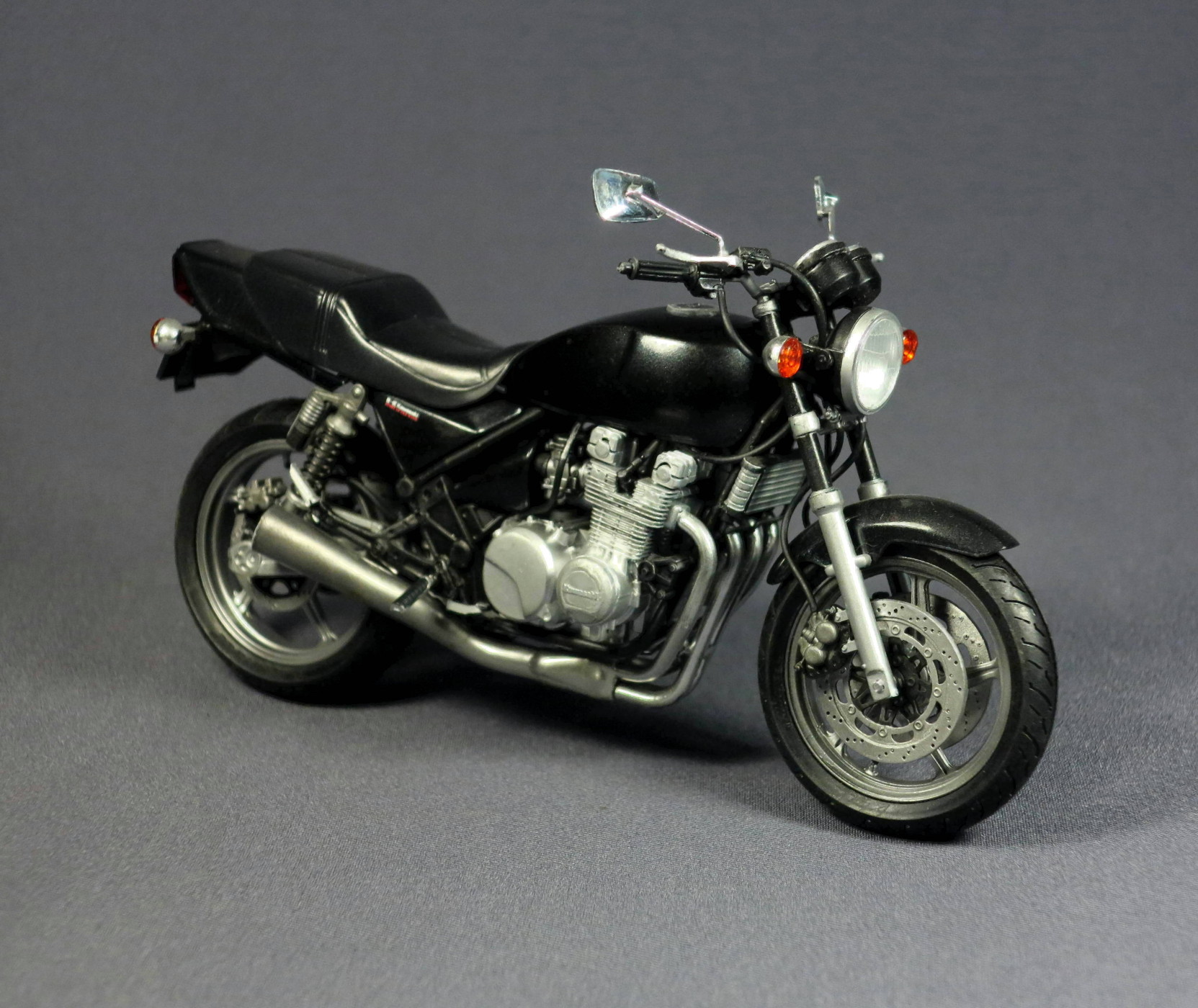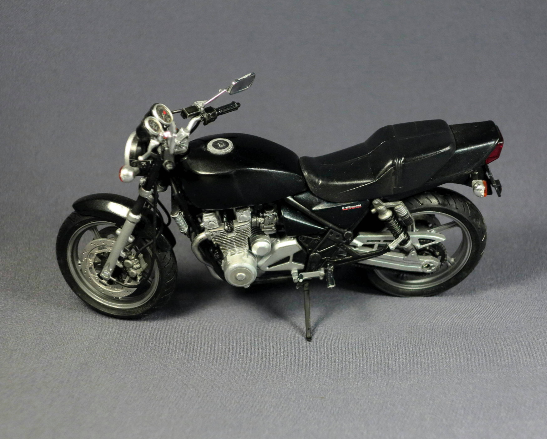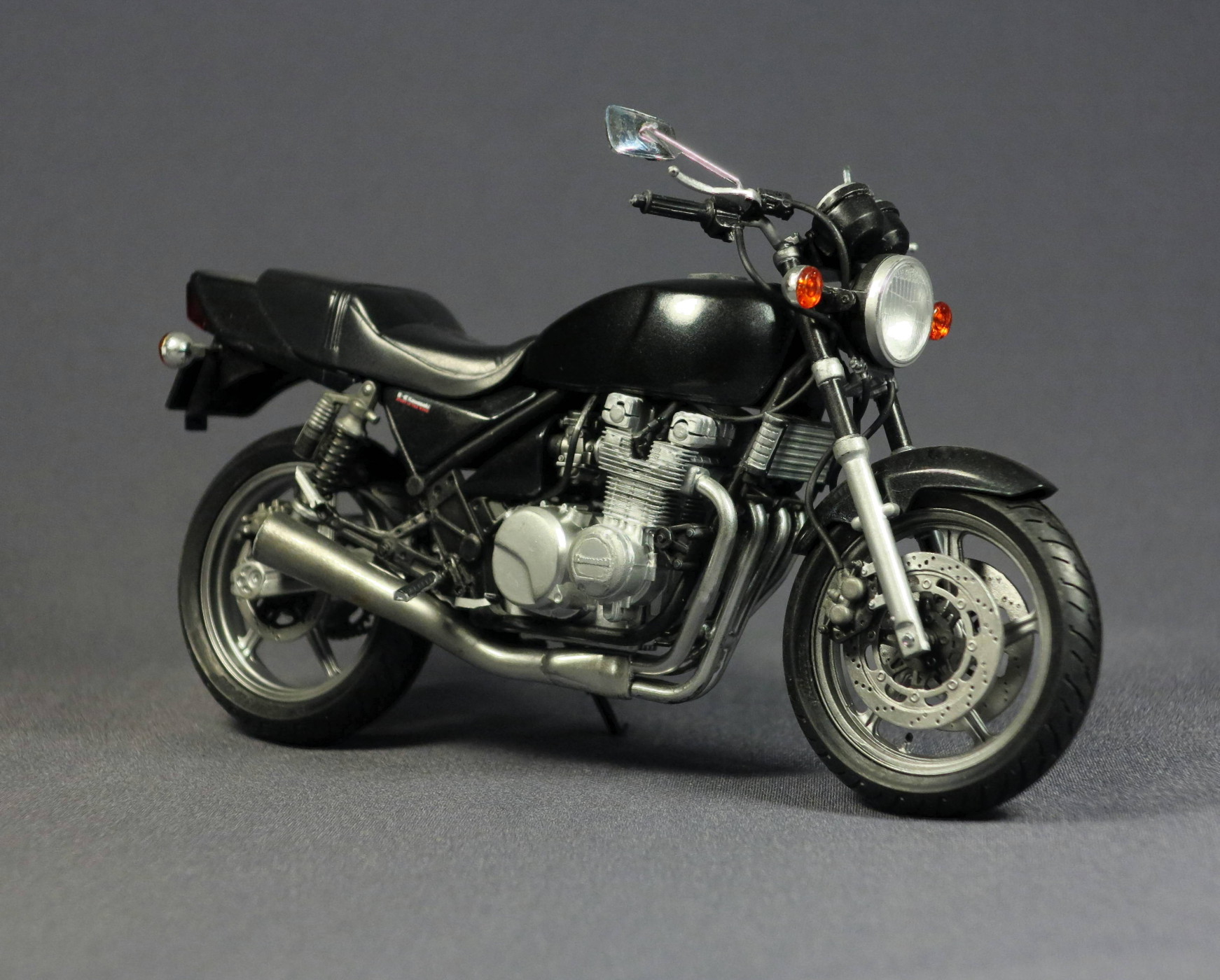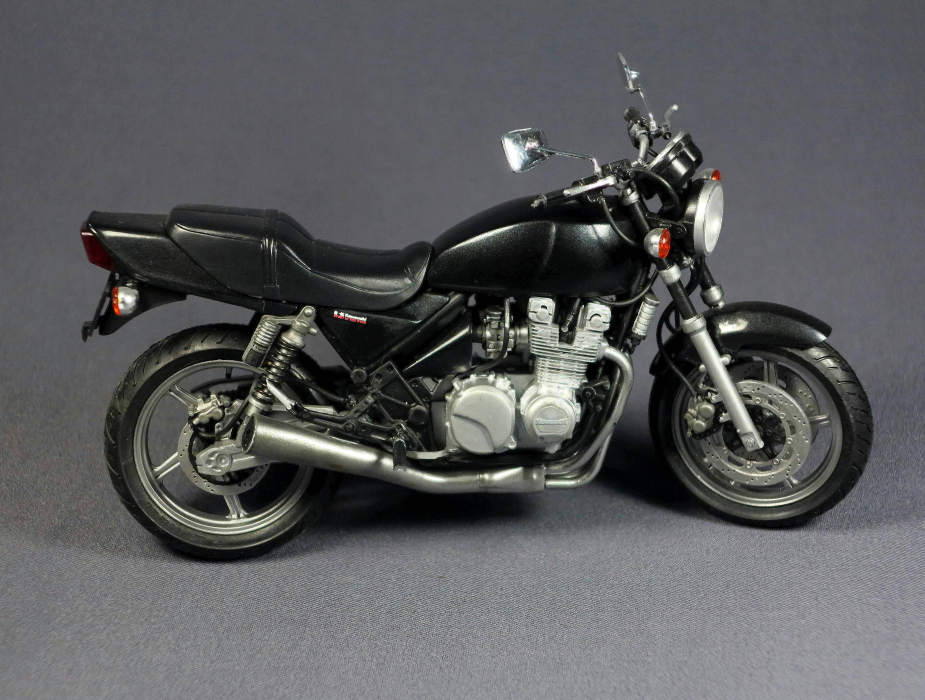 Посмотрел еще раз, добавлю, как мотоциклист и моделист. Хороший нейкед! Поправьте правую подножку, она опущена вниз. Фольга для труб вилки вполне подходит строительная самоклейка в мотках. Нужно только нахлест делать с внутренней стороны, чтобы не видно было. И разглаживать, зубочисткой, например, вдоль труб. Получится совершенно реалистично. Потом- маслорадиатор выглядит слишком блестящим, светлым. В реалии он темнее, что-то типа Ганшип-Грей. Что можно поправить, остальное по тонировке: карбюраторы имеют немного оттенок бронзовости, точнее трудно выразиться, и этот же оттенок добавьте при тонировании задних амортизаторов и их рюкзачков, и в те места, где передние тормозные диски крепятся к ступице колеса винтами под шестигранники. На задней вилке, где фрезеровки под крепление колеса, добавьте черненькой смывки, и по двигателю, везде. Поиграйте оттенками клапанных крышек и цилиндров, для реализма они должны быть немного разными, верхняя часть клапанных крышек обычно блестит, как у Вас, сами цилиндры более темные и тусклые. И оттените гайки крепления выхлопных патрубков к цилиндрам. Да, ручки, вместе с пультами, рычагами и зеркалами, следует наклонить вперед, хотя сам руль руль, вроде, стоит правильно. Законцовки руля должны быть хром-это кончики железного руля. По-моему, трудозатрат на час, не более. И тогда Зефир будет конфеткой, в полной гармонии с шикарной выхлопной трубой. Труба-супер, шикарно покрашено. Сама труба задает тон модели, эксплуатируемого мотоцикла. Отсюда вполне уместно выглядит окраска бака и хвоста, у "живых", падавших мотиков, так оно и есть. Для эстетства можно переднюю резину одеть наоборот. Довольно часто встречается передняя мото-резина с обратным рисунком, если написано Данлоп- смело меняейте. Когда люди несведующие будут тыкать, мол, косяк,-можно будет поумничать.