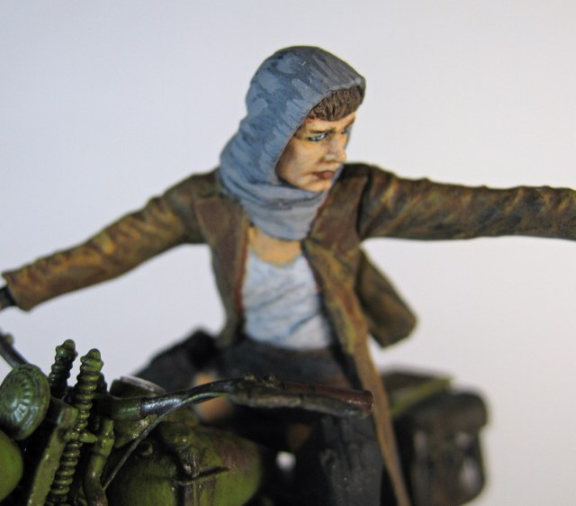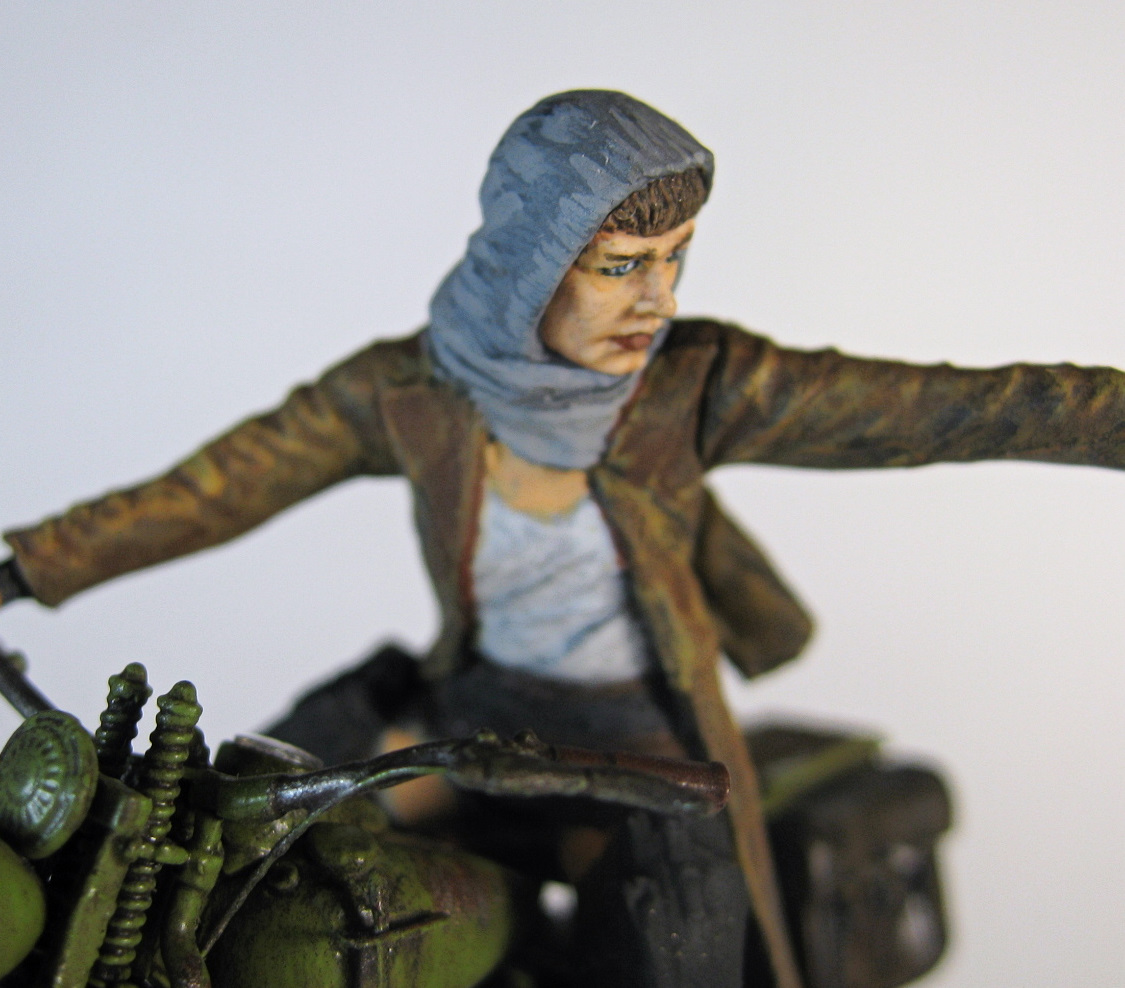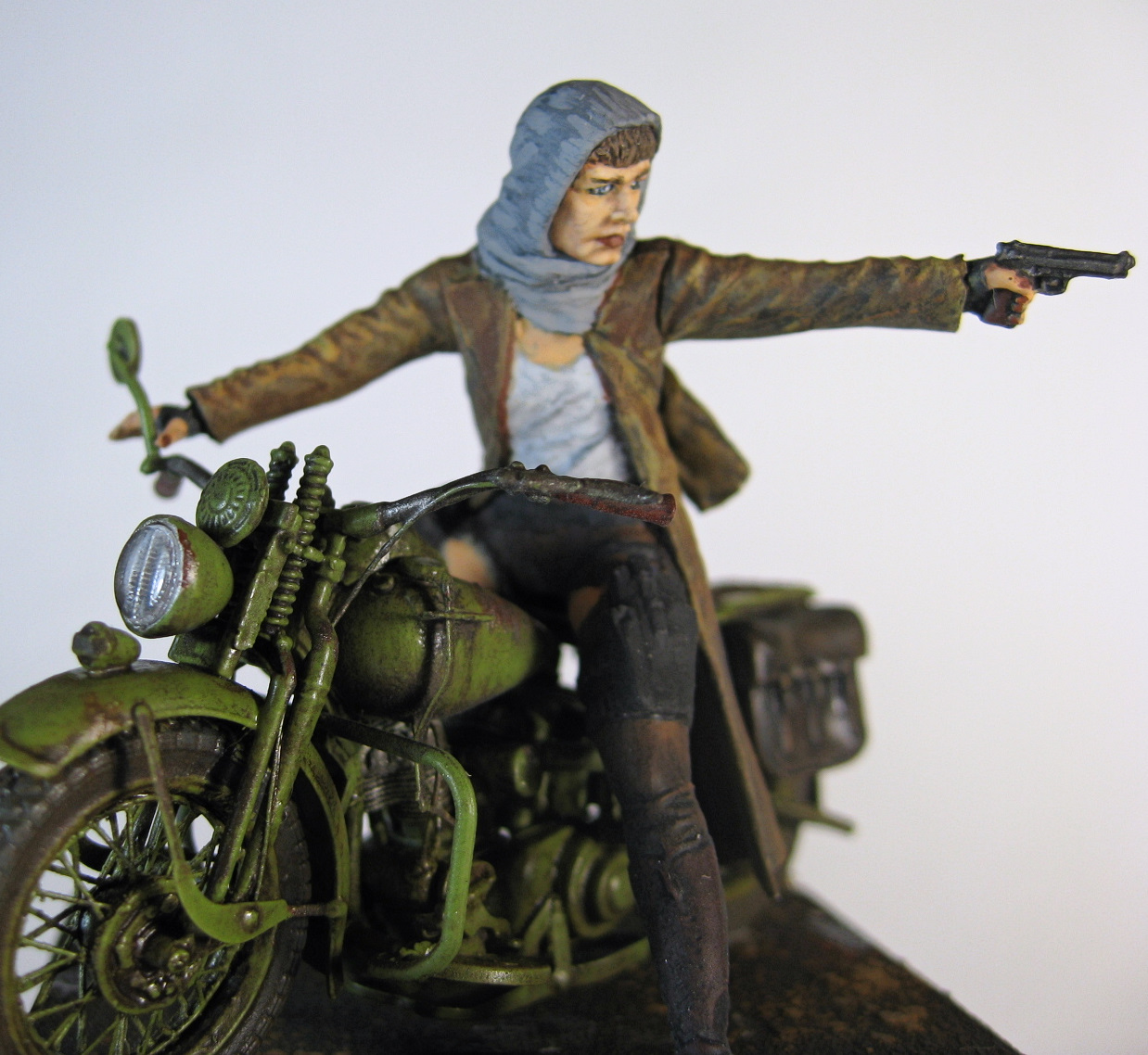 Ваша диорама прекрасна, но лица мотоциклистки не видно совсем. Во всем остальном - шедевр.