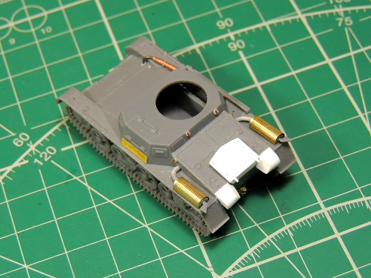 Твои "немногочисленные" дополнения понравились - особенно гофрированные шланги. Прикольно то, что при всей замыленности модели, четко видны шестигранные гайки на планке, которая катки соединяет