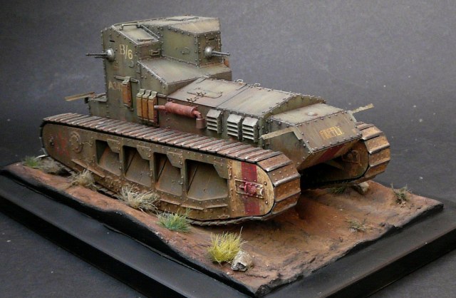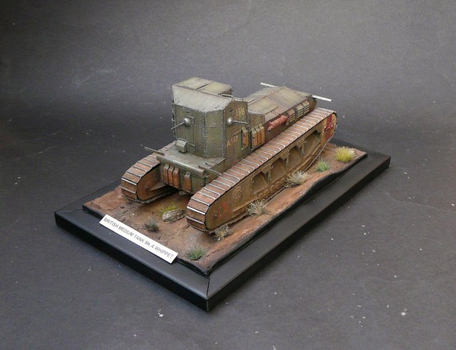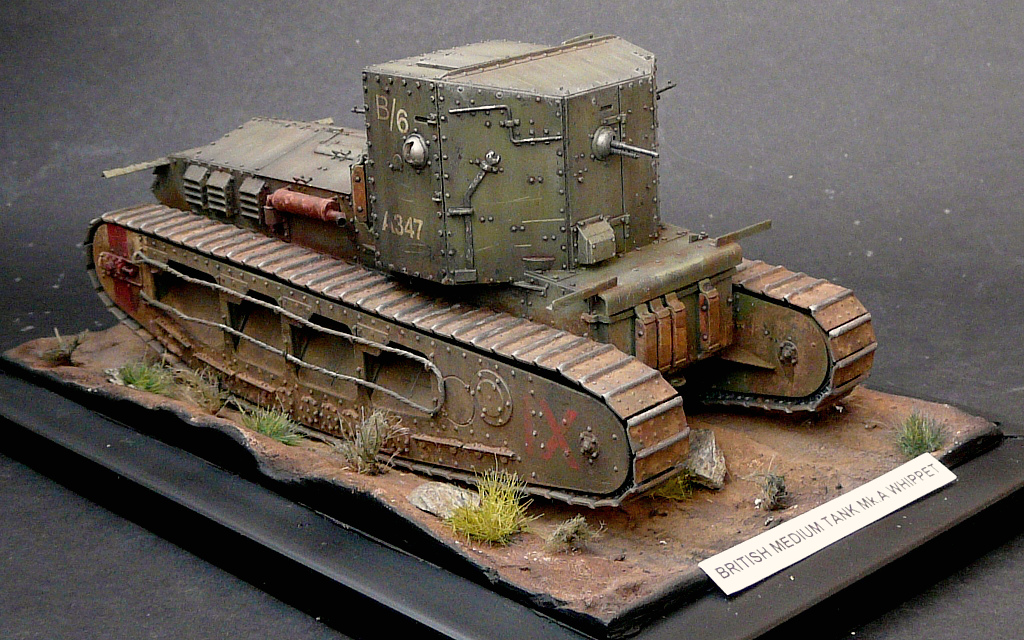 Всем привет.Закончил очередную работу,танк первой мировой Mk A «Whippet» от Менг.Работа из коробки,трудностей при сборке не возникло,из отрицательных моментов ,это не очень хорошая стыкуемость верхней части корпуса и пришлось стачивать звездочки,так как гусянки на них не садились.Красил Тамией,масло,эффекты от АК,пигменты ЗИП.