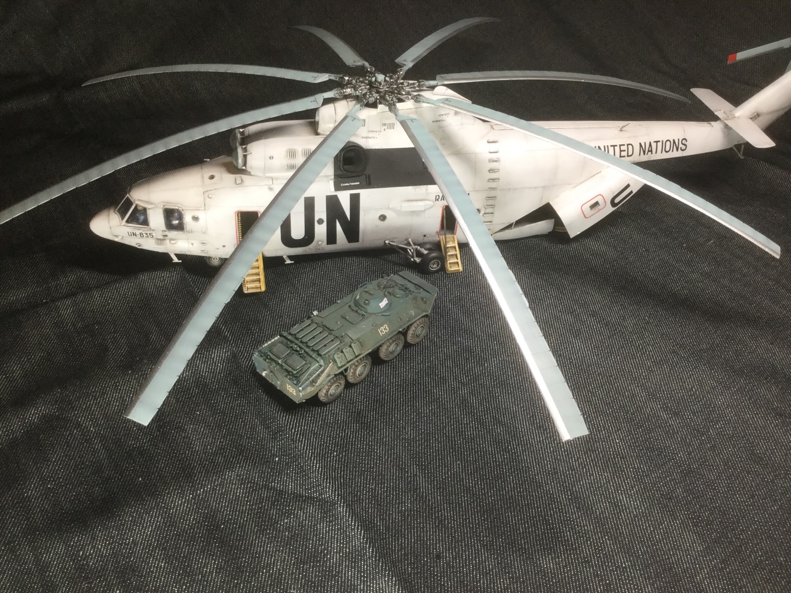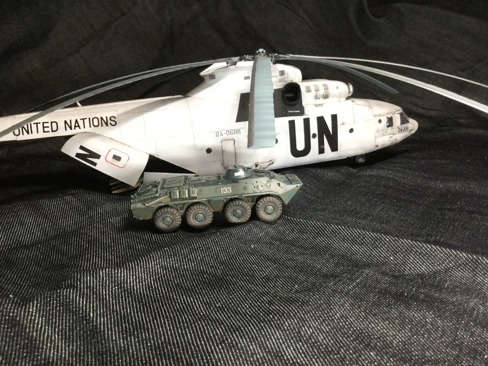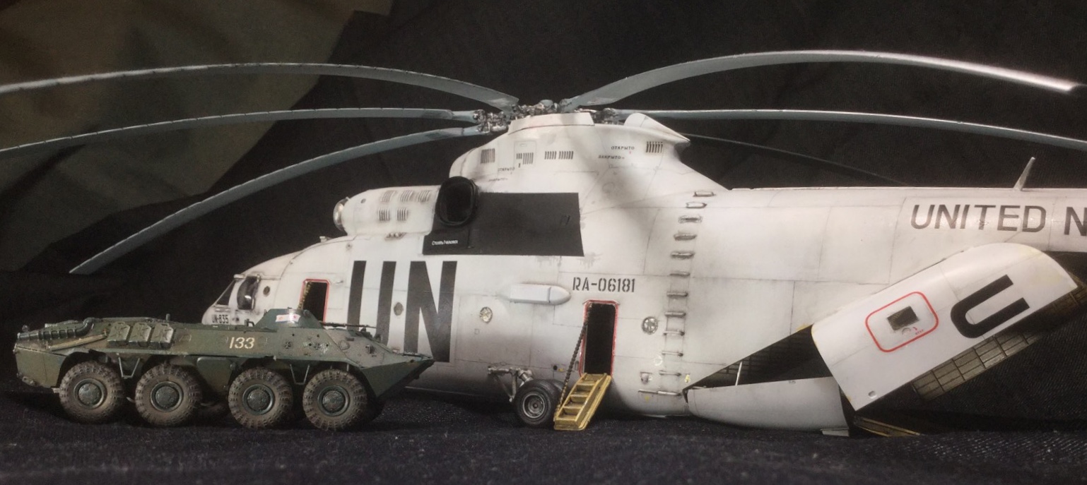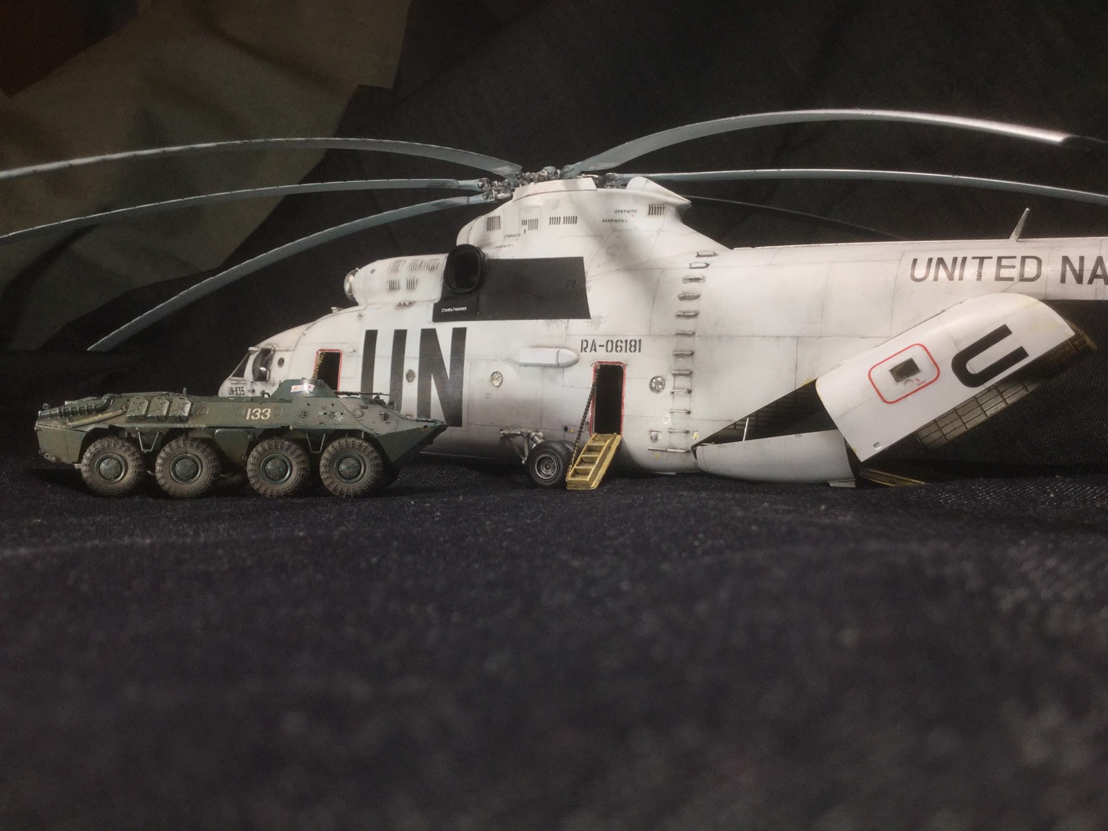 Представляю на ваш суд модель вертолета ми-26 производитель «звезда» 1:72 в окраске вооруженных сил организации объединенных наций. Аппарат делался в подарок сыну на Новый год, частично сборка им и проводилась. Сборка склейка стандартные для звезды: там криво, там доработать напильником и сгладить шпатлевкой... красилось спиртовым акрилом матовый белый от Tamiya, иммитация теней и расшивок проведена заливкой таже от Tamiya цвет черный, в походе за красками выяснилось, что грузовому вертолету не хватает груза и было решено приобрести модель бтр-70 1:72 от Trumpeter так как ничего натовского-ооновского в этом масштабе в магазине не нашлось, приобрели нашего старичка, тем более что он точно использовался миротворцами, собирался и красился бтр сыном на глаз, заливку проводил уже я, грязь на протекторах и кузове использовалась Nature Effects earth
