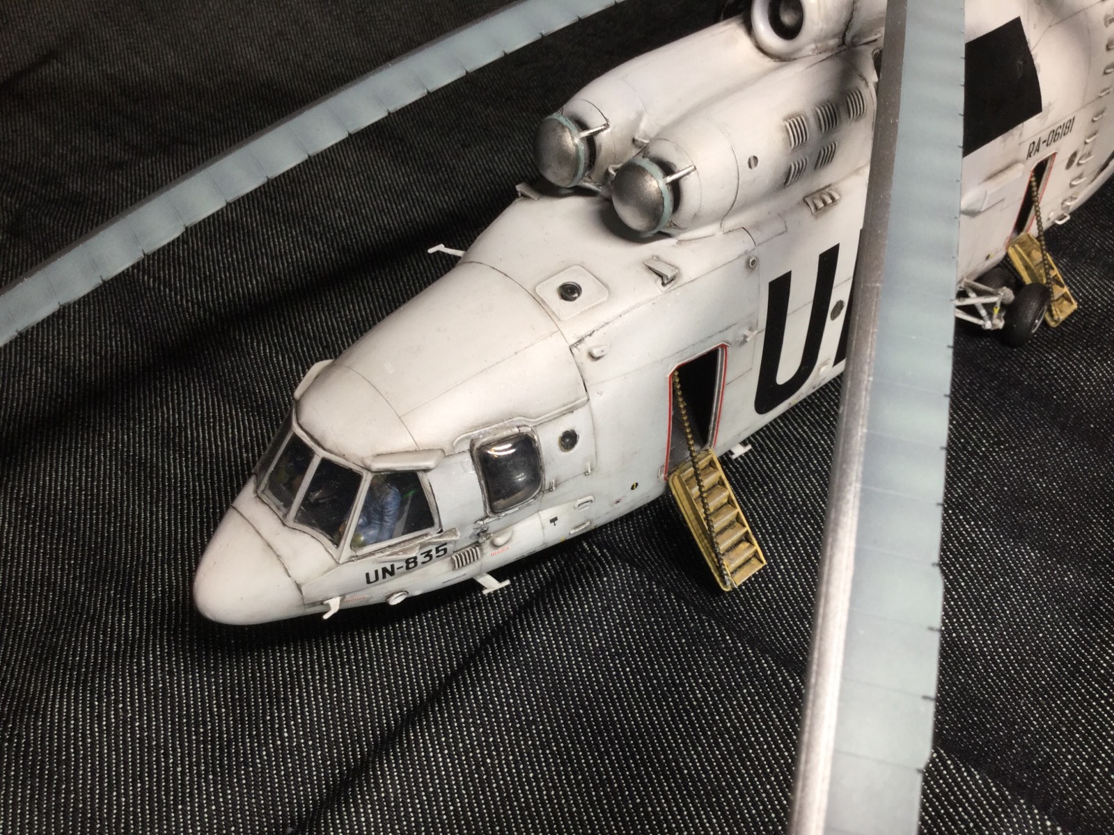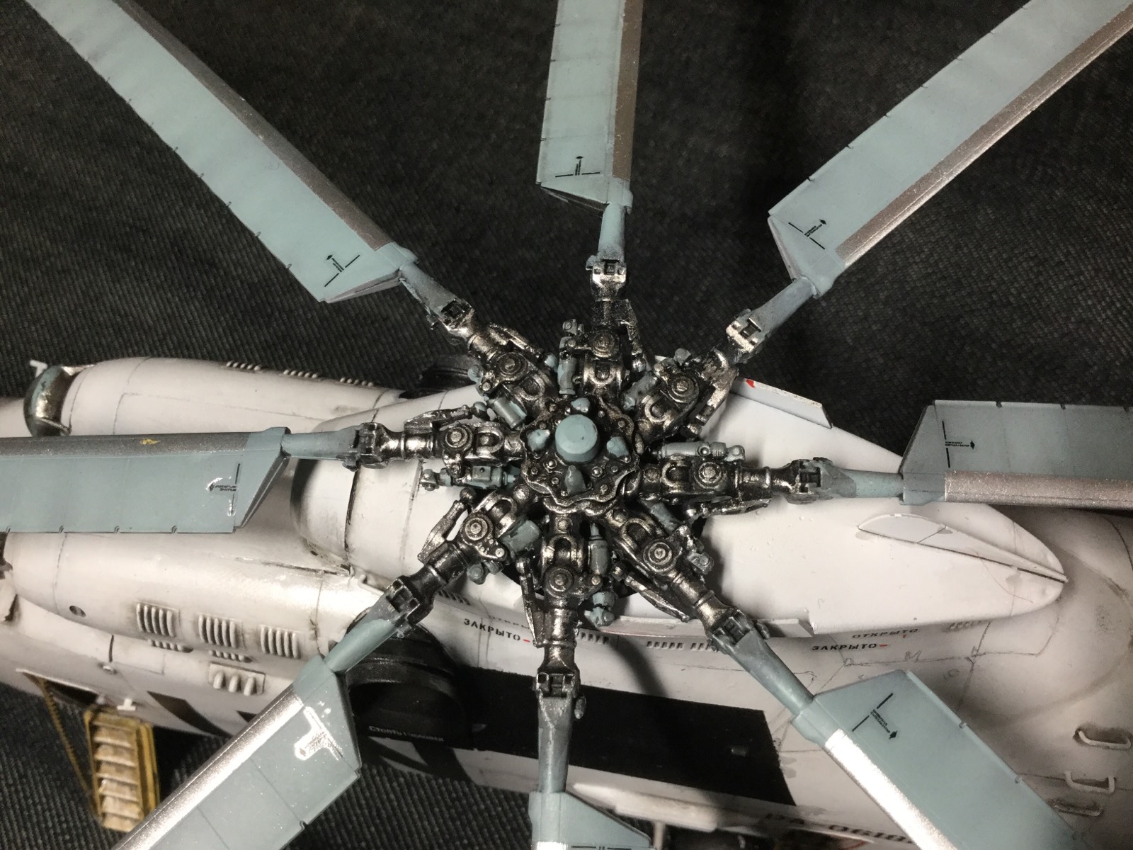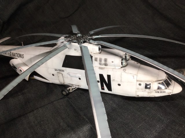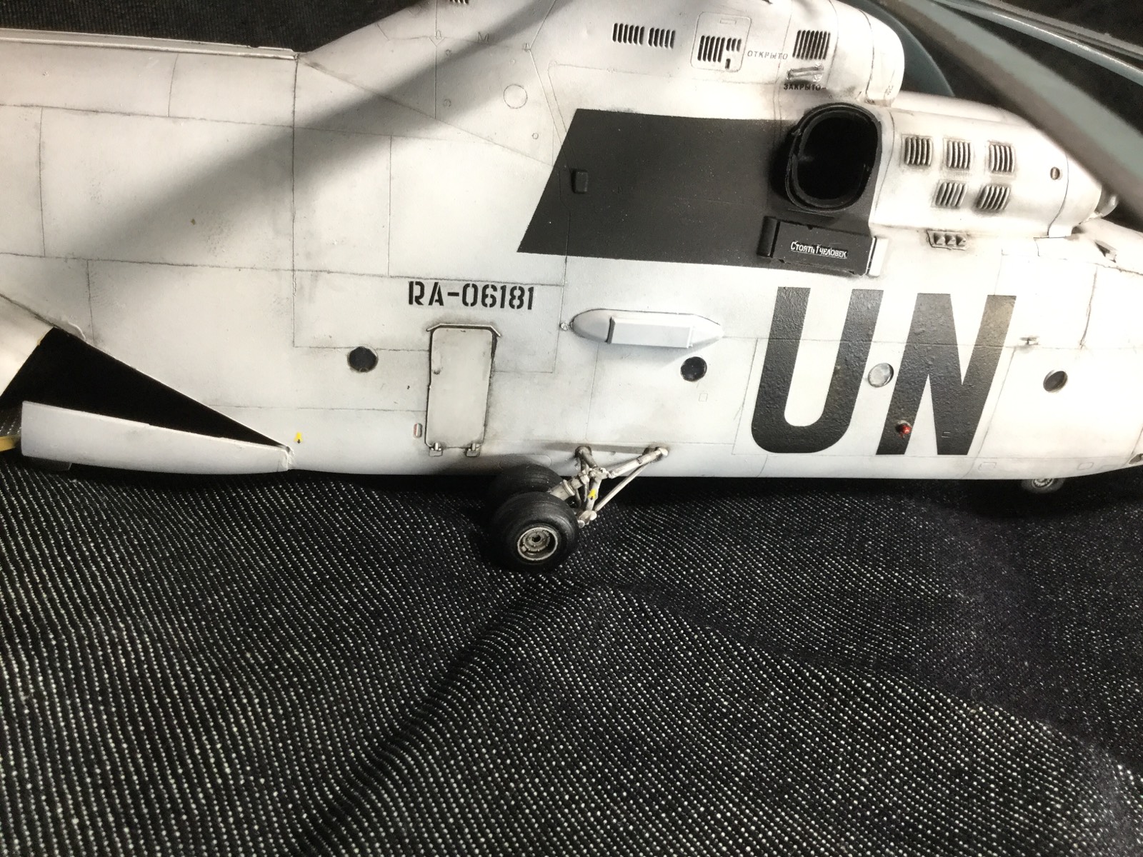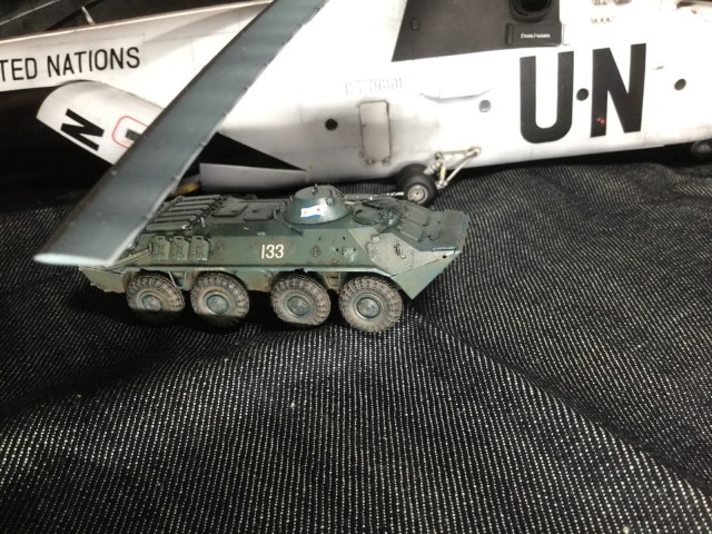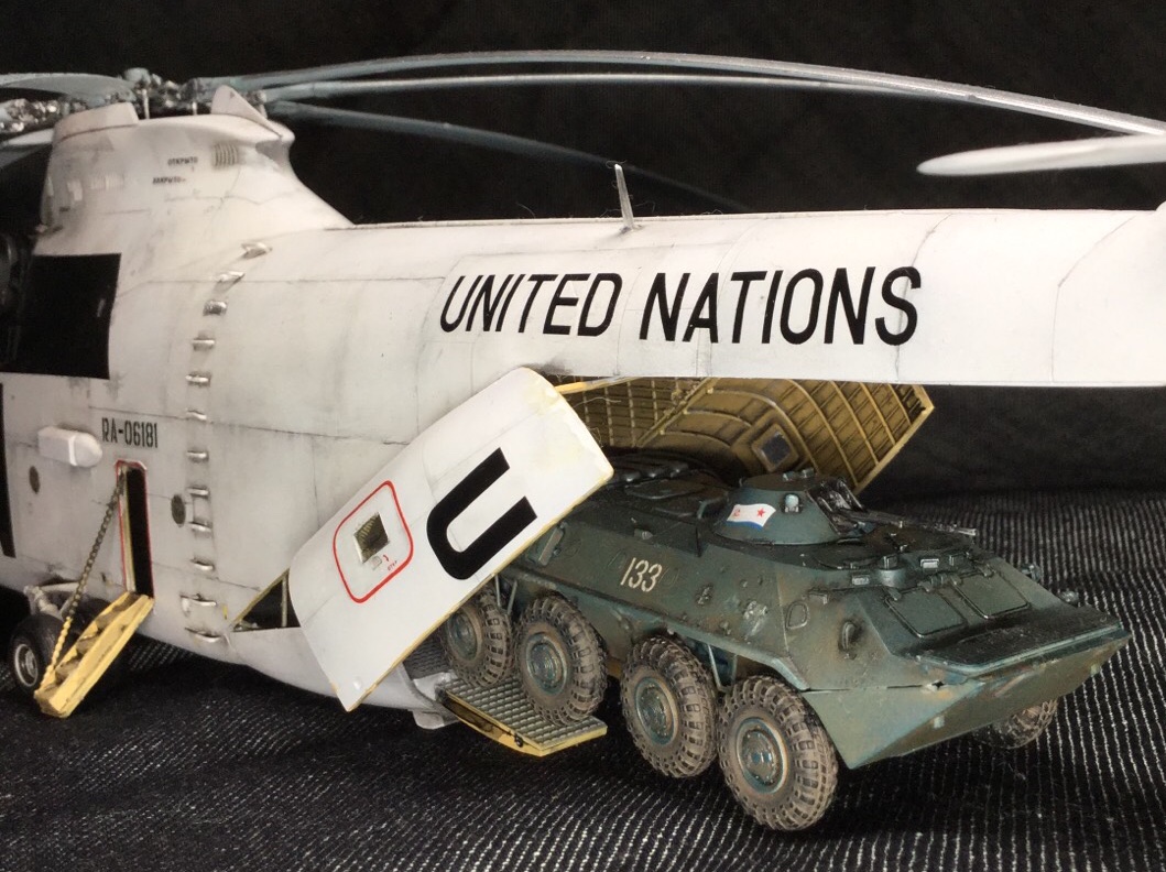 Представляю на ваш суд модель вертолета ми-26 производитель «звезда» 1:72 в окраске вооруженных сил организации объединенных наций. Аппарат делался в подарок сыну на Новый год, частично сборка им и проводилась. Сборка склейка стандартные для звезды: там криво, там доработать напильником и сгладить шпатлевкой... красилось спиртовым акрилом матовый белый от Tamiya, иммитация теней и расшивок проведена заливкой таже от Tamiya цвет черный, в походе за красками выяснилось, что грузовому вертолету не хватает груза и было решено приобрести модель бтр-70 1:72 от Trumpeter так как ничего натовского-ооновского в этом масштабе в магазине не нашлось, приобрели нашего старичка, тем более что он точно использовался миротворцами, собирался и красился бтр сыном на глаз, заливку проводил уже я, грязь на протекторах и кузове использовалась Nature Effects earth