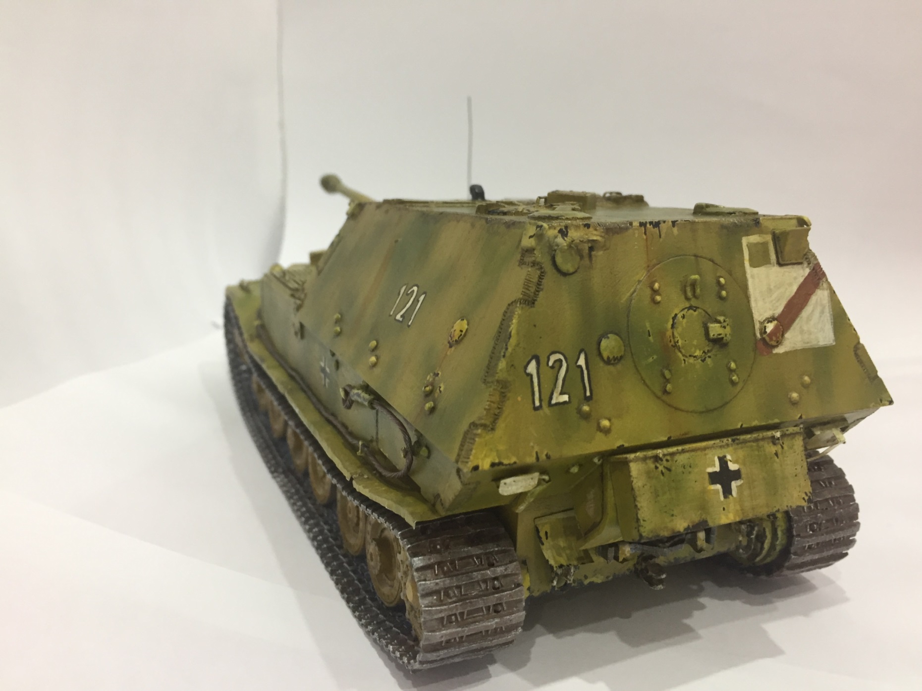 Пару лет назад когда решил вернуться к своему детскому хобби, подумал почему бы не реанимировать собранного и пылящегося без некоторых частей на полке Элефана. Клей уже детали не держал, с разбором особых трудностей не возникло. Зато вот со сборкой.... Решил сделать Фердинанда, травления нет, все что можно было заменить - заменил на детали из пивной жести. Пытался сделать по прототипу найденого на просторах интернета. Косяков конечно много ))) Но эта первая моя серьезная работа, после школьных лет.
