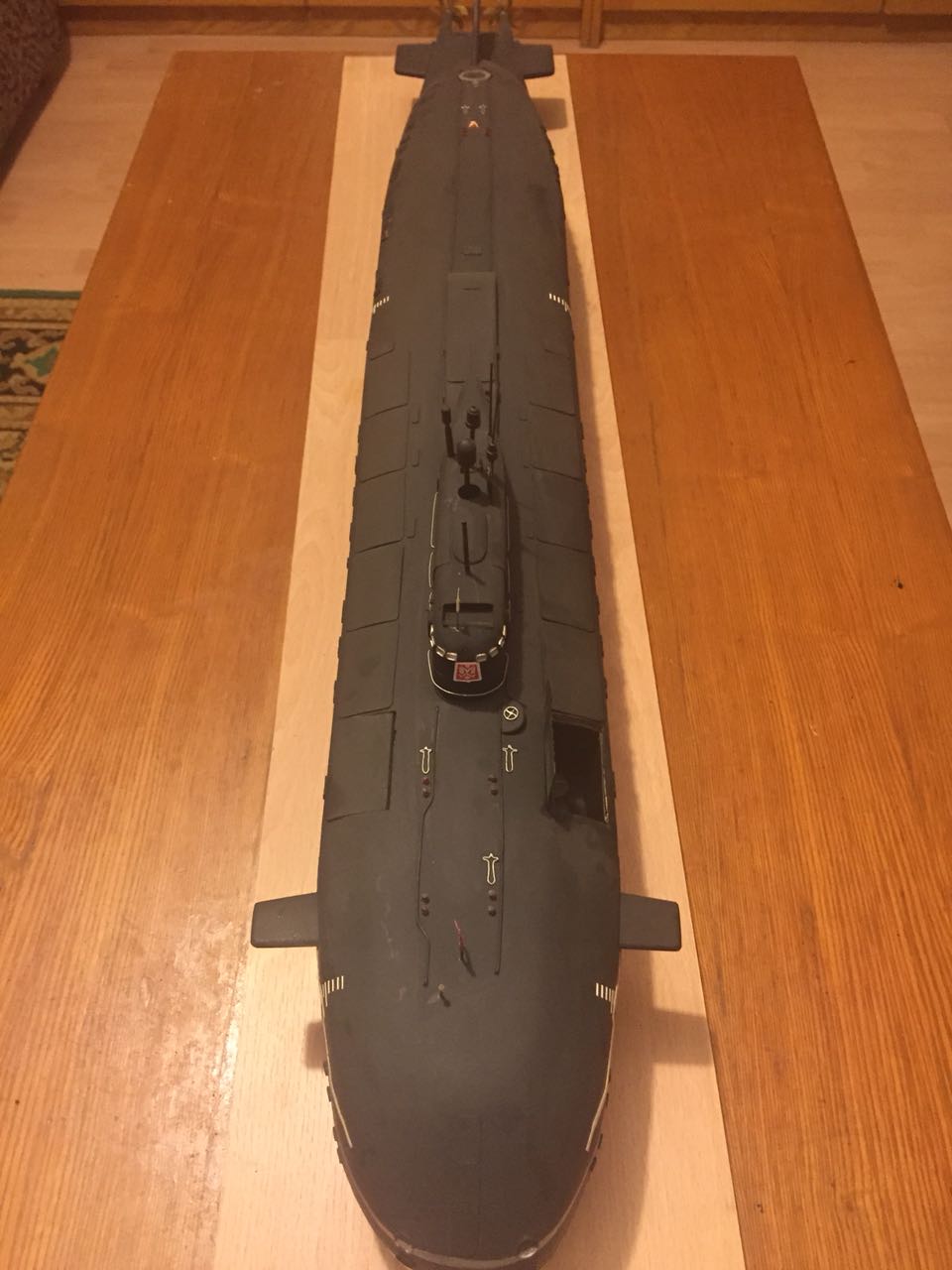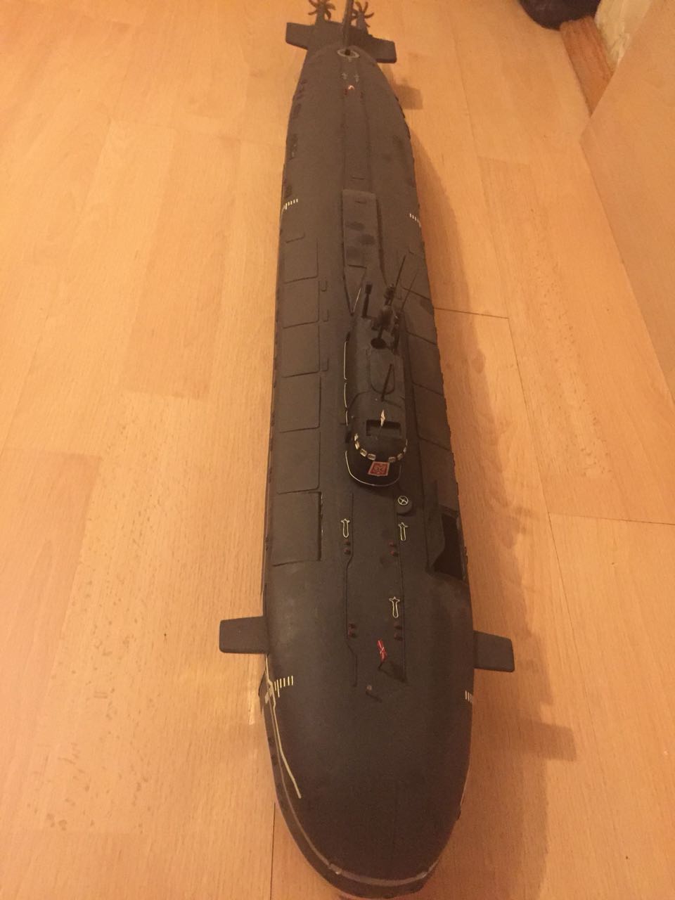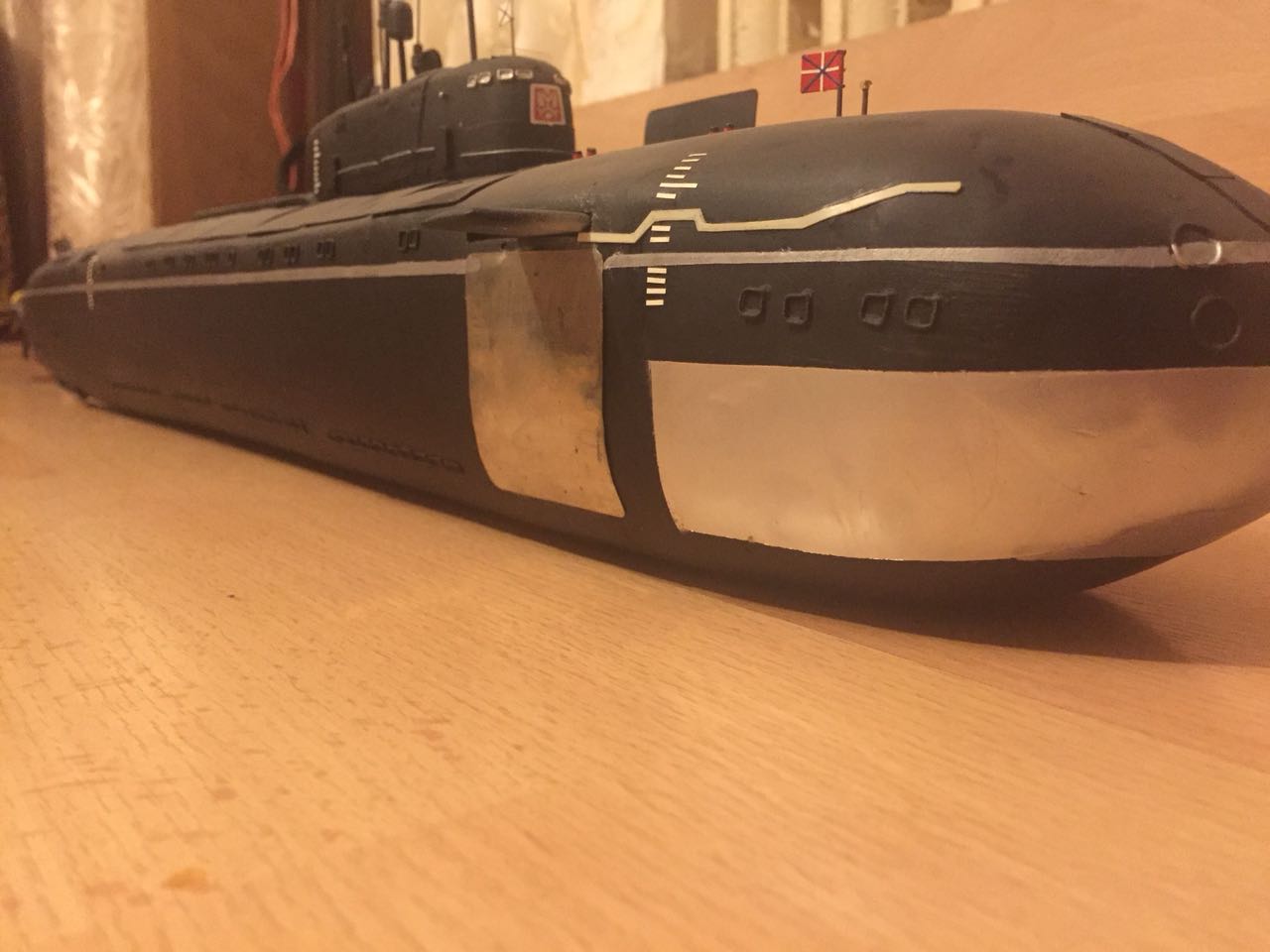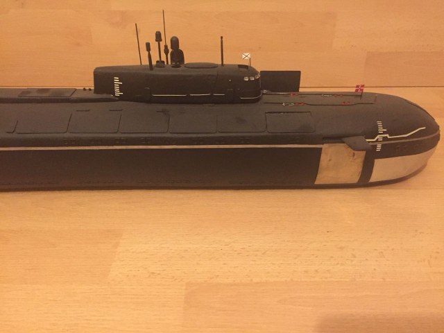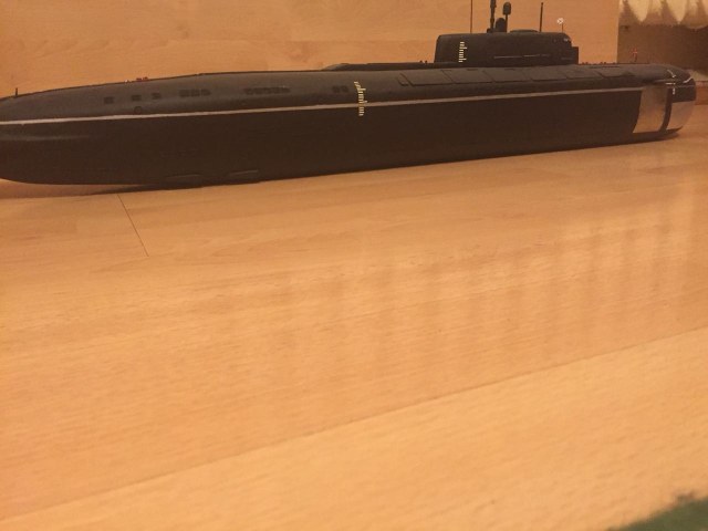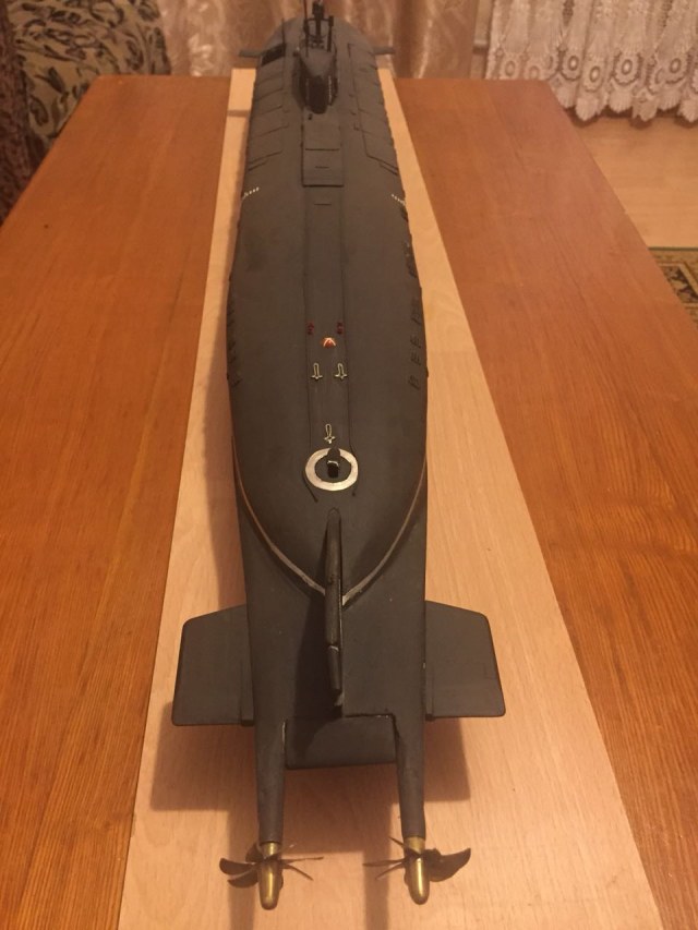 АПРК " Курск " Модель построена в 2005 год по чертежам и имеющимся на тот момент доступным фотографиям! В постройке использованы : твердый пенопласт из которого создана болванка корпуса, сверху покрыта стеклотканью с эпоксидной смолой! По прошествии пройденного времени и накопленного опыта вижу много несоответствий и недочетов! Но на тот момент это была первая лодка построенная мною по данной технологии! С того времени остались не достроены ракетные шахты с открывающимися крышками. В модели нет ни одной купленной детали!