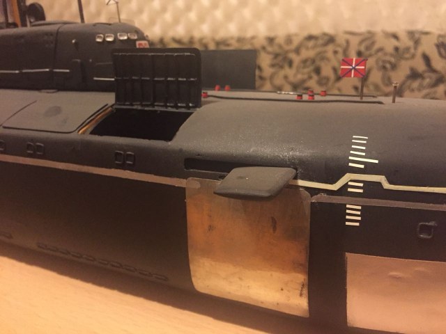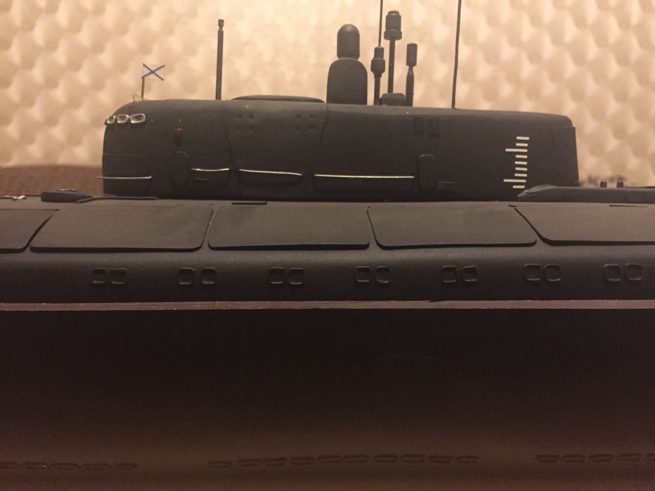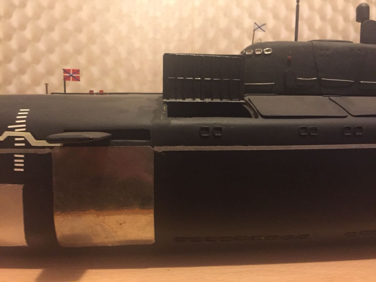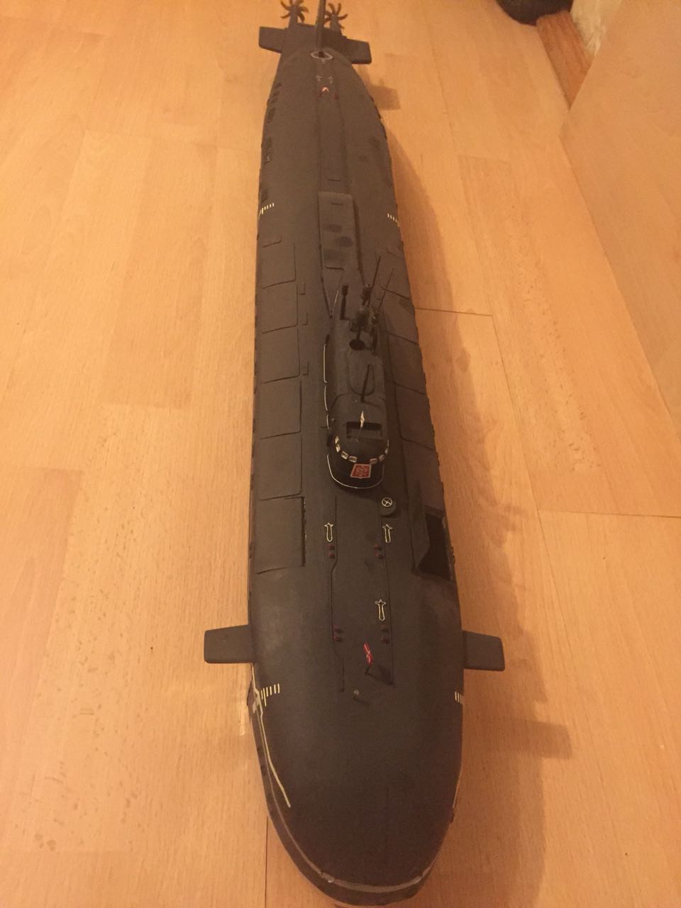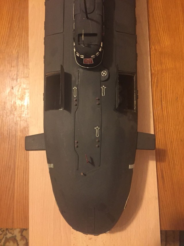 АПРК " Курск " Модель построена в 2005 год по чертежам и имеющимся на тот момент доступным фотографиям! В постройке использованы : твердый пенопласт из которого создана болванка корпуса, сверху покрыта стеклотканью с эпоксидной смолой! По прошествии пройденного времени и накопленного опыта вижу много несоответствий и недочетов! Но на тот момент это была первая лодка построенная мною по данной технологии! С того времени остались не достроены ракетные шахты с открывающимися крышками. В модели нет ни одной купленной детали!