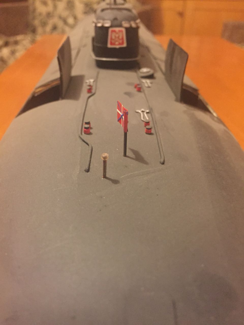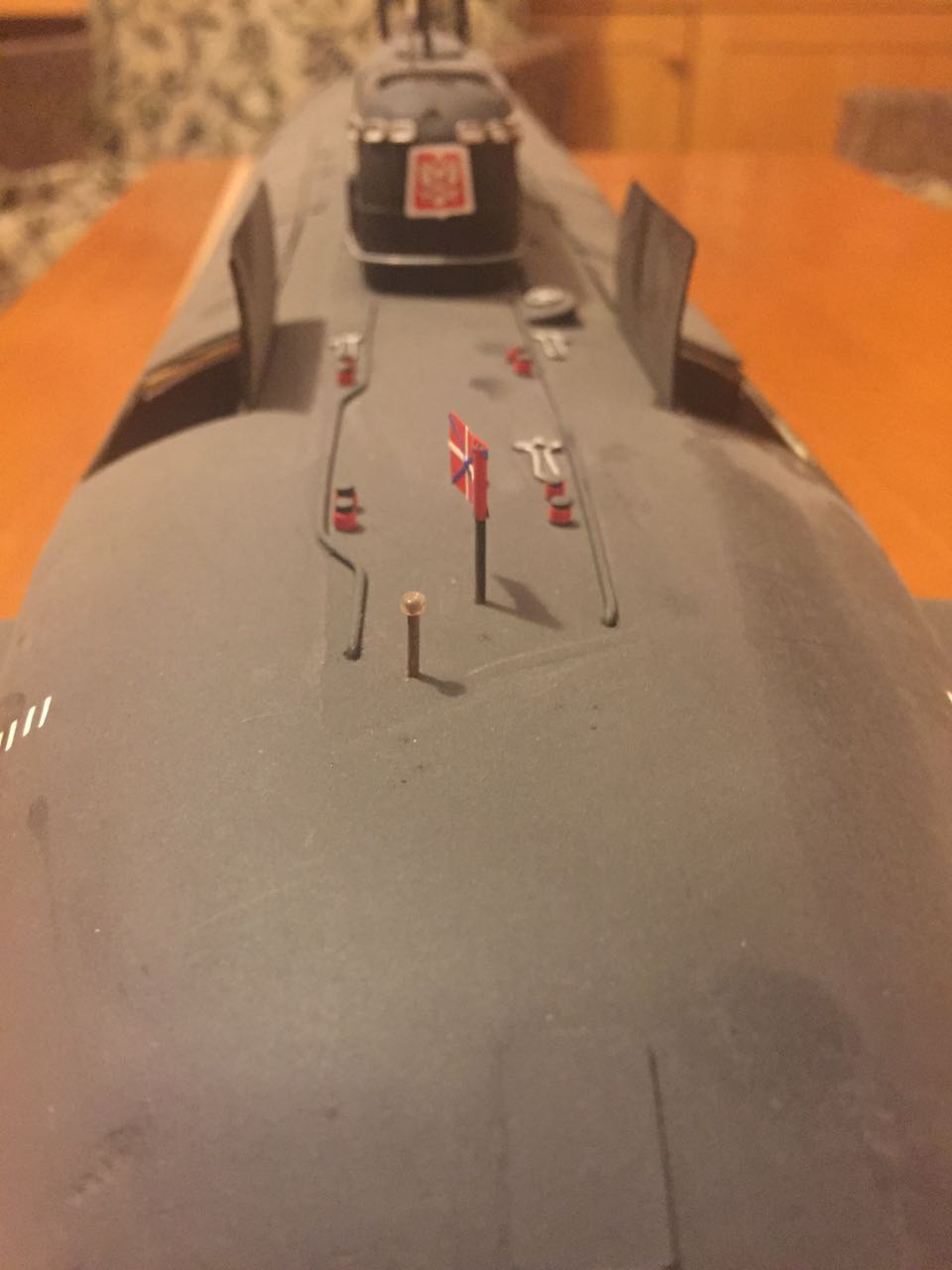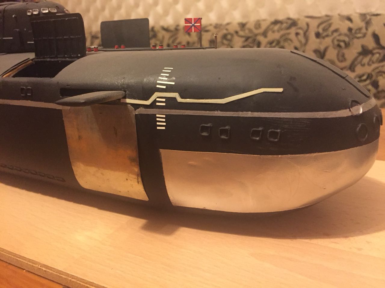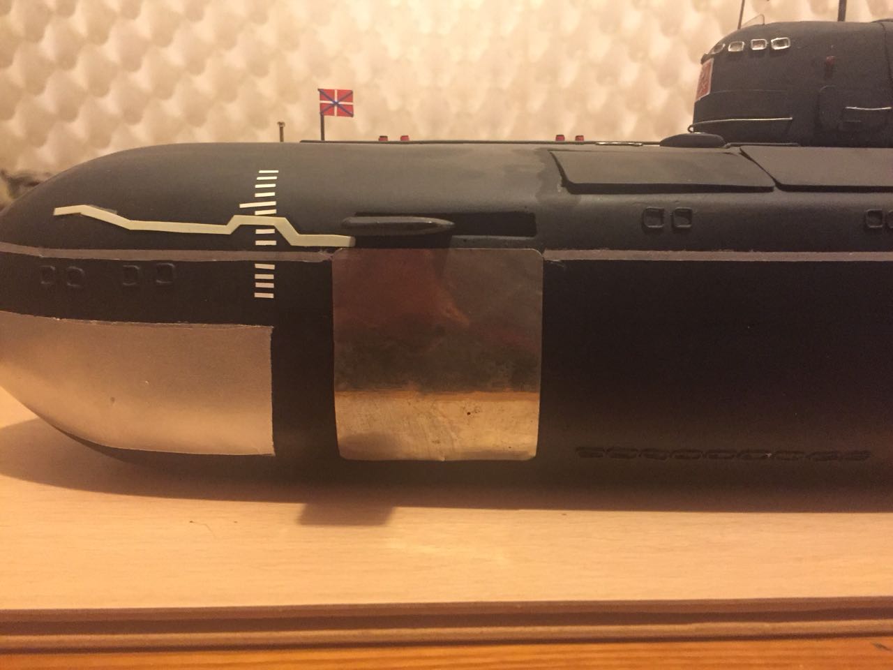 АПРК " Курск " Модель построена в 2005 год по чертежам и имеющимся на тот момент доступным фотографиям! В постройке использованы : твердый пенопласт из которого создана болванка корпуса, сверху покрыта стеклотканью с эпоксидной смолой! По прошествии пройденного времени и накопленного опыта вижу много несоответствий и недочетов! Но на тот момент это была первая лодка построенная мною по данной технологии! С того времени остались не достроены ракетные шахты с открывающимися крышками. В модели нет ни одной купленной детали!