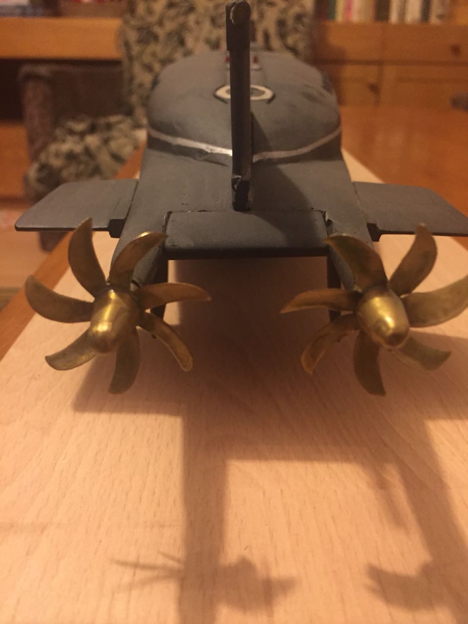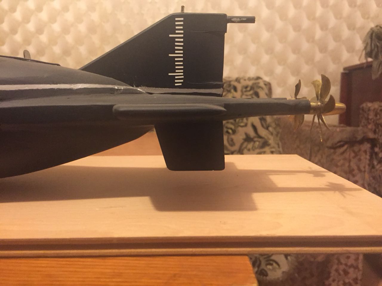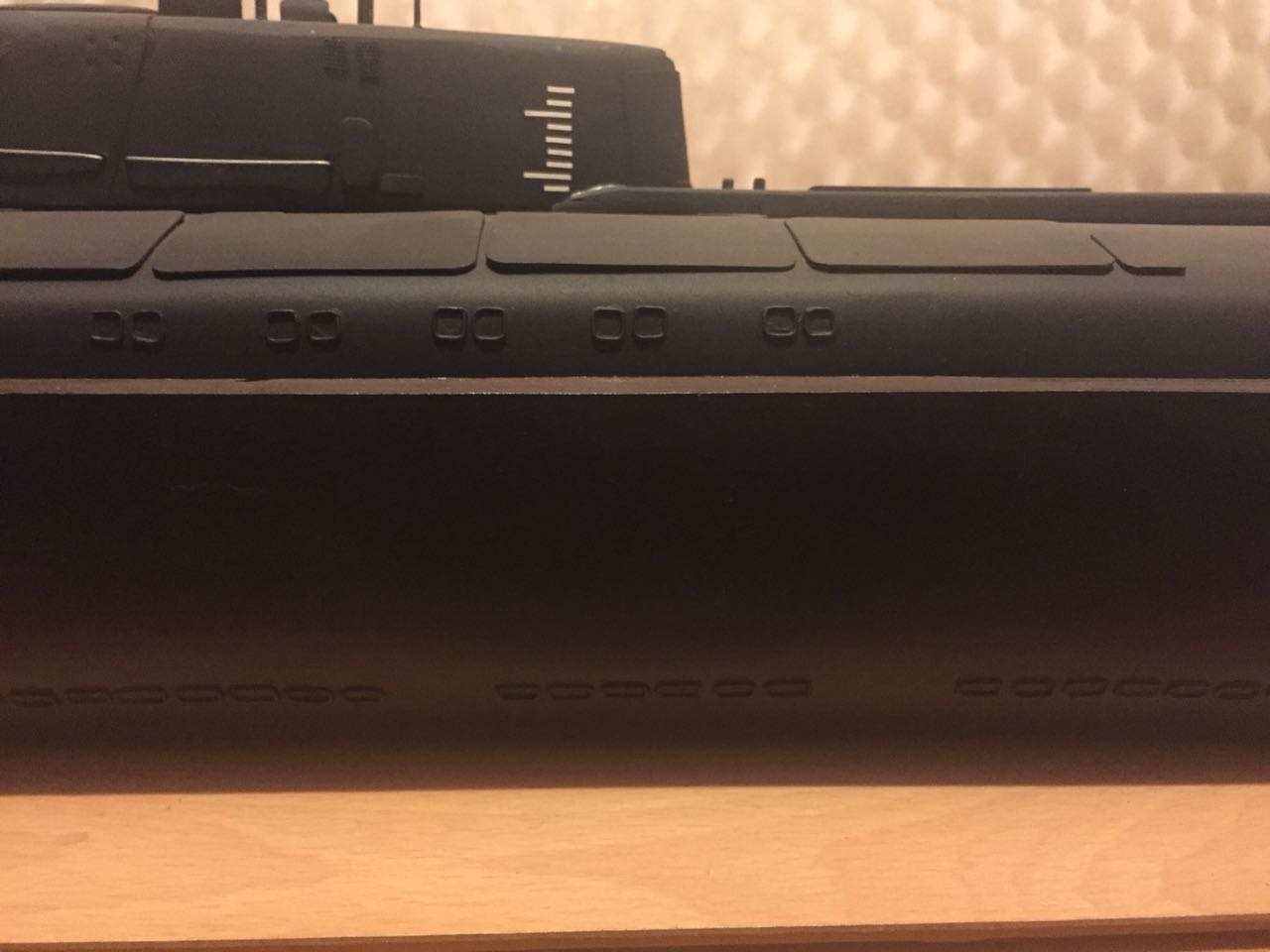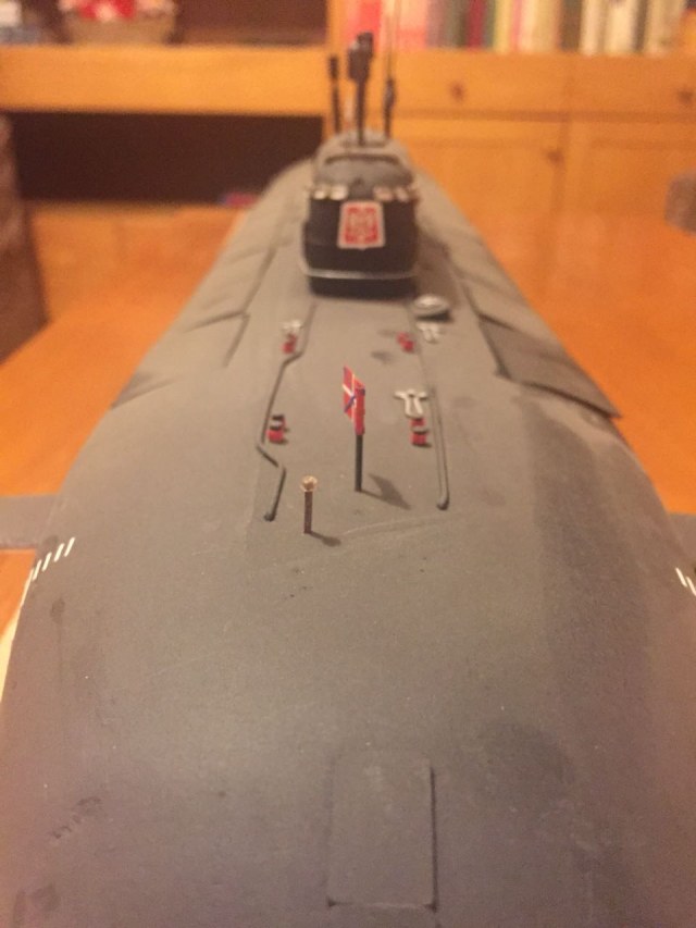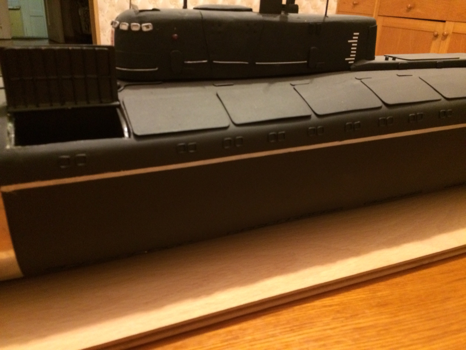 АПРК " Курск " Модель построена в 2005 год по чертежам и имеющимся на тот момент доступным фотографиям! В постройке использованы : твердый пенопласт из которого создана болванка корпуса, сверху покрыта стеклотканью с эпоксидной смолой! По прошествии пройденного времени и накопленного опыта вижу много несоответствий и недочетов! Но на тот момент это была первая лодка построенная мною по данной технологии! С того времени остались не достроены ракетные шахты с открывающимися крышками. В модели нет ни одной купленной детали!