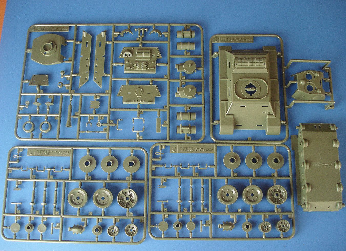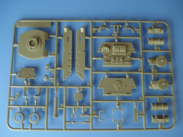 В плотной картонной коробке с боковой загрузкой находятся 4 литника с деталями и нижняя часть корпуса зеленого цвета,виниловые гусеницы,декаль и инструкция по сборке на русском языке.Модель собирается без клея отличный подарок для ребенка делающего первые шаги в моделизме.