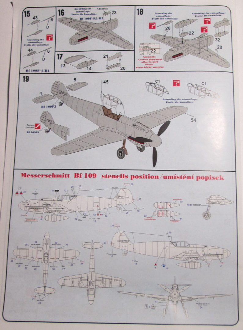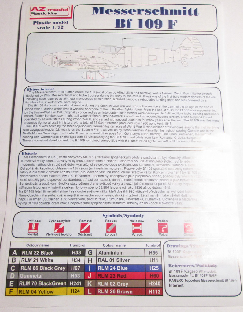 Внутри два литника+один с прозрачными деталями+декаль+инструкция. Вот о ней пару слов. Не то, что бы она была плохая, но какая-то уж слишком универсальная, особенно, это ощущается, когда собираешь линейку "Мессеров" от этого производителя модификации "G", да и в этой модели тоже. Литники отличного качества, без брака. Декаль на три варианта, хорошего качества, так же, в наличие довольно неплохая техничка, которая дается почему-то с модификации "G". Интересно: сэкономили или, все же они идентичны?