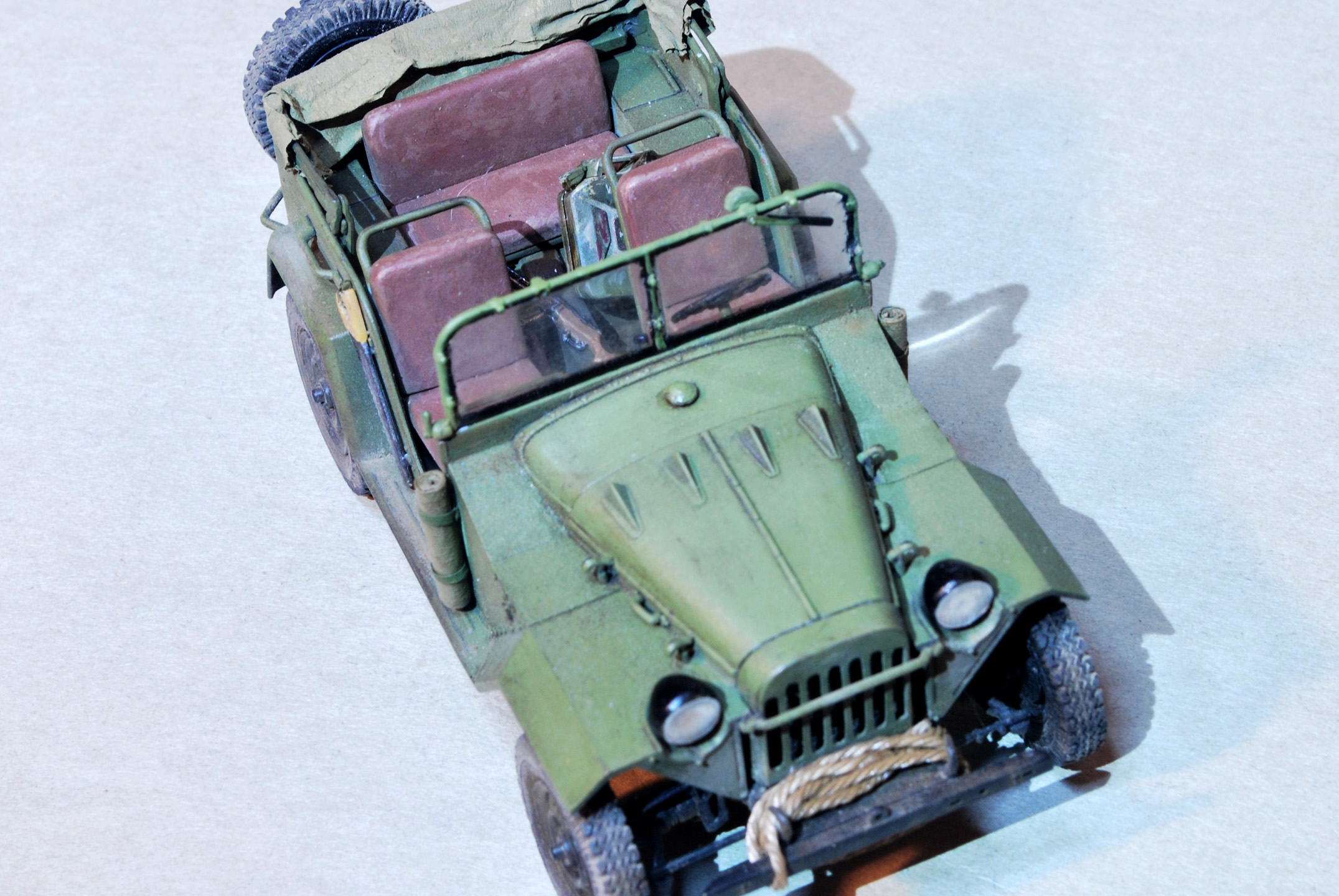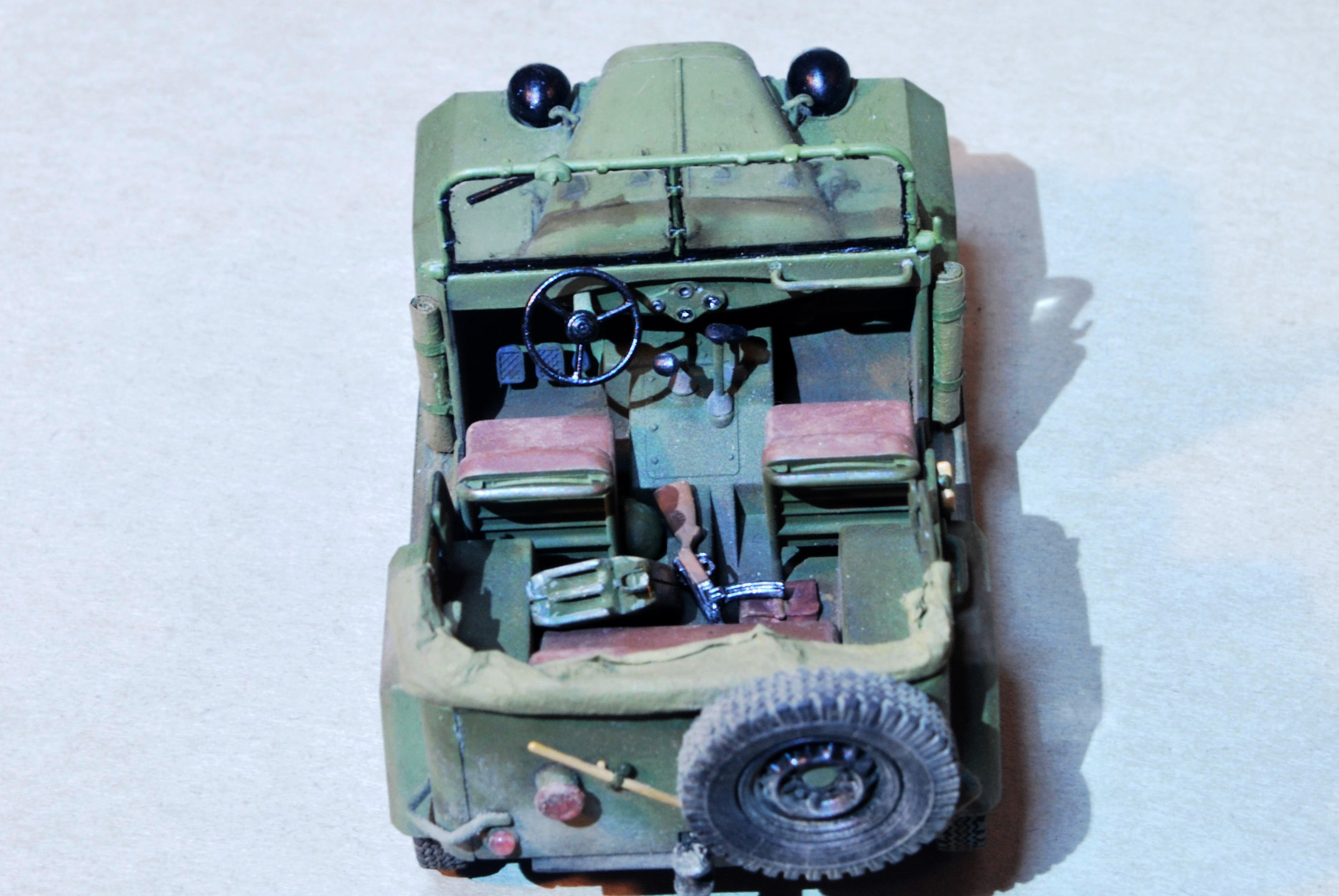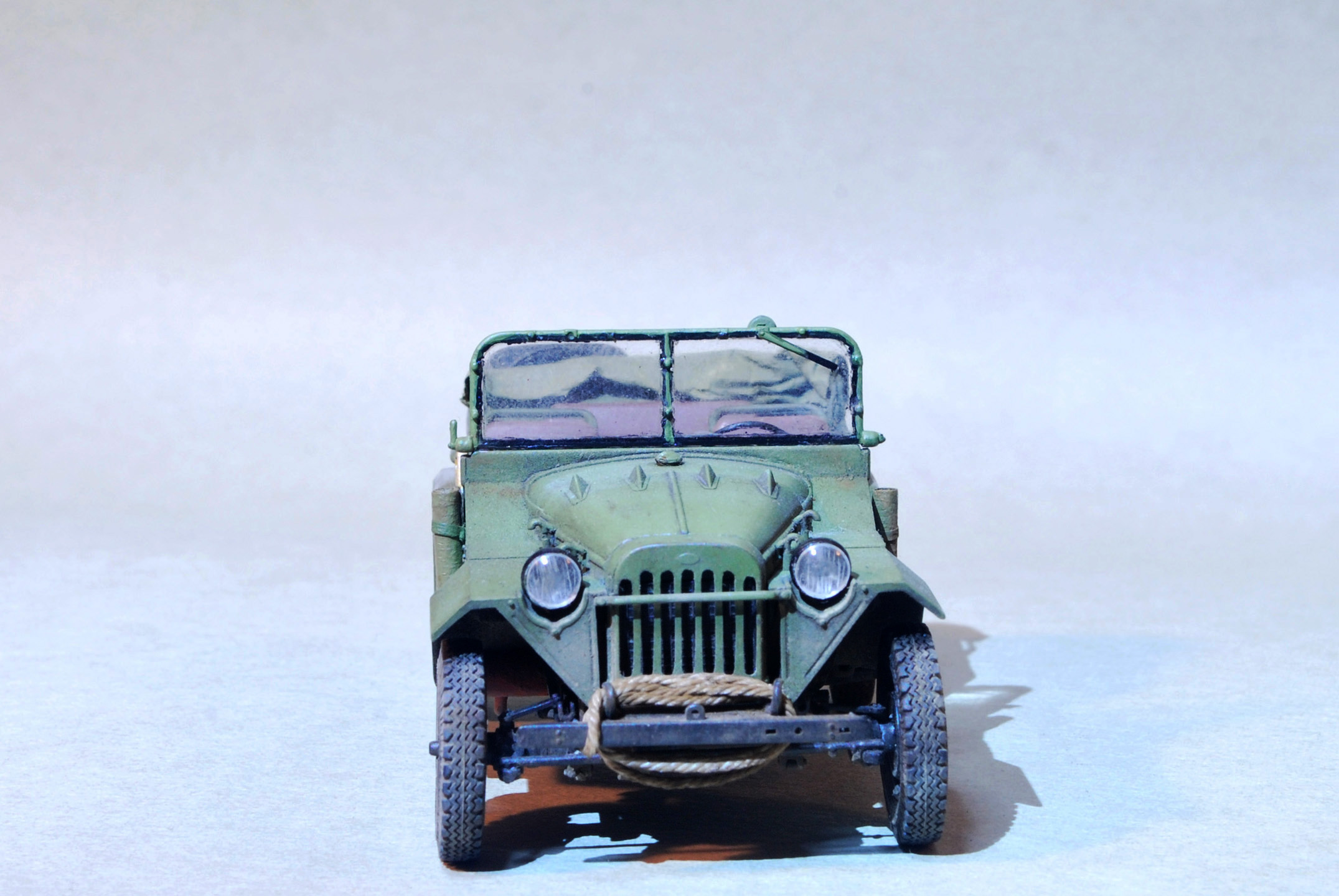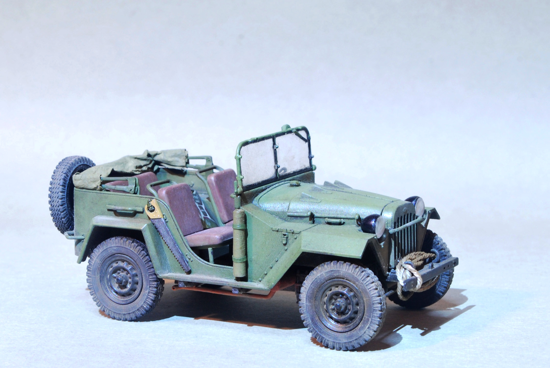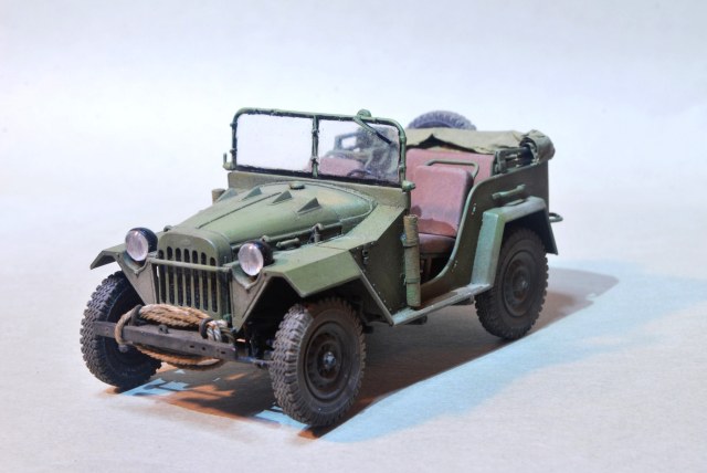 Модель собрана из очень детализированного набора "Soviet GAZ-67B Military Vehicles 02346" от Trumpeter в масштабе 1/35. В набор входит фототравление и резиновые покрышки хорошего качества. Сборка в целом была приятна, бывало что приходилось бороться с очень мелкими деталями подвески.