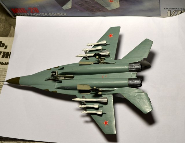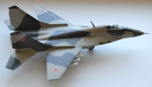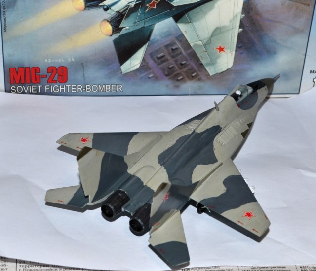 Отдал МиГа младшему на участие в благотворительной ярмарке в школе - ведь именно он стал инициатором завершения этого макета, вот "замкнул круг". Теперь буду собирать новый 9-12 от Звезды, говорят он на порядок точнее этой поделки.