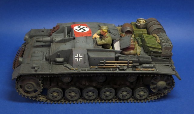 Неплохой штуг. Мне не хватило местами смывки и пыли. Задние фонари закрашены в базу. Непонятно, как крепятся зап.траки справа от орудия. Понравились запасы на корме. В целом доработать немного и будет гуд)