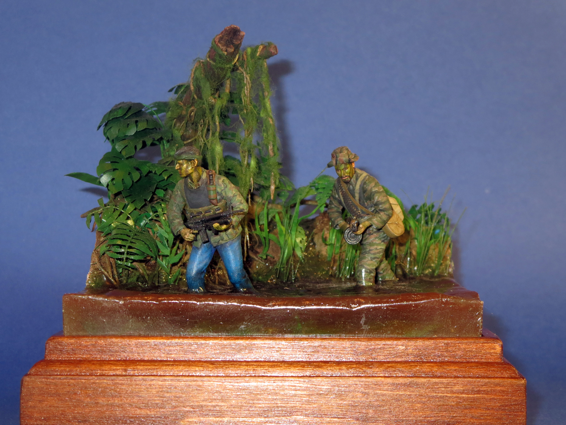 В целом понравилось! Растения из травлёной меди на мой взгляд, удались. Два замечания. Первое - края "воды". В настоящем виде они портят впечатление от работы. Будет лучше их чем то прикрыть, например тонкими полосками бамбука - будет "в тему". Второе - РПД(видимо, изъятый в качестве трофея у дрэгоновского же северовьетнамского сапёра) с таким обрубком ствола небоеспособен. Стоит либо восстановить утраченные части оружия, либо выдать бойцу положенный ему "по штату" М60 с укороченным стволом, или "Стоунер"-63, которым вооружён второй пулемётчик из этого набора.