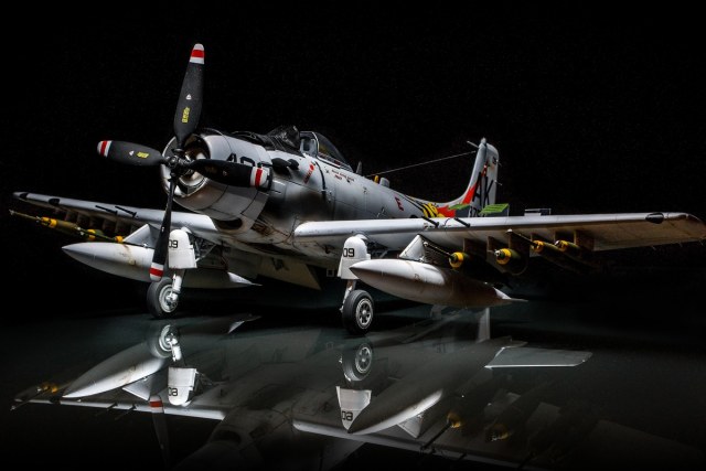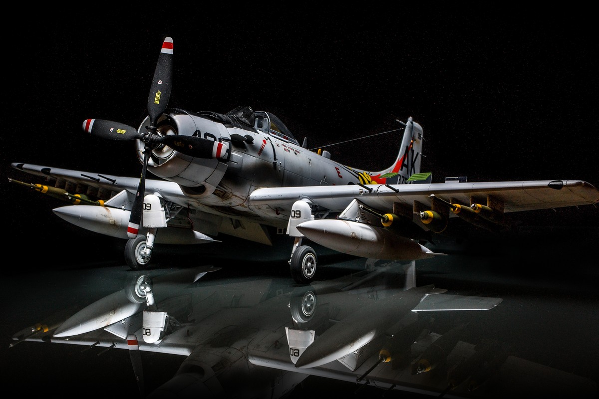 Про сам самолёт рассказывать не имеет смысла – достаточно много информации можно найти в интернете. Модель этой фирмы я собирал впервые. И не смотря, что я ворчал постоянно во время работы , модель оставила о себе неплохое впечатление. Хотя камешки в «огород» побросать можно. У меня в коробке было 2 варианта – можно было собрать палубный вариант в «серой «окраске» А-1Н и модификацию А-1Jв камуфляжной окраске. Модель комплектуется и разными вариантами декалей, и литниками с отличающимися деталями. Я выбрал вариант А-1Р с бортовым номером 409.