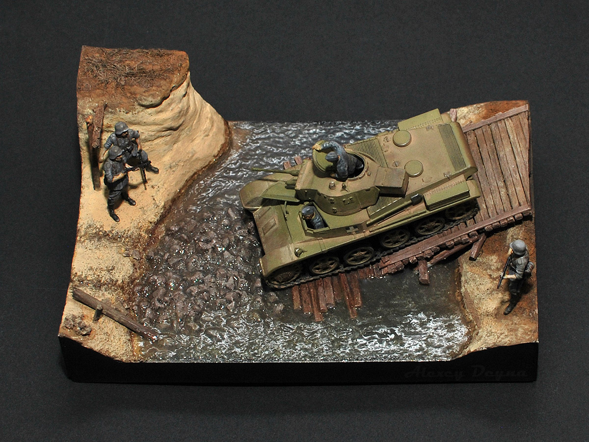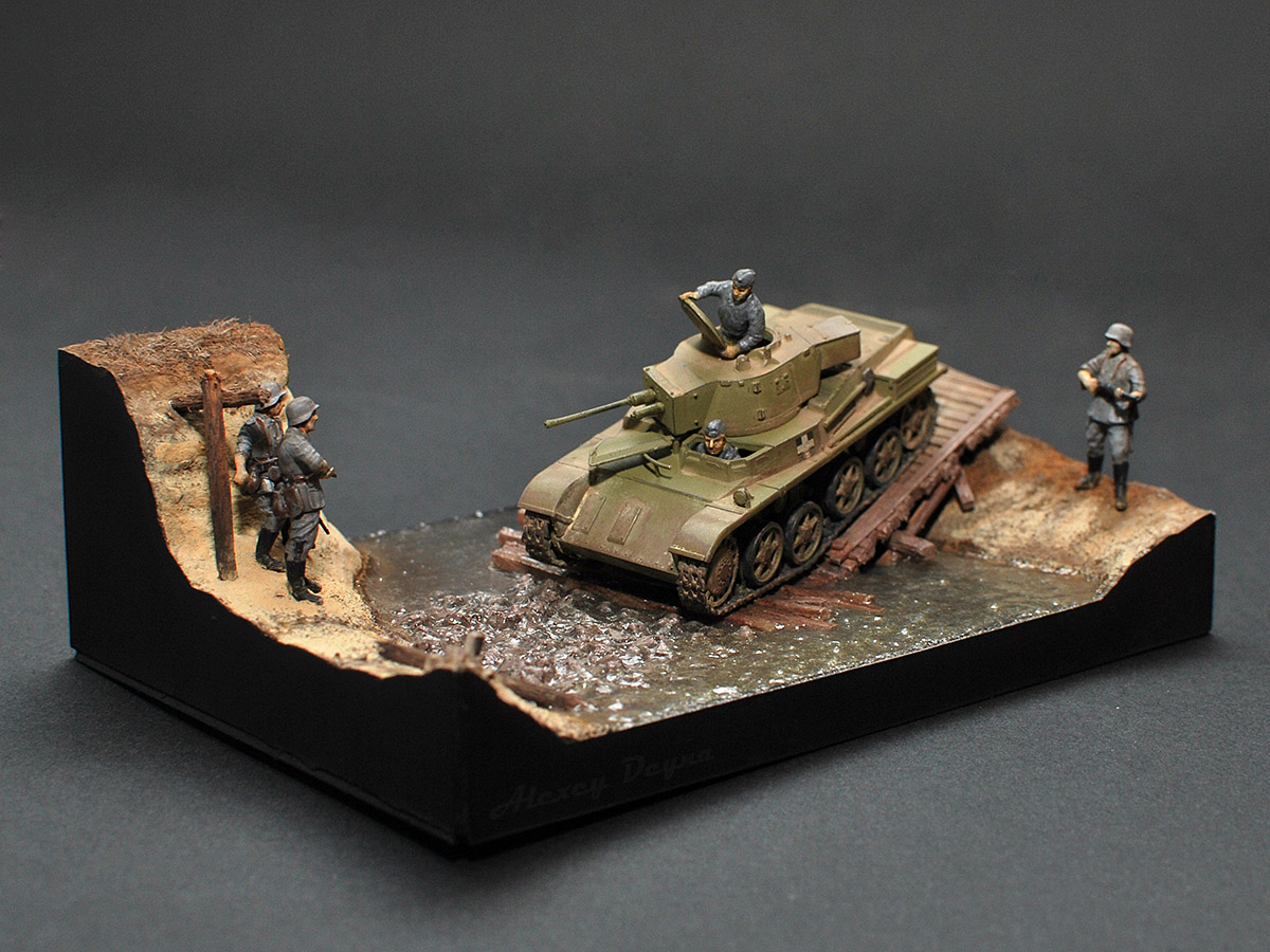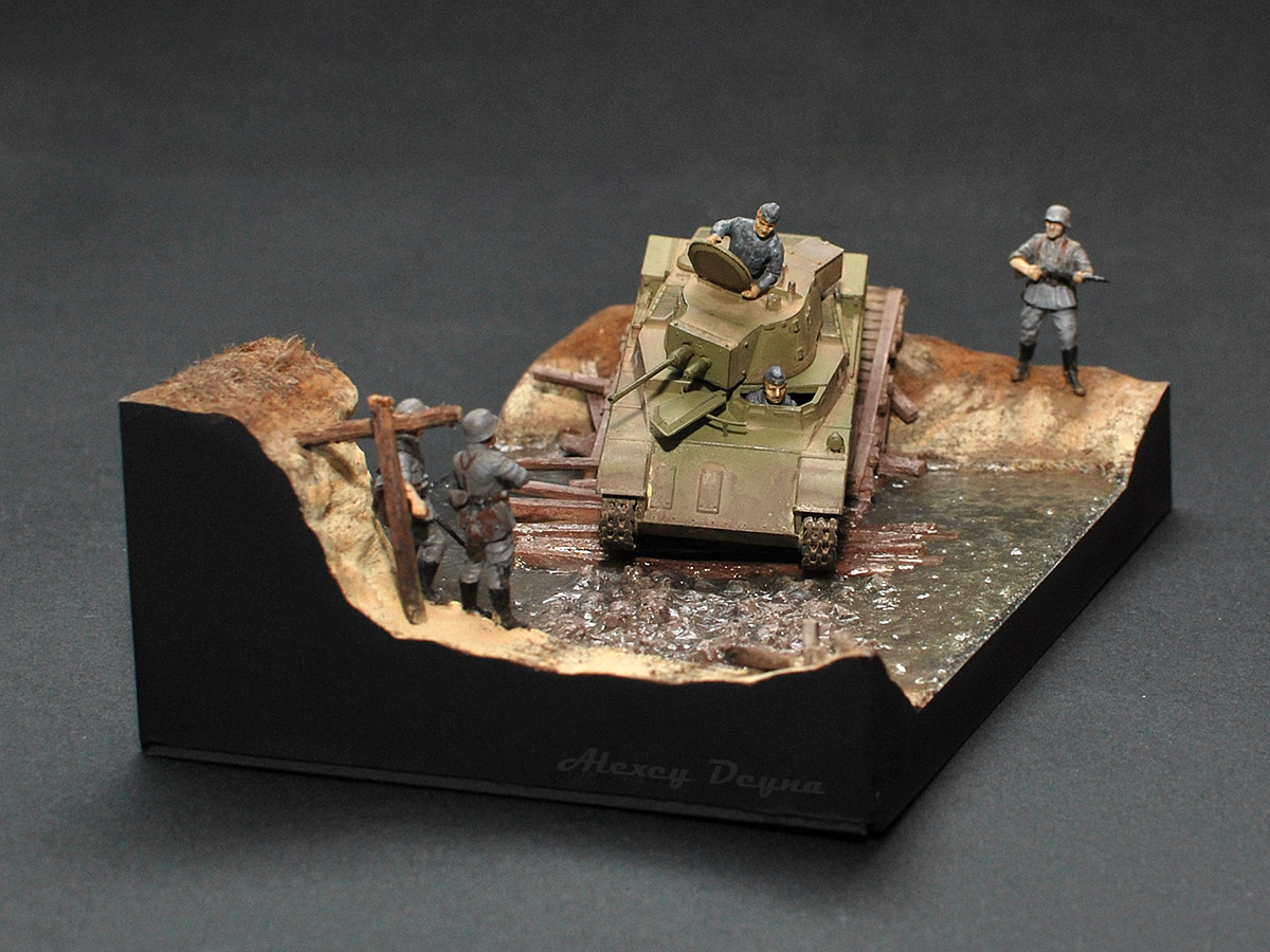 Очень прям здорово вышли фигурки экипажа: позы такие натуральные, видно что и механик-водитель, и командир сосредоточены на происходящем, смотрят внимательно, как идёт машина по мостику.