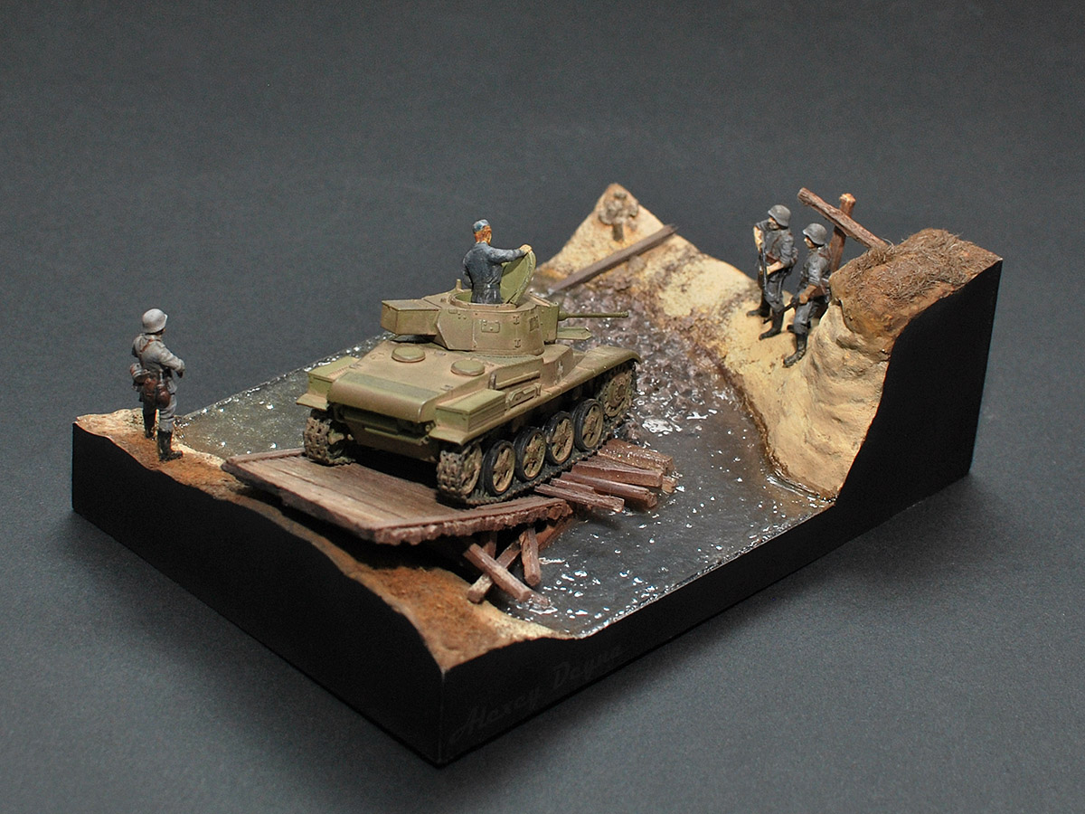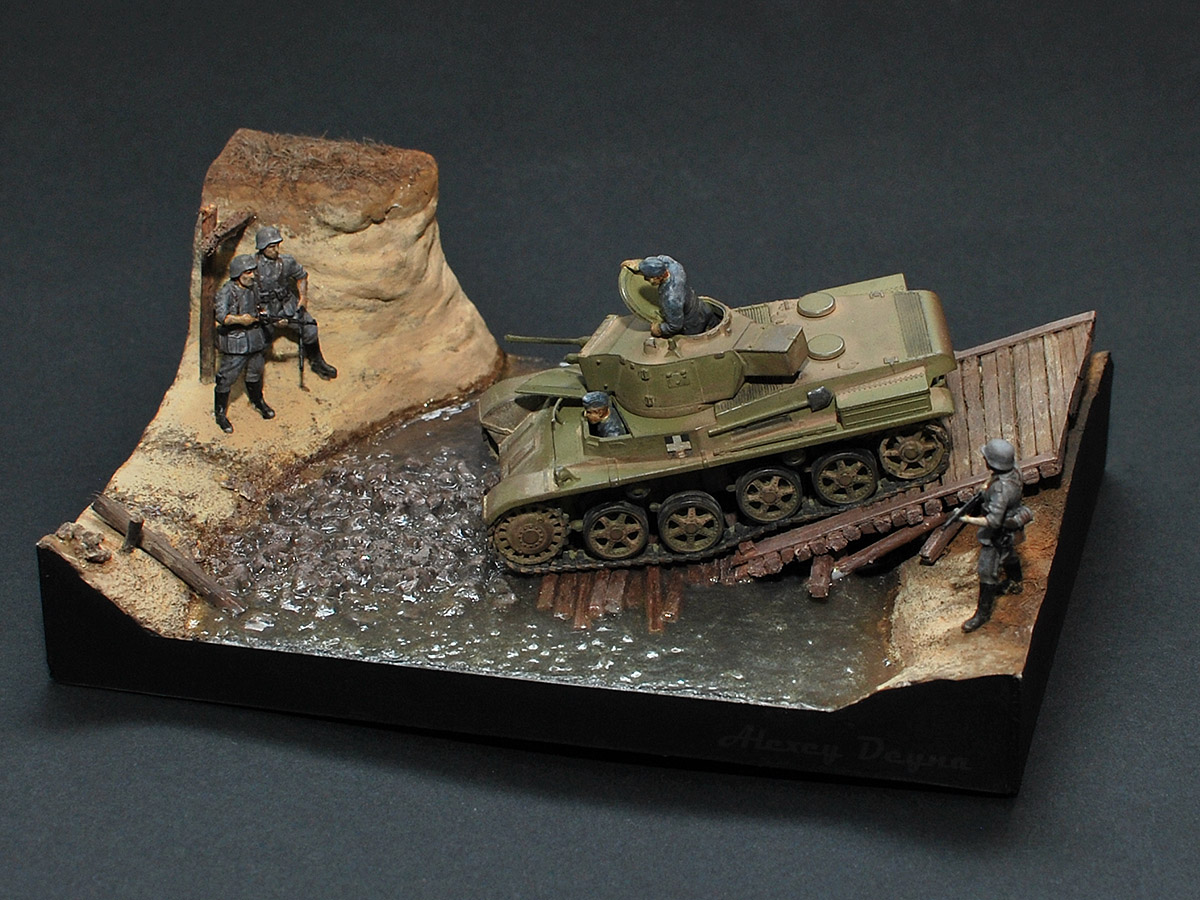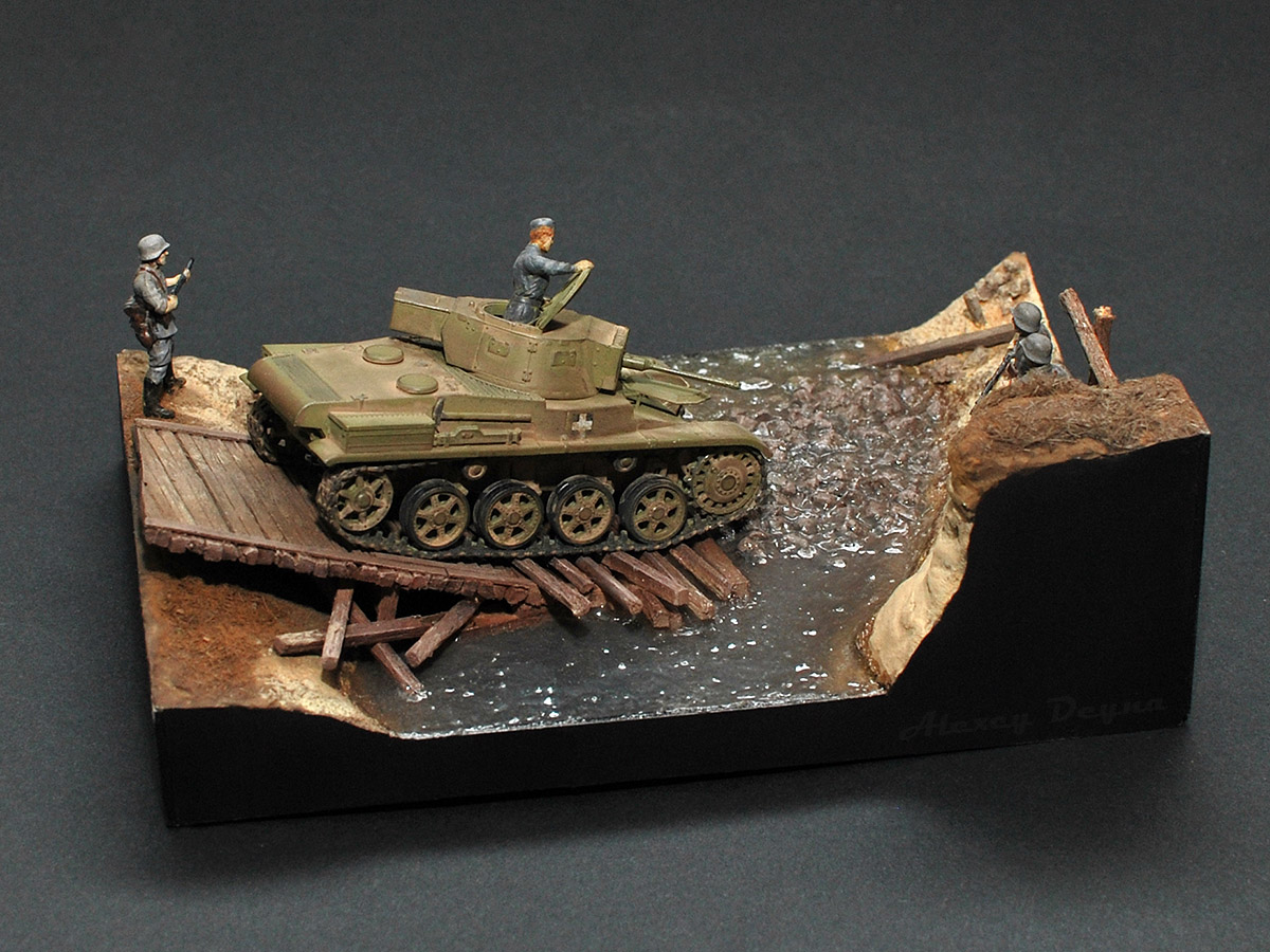 Очень прям здорово вышли фигурки экипажа: позы такие натуральные, видно что и механик-водитель, и командир сосредоточены на происходящем, смотрят внимательно, как идёт машина по мостику.