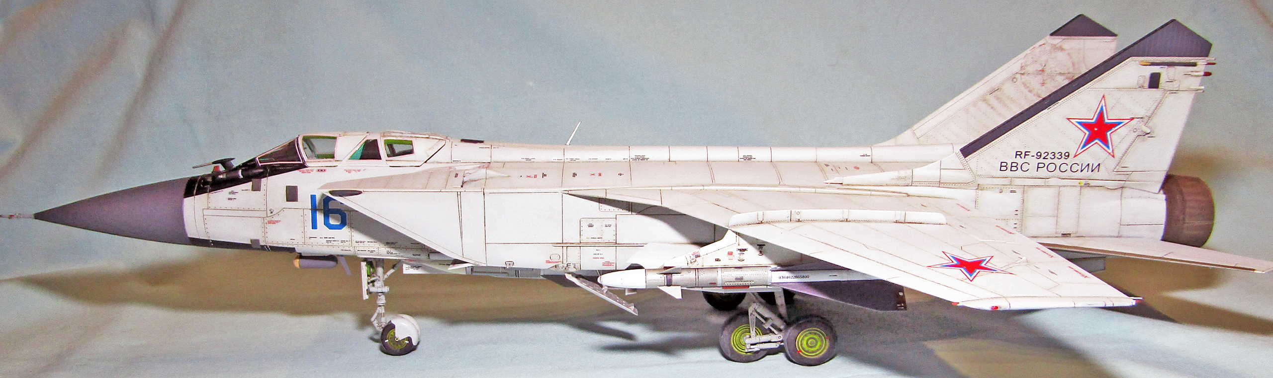 Здравствуйте уважаемые коллеги. Представляю на Ваш суд свою крайнюю модель, окрашенную кистью, так как в конце сборки наконец появился аэрограф. Модель перехватчика делал на заказ в течение 1,5 месяцев по ночам (где-то по 2 часа). На название вдохновила одноименная песня Н. Анисимова. Это мой первый опыт сборки реактивной авиации в 48-м масштабе. Набор от AMKсам по себе, на мой взгляд, идеален. Однако, ввиду моей неопытности и спешки наделал массу косяков, из основных: плохо состыкован узел кабины к основному «телу» фюзеляжа, неоднократно потерянные и поломанные штырьки гидравлики и ПВД (заменил на иглы), некачественно сведены декали (наносил перед смывкой и без применения специальной жидкости) и т.д. Также, мой косяк в части матчасти заключается в несоответствии реальному борту под номером 16, а именно: прозрачное остекление фонаря вместо тонированного, наличие заправочной штанги которой вообще не должно быть, цвет фюзеляжа слишком выцветший и состаренный, чёрная антибликовая поверхность слишком высоко заползла на переплёт лобового остекления фонаря и ещё по мелочам…К такому результату меня привела нарушенная последовательность выполнения работ (сначала спросил у заказчика какое сделать остекление - прозрачное или тонированное, а только потом направил ему варианты покраски). По покраске: грунтовал аэрозолью, красил мастер акрилом от звезды, аканом и эмалями от revell. Фонарь маскировал обычным малярным скотчем (еле очистил потом от остатков клея). После покраски покрывал глянцевым аэрозольным лаком, смывал MIG’ом. Задувал всё матовым лаком revellиз уже новенького аэра (первый опыт применения). В принципе описал всё что мог, оценивать прошу не как конкретный борт, а собирательный образ данного агрегата, приятного просмотра…