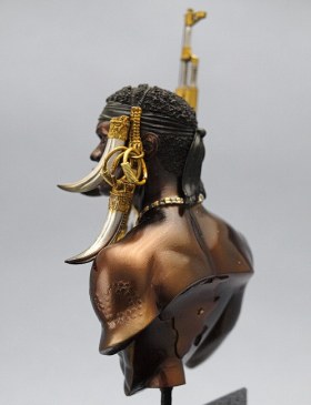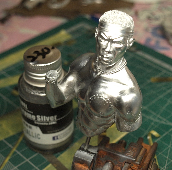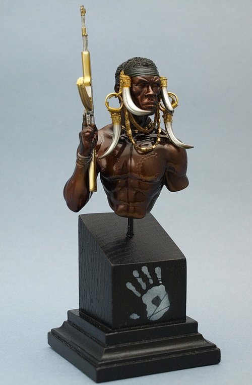 Собран и окрашен в "компанию у телевизора" двум деревянным африканским котам. Отчего и имеет такой дикий внешний вид. Сборка проста, тк деталей совсем чуть и очень качественное литьё, без мусора и прочих резиновых прелестей. Немножко сгладил скарификацию на торсе и плечах и сменил шомпол у АК на проволочный. Окраска -аэр, основа Сильверметаллик от "Гайи" седьмой серии, тамиёвские цветные лаки и чуть черной и темнозелёной эмалей XF серии в нужных местах. Финиш- глянцевый лак от "Тамии". "Длань Сарумяна" на подставочке, чтобы боец племенную извёстку не забывал. Всем причастным мой почёт и уважение. Коллегам по увлечению сердечный привет!