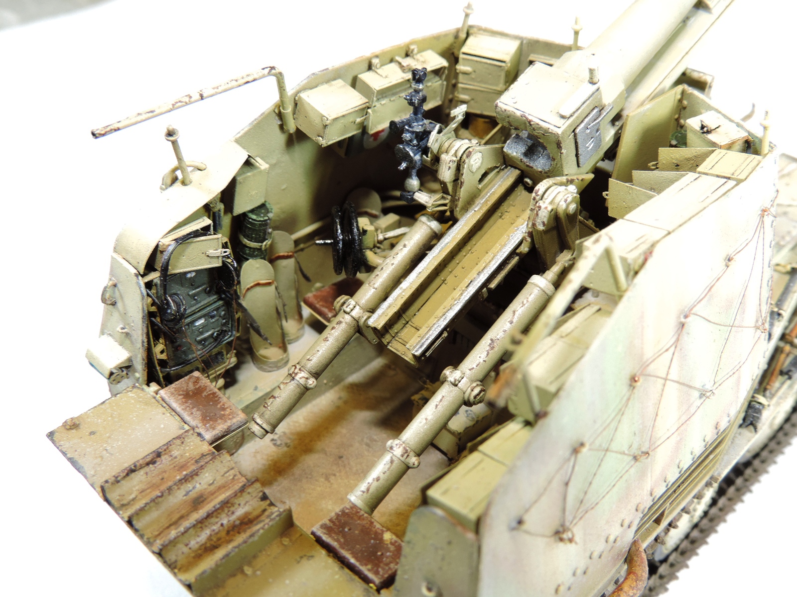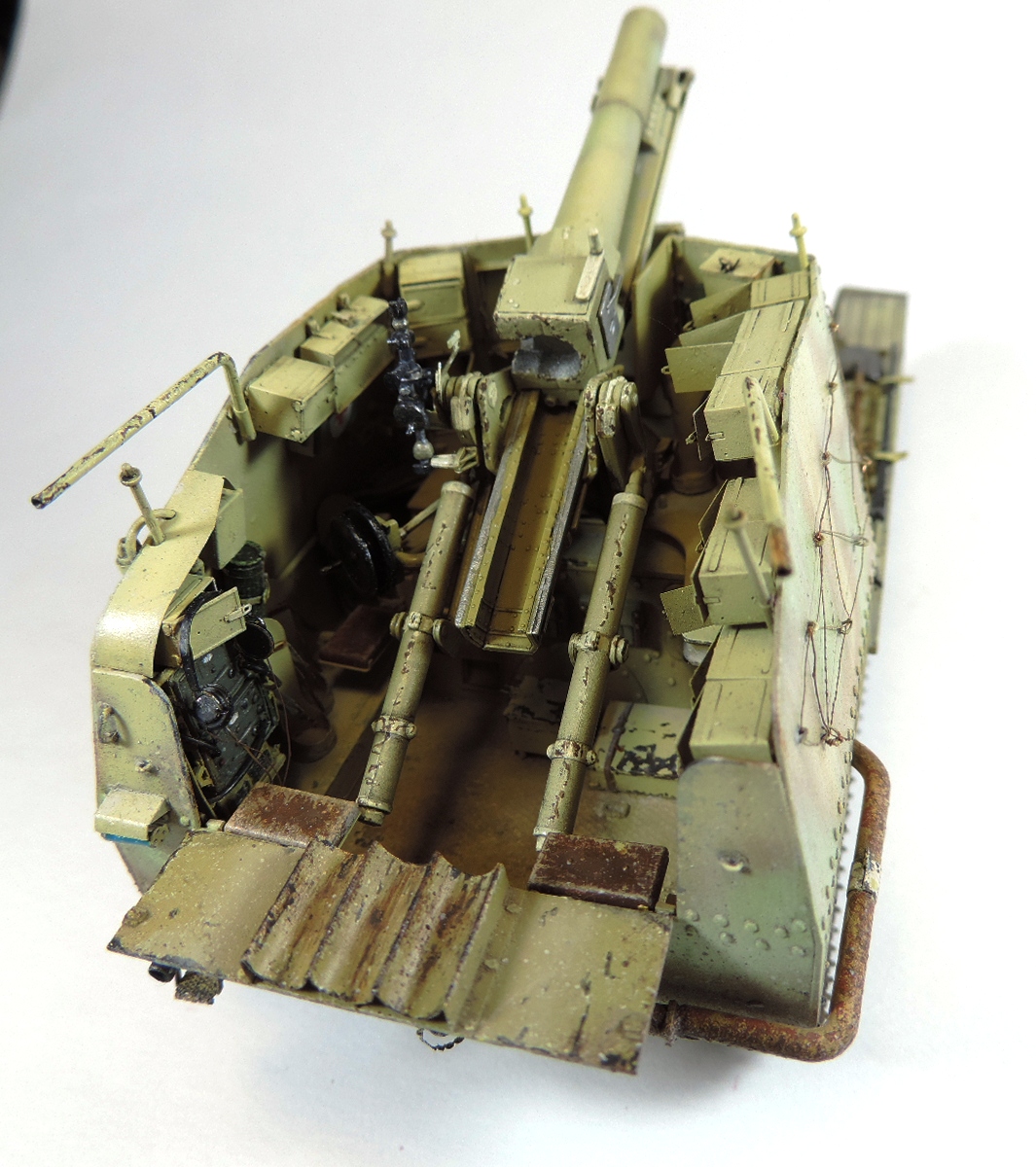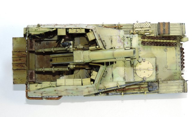 Спасибо. Иногда я довольно таки не аккуратен и ленив, ну и слеповат. По поводу глушителя: помните было видео (по моему автор Mig Jimenez, с ягдтигром), где перед покраской глушителя автор наносил на него жидкую маску, я делал похоже. Нанес грунт (АК 180 Red Prime), потом местами жидкую маску, залил темно желтой, после удалил маску и нанес снова, залил светло желтым, удалил маску, ну и обработал жидкостью имитирующую ржавчину. Кстати, грунт мне не понравился, плохо держится.