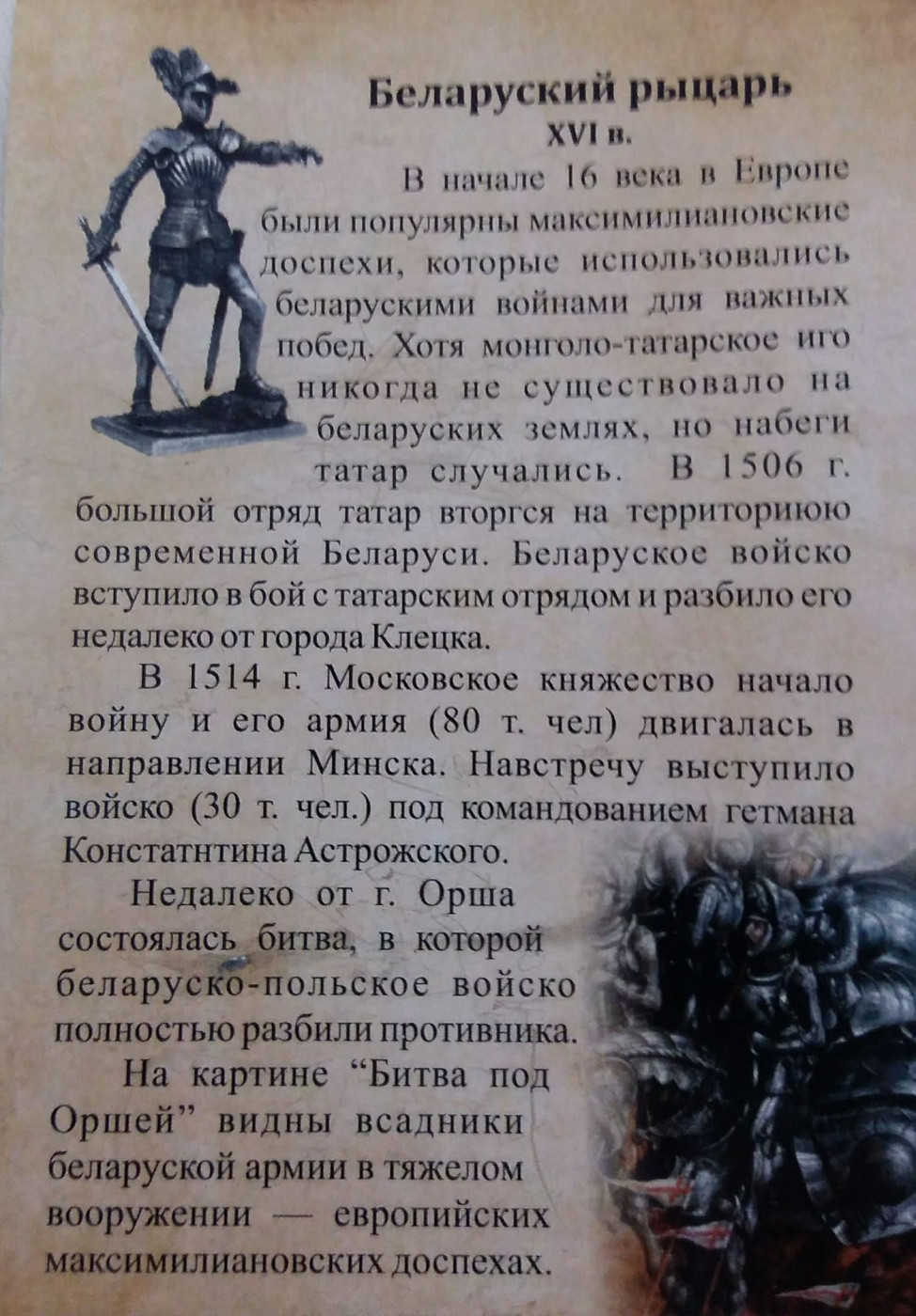 Фигура великолепна, историческая справка просто улет. Рыцарь-то в действительности литовский. Хотя бы потому, что предков нынешних белорусов тогда называли литвинами. Да и Константин Острожский был именно великим литовским гетманом.